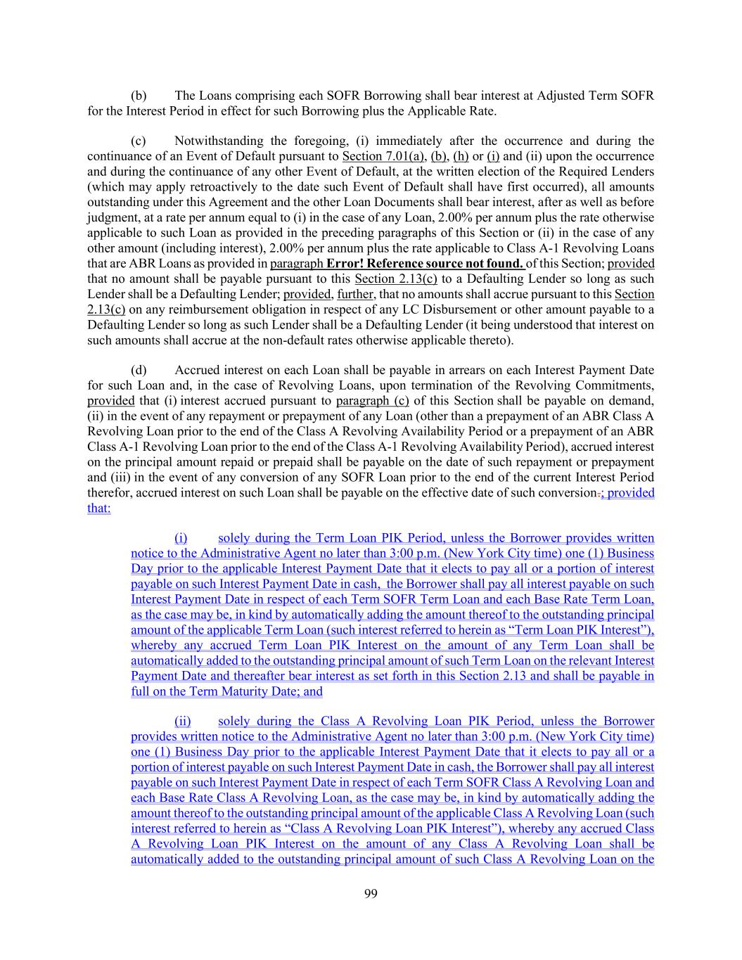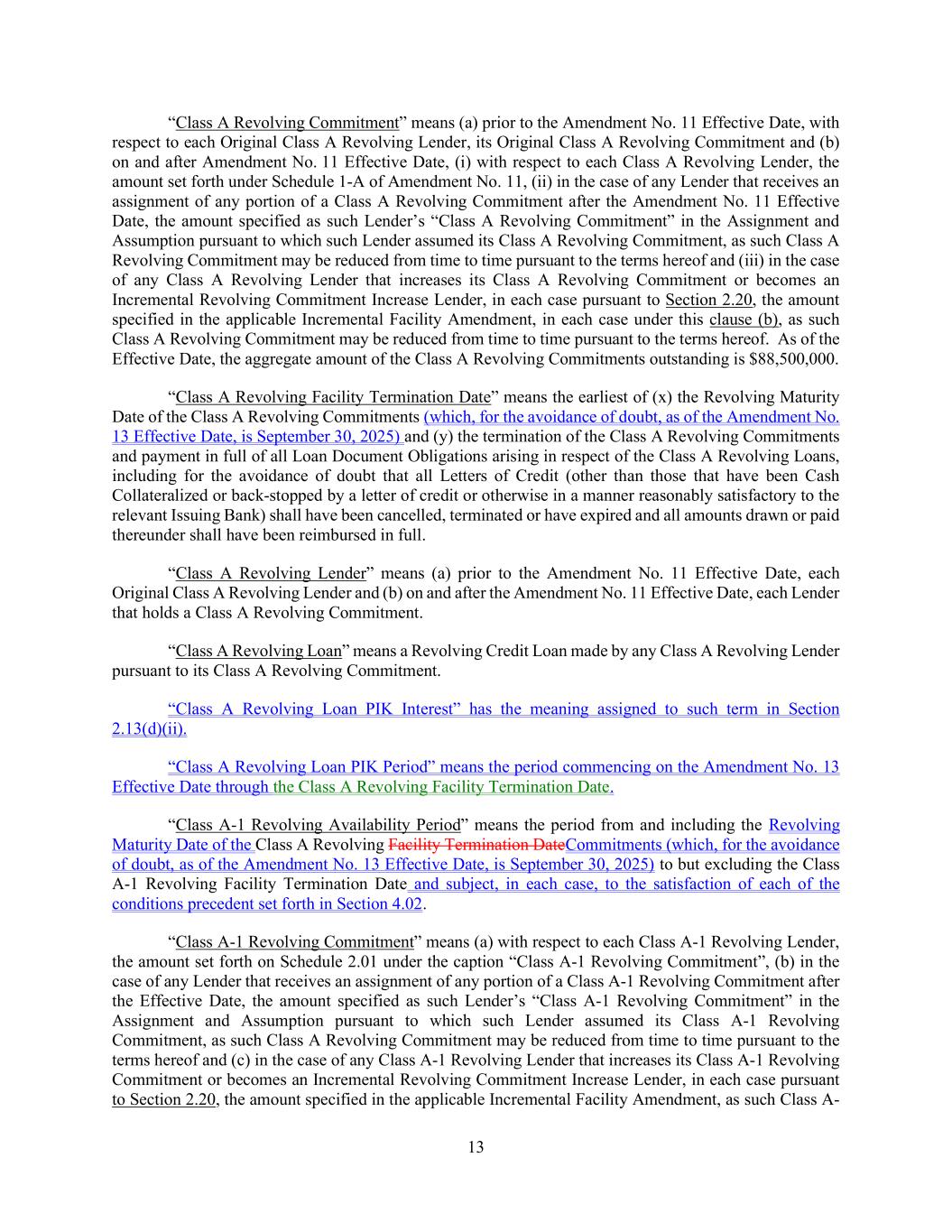 13 “Class A Revolving Commitment” means (a) prior to the Amendment No. 11 Effective Date, with respect to each Original Class A Revolving Lender, its Original Class A Revolving Commitment and (b) on and after Amendment No. 11 Effective Date, (i) with respect to each Class A Revolving Lender, the amount set forth under Schedule 1-A of Amendment No. 11, (ii) in the case of any Lender that receives an assignment of any portion of a Class A Revolving Commitment after the Amendment No. 11 Effective Date, the amount specified as such Lender’s “Class A Revolving Commitment” in the Assignment and Assumption pursuant to which such Lender assumed its Class A Revolving Commitment, as such Class A Revolving Commitment may be reduced from time to time pursuant to the terms hereof and (iii) in the case of any Class A Revolving Lender that increases its Class A Revolving Commitment or becomes an Incremental Revolving Commitment Increase Lender, in each case pursuant to Section 2.20, the amount specified in the applicable Incremental Facility Amendment, in each case under this clause (b), as such Class A Revolving Commitment may be reduced from time to time pursuant to the terms hereof. As of the Effective Date, the aggregate amount of the Class A Revolving Commitments outstanding is $88,500,000. “Class A Revolving Facility Termination Date” means the earliest of (x) the Revolving Maturity Date of the Class A Revolving Commitments (which, for the avoidance of doubt, as of the Amendment No. 13 Effective Date, is September 30, 2025) and (y) the termination of the Class A Revolving Commitments and payment in full of all Loan Document Obligations arising in respect of the Class A Revolving Loans, including for the avoidance of doubt that all Letters of Credit (other than those that have been Cash Collateralized or back-stopped by a letter of credit or otherwise in a manner reasonably satisfactory to the relevant Issuing Bank) shall have been cancelled, terminated or have expired and all amounts drawn or paid thereunder shall have been reimbursed in full. “Class A Revolving Lender” means (a) prior to the Amendment No. 11 Effective Date, each Original Class A Revolving Lender and (b) on and after the Amendment No. 11 Effective Date, each Lender that holds a Class A Revolving Commitment. “Class A Revolving Loan” means a Revolving Credit Loan made by any Class A Revolving Lender pursuant to its Class A Revolving Commitment. “Class A Revolving Loan PIK Interest” has the meaning assigned to such term in Section 2.13(d)(ii). “Class A Revolving Loan PIK Period” means the period commencing on the Amendment No. 13 Effective Date through the Class A Revolving Facility Termination Date. “Class A-1 Revolving Availability Period” means the period from and including the Revolving Maturity Date of the Class A Revolving Facility Termination DateCommitments (which, for the avoidance of doubt, as of the Amendment No. 13 Effective Date, is September 30, 2025) to but excluding the Class A-1 Revolving Facility Termination Date and subject, in each case, to the satisfaction of each of the conditions precedent set forth in Section 4.02. “Class A-1 Revolving Commitment” means (a) with respect to each Class A-1 Revolving Lender, the amount set forth on Schedule 2.01 under the caption “Class A-1 Revolving Commitment”, (b) in the case of any Lender that receives an assignment of any portion of a Class A-1 Revolving Commitment after the Effective Date, the amount specified as such Lender’s “Class A-1 Revolving Commitment” in the Assignment and Assumption pursuant to which such Lender assumed its Class A-1 Revolving Commitment, as such Class A Revolving Commitment may be reduced from time to time pursuant to the terms hereof and (c) in the case of any Class A-1 Revolving Lender that increases its Class A-1 Revolving Commitment or becomes an Incremental Revolving Commitment Increase Lender, in each case pursuant to Section 2.20, the amount specified in the applicable Incremental Facility Amendment, as such Class A-