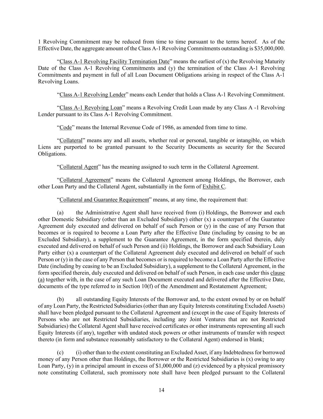 14 1 Revolving Commitment may be reduced from time to time pursuant to the terms hereof. As of the Effective Date, the aggregate amount of the Class A-1 Revolving Commitments outstanding is $35,000,000. “Class A-1 Revolving Facility Termination Date” means the earliest of (x) the Revolving Maturity Date of the Class A-1 Revolving Commitments and (y) the termination of the Class A-1 Revolving Commitments and payment in full of all Loan Document Obligations arising in respect of the Class A-1 Revolving Loans. “Class A-1 Revolving Lender” means each Lender that holds a Class A-1 Revolving Commitment. “Class A-1 Revolving Loan” means a Revolving Credit Loan made by any Class A -1 Revolving Lender pursuant to its Class A-1 Revolving Commitment. “Code” means the Internal Revenue Code of 1986, as amended from time to time. “Collateral” means any and all assets, whether real or personal, tangible or intangible, on which Liens are purported to be granted pursuant to the Security Documents as security for the Secured Obligations. “Collateral Agent” has the meaning assigned to such term in the Collateral Agreement. “Collateral Agreement” means the Collateral Agreement among Holdings, the Borrower, each other Loan Party and the Collateral Agent, substantially in the form of Exhibit C. “Collateral and Guarantee Requirement” means, at any time, the requirement that: (a) the Administrative Agent shall have received from (i) Holdings, the Borrower and each other Domestic Subsidiary (other than an Excluded Subsidiary) either (x) a counterpart of the Guarantee Agreement duly executed and delivered on behalf of such Person or (y) in the case of any Person that becomes or is required to become a Loan Party after the Effective Date (including by ceasing to be an Excluded Subsidiary), a supplement to the Guarantee Agreement, in the form specified therein, duly executed and delivered on behalf of such Person and (ii) Holdings, the Borrower and each Subsidiary Loan Party either (x) a counterpart of the Collateral Agreement duly executed and delivered on behalf of such Person or (y) in the case of any Person that becomes or is required to become a Loan Party after the Effective Date (including by ceasing to be an Excluded Subsidiary), a supplement to the Collateral Agreement, in the form specified therein, duly executed and delivered on behalf of such Person, in each case under this clause (a) together with, in the case of any such Loan Document executed and delivered after the Effective Date, documents of the type referred to in Section 10(f) of the Amendment and Restatement Agreement; (b) all outstanding Equity Interests of the Borrower and, to the extent owned by or on behalf of any Loan Party, the Restricted Subsidiaries (other than any Equity Interests constituting Excluded Assets) shall have been pledged pursuant to the Collateral Agreement and (except in the case of Equity Interests of Persons who are not Restricted Subsidiaries, including any Joint Ventures that are not Restricted Subsidiaries) the Collateral Agent shall have received certificates or other instruments representing all such Equity Interests (if any), together with undated stock powers or other instruments of transfer with respect thereto (in form and substance reasonably satisfactory to the Collateral Agent) endorsed in blank; (c) (i) other than to the extent constituting an Excluded Asset, if any Indebtedness for borrowed money of any Person other than Holdings, the Borrower or the Restricted Subsidiaries is (x) owing to any Loan Party, (y) in a principal amount in excess of $1,000,000 and (z) evidenced by a physical promissory note constituting Collateral, such promissory note shall have been pledged pursuant to the Collateral