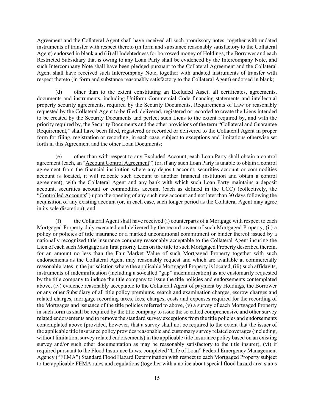 15 Agreement and the Collateral Agent shall have received all such promissory notes, together with undated instruments of transfer with respect thereto (in form and substance reasonably satisfactory to the Collateral Agent) endorsed in blank and (ii) all Indebtedness for borrowed money of Holdings, the Borrower and each Restricted Subsidiary that is owing to any Loan Party shall be evidenced by the Intercompany Note, and such Intercompany Note shall have been pledged pursuant to the Collateral Agreement and the Collateral Agent shall have received such Intercompany Note, together with undated instruments of transfer with respect thereto (in form and substance reasonably satisfactory to the Collateral Agent) endorsed in blank; (d) other than to the extent constituting an Excluded Asset, all certificates, agreements, documents and instruments, including Uniform Commercial Code financing statements and intellectual property security agreements, required by the Security Documents, Requirements of Law or reasonably requested by the Collateral Agent to be filed, delivered, registered or recorded to create the Liens intended to be created by the Security Documents and perfect such Liens to the extent required by, and with the priority required by, the Security Documents and the other provisions of the term “Collateral and Guarantee Requirement,” shall have been filed, registered or recorded or delivered to the Collateral Agent in proper form for filing, registration or recording, in each case, subject to exceptions and limitations otherwise set forth in this Agreement and the other Loan Documents; (e) other than with respect to any Excluded Account, each Loan Party shall obtain a control agreement (each, an “Account Control Agreement”) (or, if any such Loan Party is unable to obtain a control agreement from the financial institution where any deposit account, securities account or commodities account is located, it will relocate such account to another financial institution and obtain a control agreement), with the Collateral Agent and any bank with which such Loan Party maintains a deposit account, securities account or commodities account (each as defined in the UCC) (collectively, the “Controlled Accounts”) upon the opening of any such new account and not later than 30 days following the acquisition of any existing account (or, in each case, such longer period as the Collateral Agent may agree in its sole discretion); and (f) the Collateral Agent shall have received (i) counterparts of a Mortgage with respect to each Mortgaged Property duly executed and delivered by the record owner of such Mortgaged Property, (ii) a policy or policies of title insurance or a marked unconditional commitment or binder thereof issued by a nationally recognized title insurance company reasonably acceptable to the Collateral Agent insuring the Lien of each such Mortgage as a first priority Lien on the title to such Mortgaged Property described therein, for an amount no less than the Fair Market Value of such Mortgaged Property together with such endorsements as the Collateral Agent may reasonably request and which are available at commercially reasonable rates in the jurisdiction where the applicable Mortgaged Property is located, (iii) such affidavits, instruments of indemnification (including a so-called “gap” indemnification) as are customarily requested by the title company to induce the title company to issue the title policies and endorsements contemplated above, (iv) evidence reasonably acceptable to the Collateral Agent of payment by Holdings, the Borrower or any other Subsidiary of all title policy premiums, search and examination charges, escrow charges and related charges, mortgage recording taxes, fees, charges, costs and expenses required for the recording of the Mortgages and issuance of the title policies referred to above, (v) a survey of each Mortgaged Property in such form as shall be required by the title company to issue the so called comprehensive and other survey related endorsements and to remove the standard survey exceptions from the title policies and endorsements contemplated above (provided, however, that a survey shall not be required to the extent that the issuer of the applicable title insurance policy provides reasonable and customary survey related coverages (including, without limitation, survey related endorsements) in the applicable title insurance policy based on an existing survey and/or such other documentation as may be reasonably satisfactory to the title insurer), (vi) if required pursuant to the Flood Insurance Laws, completed “Life of Loan” Federal Emergency Management Agency (“FEMA”) Standard Flood Hazard Determination with respect to each Mortgaged Property subject to the applicable FEMA rules and regulations (together with a notice about special flood hazard area status