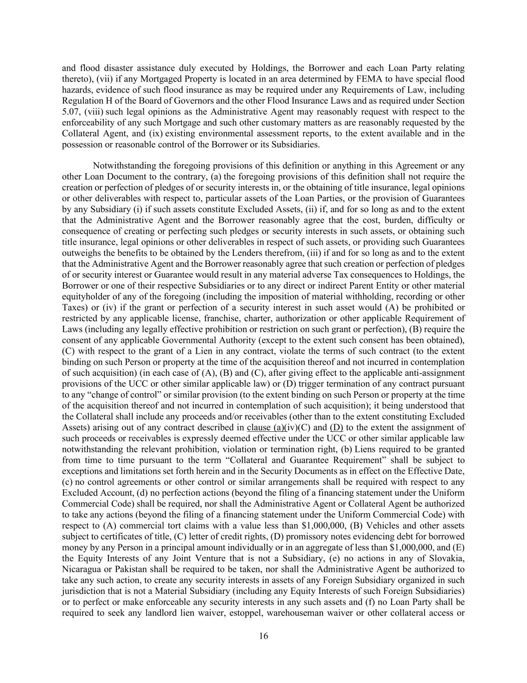 16 and flood disaster assistance duly executed by Holdings, the Borrower and each Loan Party relating thereto), (vii) if any Mortgaged Property is located in an area determined by FEMA to have special flood hazards, evidence of such flood insurance as may be required under any Requirements of Law, including Regulation H of the Board of Governors and the other Flood Insurance Laws and as required under Section 5.07, (viii) such legal opinions as the Administrative Agent may reasonably request with respect to the enforceability of any such Mortgage and such other customary matters as are reasonably requested by the Collateral Agent, and (ix) existing environmental assessment reports, to the extent available and in the possession or reasonable control of the Borrower or its Subsidiaries. Notwithstanding the foregoing provisions of this definition or anything in this Agreement or any other Loan Document to the contrary, (a) the foregoing provisions of this definition shall not require the creation or perfection of pledges of or security interests in, or the obtaining of title insurance, legal opinions or other deliverables with respect to, particular assets of the Loan Parties, or the provision of Guarantees by any Subsidiary (i) if such assets constitute Excluded Assets, (ii) if, and for so long as and to the extent that the Administrative Agent and the Borrower reasonably agree that the cost, burden, difficulty or consequence of creating or perfecting such pledges or security interests in such assets, or obtaining such title insurance, legal opinions or other deliverables in respect of such assets, or providing such Guarantees outweighs the benefits to be obtained by the Lenders therefrom, (iii) if and for so long as and to the extent that the Administrative Agent and the Borrower reasonably agree that such creation or perfection of pledges of or security interest or Guarantee would result in any material adverse Tax consequences to Holdings, the Borrower or one of their respective Subsidiaries or to any direct or indirect Parent Entity or other material equityholder of any of the foregoing (including the imposition of material withholding, recording or other Taxes) or (iv) if the grant or perfection of a security interest in such asset would (A) be prohibited or restricted by any applicable license, franchise, charter, authorization or other applicable Requirement of Laws (including any legally effective prohibition or restriction on such grant or perfection), (B) require the consent of any applicable Governmental Authority (except to the extent such consent has been obtained), (C) with respect to the grant of a Lien in any contract, violate the terms of such contract (to the extent binding on such Person or property at the time of the acquisition thereof and not incurred in contemplation of such acquisition) (in each case of (A), (B) and (C), after giving effect to the applicable anti-assignment provisions of the UCC or other similar applicable law) or (D) trigger termination of any contract pursuant to any “change of control” or similar provision (to the extent binding on such Person or property at the time of the acquisition thereof and not incurred in contemplation of such acquisition); it being understood that the Collateral shall include any proceeds and/or receivables (other than to the extent constituting Excluded Assets) arising out of any contract described in clause (a)(iv)(C) and (D) to the extent the assignment of such proceeds or receivables is expressly deemed effective under the UCC or other similar applicable law notwithstanding the relevant prohibition, violation or termination right, (b) Liens required to be granted from time to time pursuant to the term “Collateral and Guarantee Requirement” shall be subject to exceptions and limitations set forth herein and in the Security Documents as in effect on the Effective Date, (c) no control agreements or other control or similar arrangements shall be required with respect to any Excluded Account, (d) no perfection actions (beyond the filing of a financing statement under the Uniform Commercial Code) shall be required, nor shall the Administrative Agent or Collateral Agent be authorized to take any actions (beyond the filing of a financing statement under the Uniform Commercial Code) with respect to (A) commercial tort claims with a value less than $1,000,000, (B) Vehicles and other assets subject to certificates of title, (C) letter of credit rights, (D) promissory notes evidencing debt for borrowed money by any Person in a principal amount individually or in an aggregate of less than $1,000,000, and (E) the Equity Interests of any Joint Venture that is not a Subsidiary, (e) no actions in any of Slovakia, Nicaragua or Pakistan shall be required to be taken, nor shall the Administrative Agent be authorized to take any such action, to create any security interests in assets of any Foreign Subsidiary organized in such jurisdiction that is not a Material Subsidiary (including any Equity Interests of such Foreign Subsidiaries) or to perfect or make enforceable any security interests in any such assets and (f) no Loan Party shall be required to seek any landlord lien waiver, estoppel, warehouseman waiver or other collateral access or