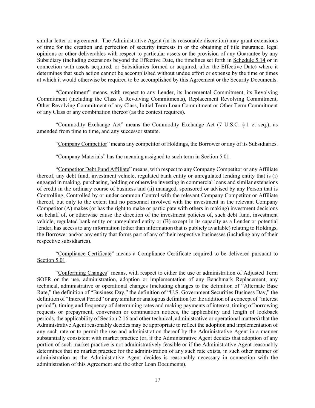17 similar letter or agreement. The Administrative Agent (in its reasonable discretion) may grant extensions of time for the creation and perfection of security interests in or the obtaining of title insurance, legal opinions or other deliverables with respect to particular assets or the provision of any Guarantee by any Subsidiary (including extensions beyond the Effective Date, the timelines set forth in Schedule 5.14 or in connection with assets acquired, or Subsidiaries formed or acquired, after the Effective Date) where it determines that such action cannot be accomplished without undue effort or expense by the time or times at which it would otherwise be required to be accomplished by this Agreement or the Security Documents. “Commitment” means, with respect to any Lender, its Incremental Commitment, its Revolving Commitment (including the Class A Revolving Commitments), Replacement Revolving Commitment, Other Revolving Commitment of any Class, Initial Term Loan Commitment or Other Term Commitment of any Class or any combination thereof (as the context requires). “Commodity Exchange Act” means the Commodity Exchange Act (7 U.S.C. § 1 et seq.), as amended from time to time, and any successor statute. “Company Competitor” means any competitor of Holdings, the Borrower or any of its Subsidiaries. “Company Materials” has the meaning assigned to such term in Section 5.01. “Competitor Debt Fund Affiliate” means, with respect to any Company Competitor or any Affiliate thereof, any debt fund, investment vehicle, regulated bank entity or unregulated lending entity that is (i) engaged in making, purchasing, holding or otherwise investing in commercial loans and similar extensions of credit in the ordinary course of business and (ii) managed, sponsored or advised by any Person that is Controlling, Controlled by or under common Control with the relevant Company Competitor or Affiliate thereof, but only to the extent that no personnel involved with the investment in the relevant Company Competitor (A) makes (or has the right to make or participate with others in making) investment decisions on behalf of, or otherwise cause the direction of the investment policies of, such debt fund, investment vehicle, regulated bank entity or unregulated entity or (B) except in its capacity as a Lender or potential lender, has access to any information (other than information that is publicly available) relating to Holdings, the Borrower and/or any entity that forms part of any of their respective businesses (including any of their respective subsidiaries). “Compliance Certificate” means a Compliance Certificate required to be delivered pursuant to Section 5.01. “Conforming Changes” means, with respect to either the use or administration of Adjusted Term SOFR or the use, administration, adoption or implementation of any Benchmark Replacement, any technical, administrative or operational changes (including changes to the definition of “Alternate Base Rate,” the definition of “Business Day,” the definition of “U.S. Government Securities Business Day,” the definition of “Interest Period” or any similar or analogous definition (or the addition of a concept of “interest period”), timing and frequency of determining rates and making payments of interest, timing of borrowing requests or prepayment, conversion or continuation notices, the applicability and length of lookback periods, the applicability of Section 2.16 and other technical, administrative or operational matters) that the Administrative Agent reasonably decides may be appropriate to reflect the adoption and implementation of any such rate or to permit the use and administration thereof by the Administrative Agent in a manner substantially consistent with market practice (or, if the Administrative Agent decides that adoption of any portion of such market practice is not administratively feasible or if the Administrative Agent reasonably determines that no market practice for the administration of any such rate exists, in such other manner of administration as the Administrative Agent decides is reasonably necessary in connection with the administration of this Agreement and the other Loan Documents).