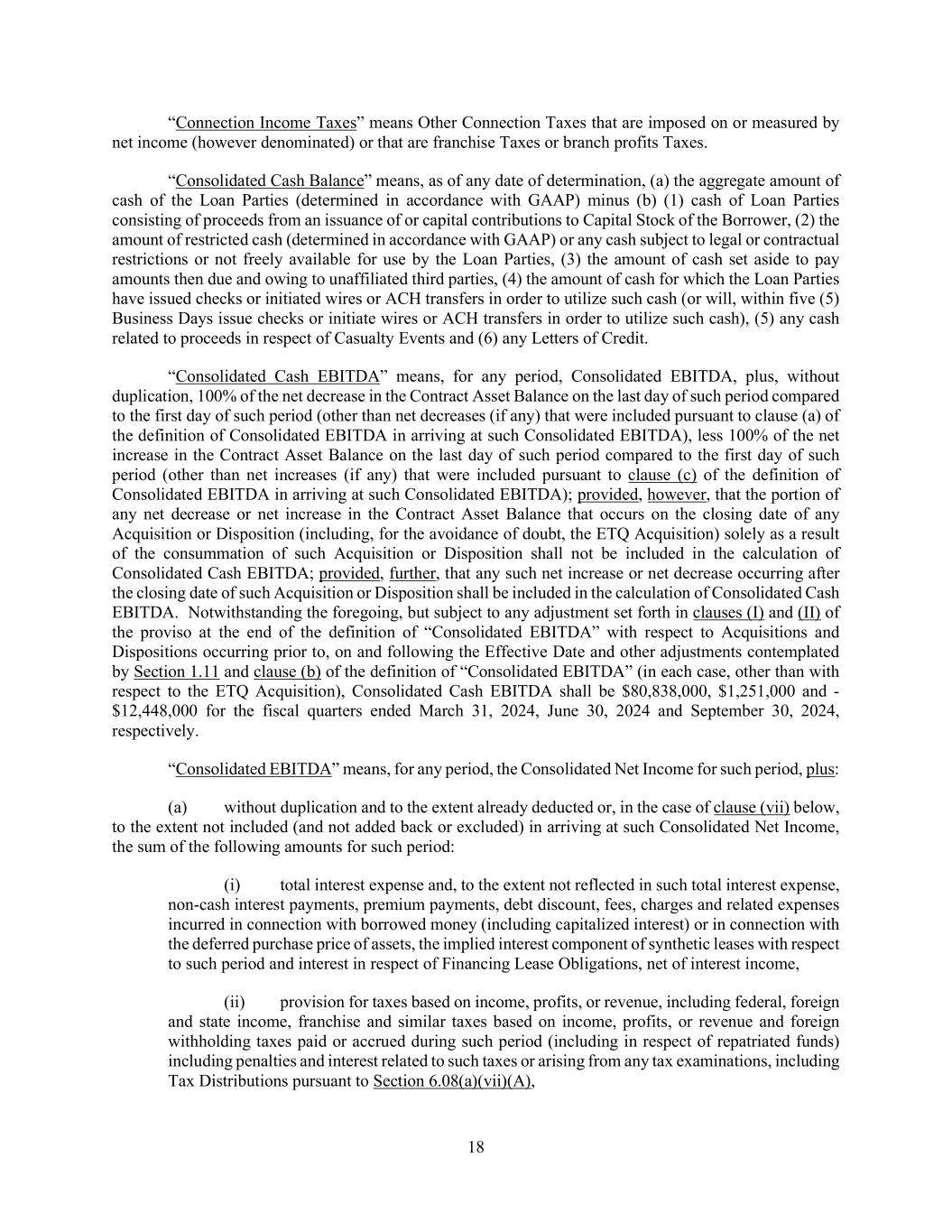 18 “Connection Income Taxes” means Other Connection Taxes that are imposed on or measured by net income (however denominated) or that are franchise Taxes or branch profits Taxes. “Consolidated Cash Balance” means, as of any date of determination, (a) the aggregate amount of cash of the Loan Parties (determined in accordance with GAAP) minus (b) (1) cash of Loan Parties consisting of proceeds from an issuance of or capital contributions to Capital Stock of the Borrower, (2) the amount of restricted cash (determined in accordance with GAAP) or any cash subject to legal or contractual restrictions or not freely available for use by the Loan Parties, (3) the amount of cash set aside to pay amounts then due and owing to unaffiliated third parties, (4) the amount of cash for which the Loan Parties have issued checks or initiated wires or ACH transfers in order to utilize such cash (or will, within five (5) Business Days issue checks or initiate wires or ACH transfers in order to utilize such cash), (5) any cash related to proceeds in respect of Casualty Events and (6) any Letters of Credit. “Consolidated Cash EBITDA” means, for any period, Consolidated EBITDA, plus, without duplication, 100% of the net decrease in the Contract Asset Balance on the last day of such period compared to the first day of such period (other than net decreases (if any) that were included pursuant to clause (a) of the definition of Consolidated EBITDA in arriving at such Consolidated EBITDA), less 100% of the net increase in the Contract Asset Balance on the last day of such period compared to the first day of such period (other than net increases (if any) that were included pursuant to clause (c) of the definition of Consolidated EBITDA in arriving at such Consolidated EBITDA); provided, however, that the portion of any net decrease or net increase in the Contract Asset Balance that occurs on the closing date of any Acquisition or Disposition (including, for the avoidance of doubt, the ETQ Acquisition) solely as a result of the consummation of such Acquisition or Disposition shall not be included in the calculation of Consolidated Cash EBITDA; provided, further, that any such net increase or net decrease occurring after the closing date of such Acquisition or Disposition shall be included in the calculation of Consolidated Cash EBITDA. Notwithstanding the foregoing, but subject to any adjustment set forth in clauses (I) and (II) of the proviso at the end of the definition of “Consolidated EBITDA” with respect to Acquisitions and Dispositions occurring prior to, on and following the Effective Date and other adjustments contemplated by Section 1.11 and clause (b) of the definition of “Consolidated EBITDA” (in each case, other than with respect to the ETQ Acquisition), Consolidated Cash EBITDA shall be $80,838,000, $1,251,000 and - $12,448,000 for the fiscal quarters ended March 31, 2024, June 30, 2024 and September 30, 2024, respectively. “Consolidated EBITDA” means, for any period, the Consolidated Net Income for such period, plus: (a) without duplication and to the extent already deducted or, in the case of clause (vii) below, to the extent not included (and not added back or excluded) in arriving at such Consolidated Net Income, the sum of the following amounts for such period: (i) total interest expense and, to the extent not reflected in such total interest expense, non-cash interest payments, premium payments, debt discount, fees, charges and related expenses incurred in connection with borrowed money (including capitalized interest) or in connection with the deferred purchase price of assets, the implied interest component of synthetic leases with respect to such period and interest in respect of Financing Lease Obligations, net of interest income, (ii) provision for taxes based on income, profits, or revenue, including federal, foreign and state income, franchise and similar taxes based on income, profits, or revenue and foreign withholding taxes paid or accrued during such period (including in respect of repatriated funds) including penalties and interest related to such taxes or arising from any tax examinations, including Tax Distributions pursuant to Section 6.08(a)(vii)(A),