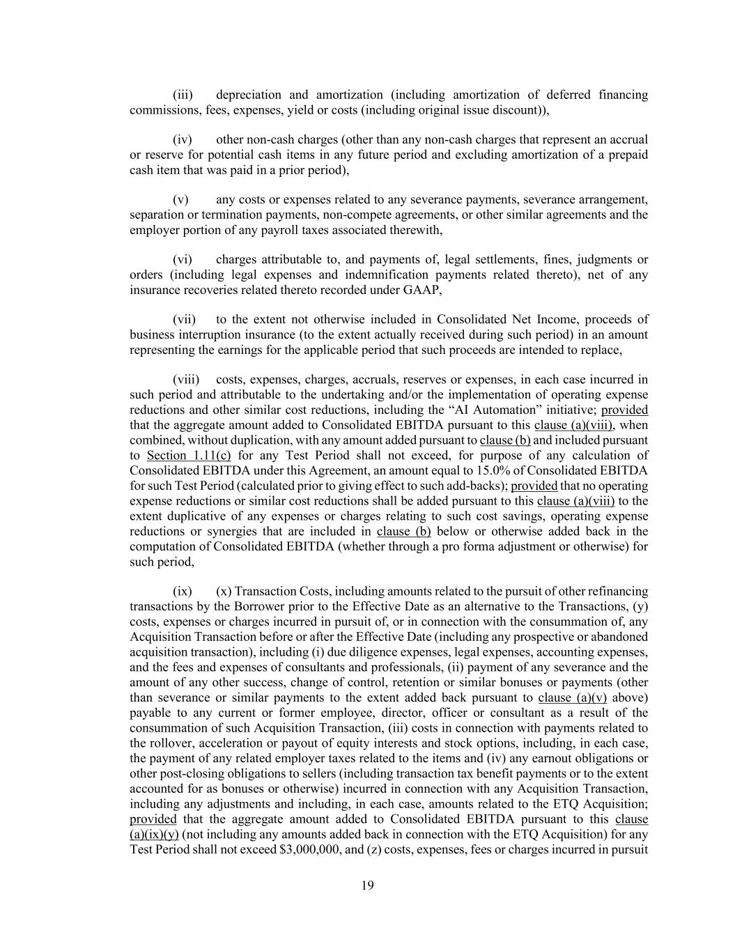 19 (iii) depreciation and amortization (including amortization of deferred financing commissions, fees, expenses, yield or costs (including original issue discount)), (iv) other non-cash charges (other than any non-cash charges that represent an accrual or reserve for potential cash items in any future period and excluding amortization of a prepaid cash item that was paid in a prior period), (v) any costs or expenses related to any severance payments, severance arrangement, separation or termination payments, non-compete agreements, or other similar agreements and the employer portion of any payroll taxes associated therewith, (vi) charges attributable to, and payments of, legal settlements, fines, judgments or orders (including legal expenses and indemnification payments related thereto), net of any insurance recoveries related thereto recorded under GAAP, (vii) to the extent not otherwise included in Consolidated Net Income, proceeds of business interruption insurance (to the extent actually received during such period) in an amount representing the earnings for the applicable period that such proceeds are intended to replace, (viii) costs, expenses, charges, accruals, reserves or expenses, in each case incurred in such period and attributable to the undertaking and/or the implementation of operating expense reductions and other similar cost reductions, including the “AI Automation” initiative; provided that the aggregate amount added to Consolidated EBITDA pursuant to this clause (a)(viii), when combined, without duplication, with any amount added pursuant to clause (b) and included pursuant to Section 1.11(c) for any Test Period shall not exceed, for purpose of any calculation of Consolidated EBITDA under this Agreement, an amount equal to 15.0% of Consolidated EBITDA for such Test Period (calculated prior to giving effect to such add-backs); provided that no operating expense reductions or similar cost reductions shall be added pursuant to this clause (a)(viii) to the extent duplicative of any expenses or charges relating to such cost savings, operating expense reductions or synergies that are included in clause (b) below or otherwise added back in the computation of Consolidated EBITDA (whether through a pro forma adjustment or otherwise) for such period, (ix) (x) Transaction Costs, including amounts related to the pursuit of other refinancing transactions by the Borrower prior to the Effective Date as an alternative to the Transactions, (y) costs, expenses or charges incurred in pursuit of, or in connection with the consummation of, any Acquisition Transaction before or after the Effective Date (including any prospective or abandoned acquisition transaction), including (i) due diligence expenses, legal expenses, accounting expenses, and the fees and expenses of consultants and professionals, (ii) payment of any severance and the amount of any other success, change of control, retention or similar bonuses or payments (other than severance or similar payments to the extent added back pursuant to clause (a)(v) above) payable to any current or former employee, director, officer or consultant as a result of the consummation of such Acquisition Transaction, (iii) costs in connection with payments related to the rollover, acceleration or payout of equity interests and stock options, including, in each case, the payment of any related employer taxes related to the items and (iv) any earnout obligations or other post-closing obligations to sellers (including transaction tax benefit payments or to the extent accounted for as bonuses or otherwise) incurred in connection with any Acquisition Transaction, including any adjustments and including, in each case, amounts related to the ETQ Acquisition; provided that the aggregate amount added to Consolidated EBITDA pursuant to this clause (a)(ix)(y) (not including any amounts added back in connection with the ETQ Acquisition) for any Test Period shall not exceed $3,000,000, and (z) costs, expenses, fees or charges incurred in pursuit
