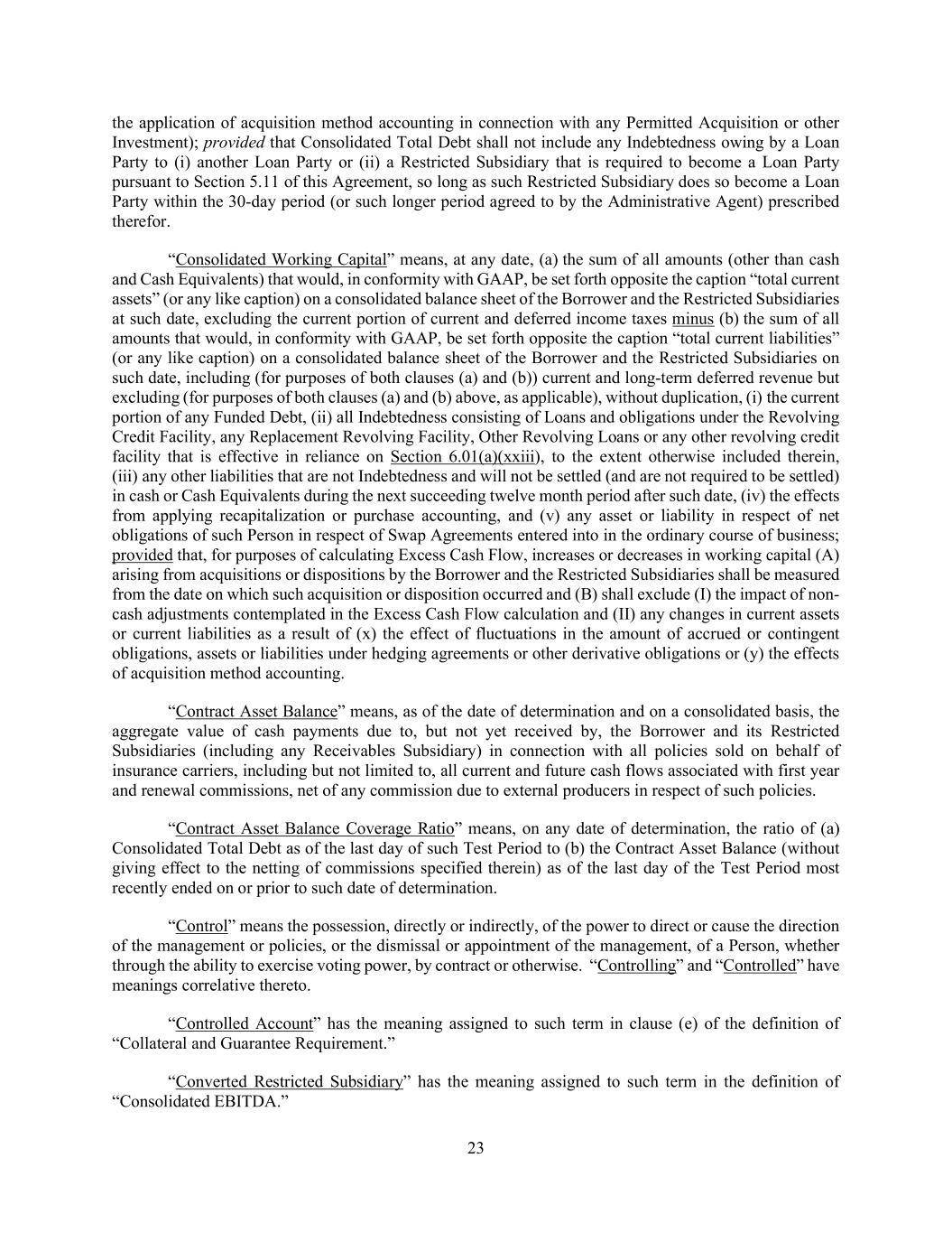 23 the application of acquisition method accounting in connection with any Permitted Acquisition or other Investment); provided that Consolidated Total Debt shall not include any Indebtedness owing by a Loan Party to (i) another Loan Party or (ii) a Restricted Subsidiary that is required to become a Loan Party pursuant to Section 5.11 of this Agreement, so long as such Restricted Subsidiary does so become a Loan Party within the 30-day period (or such longer period agreed to by the Administrative Agent) prescribed therefor. “Consolidated Working Capital” means, at any date, (a) the sum of all amounts (other than cash and Cash Equivalents) that would, in conformity with GAAP, be set forth opposite the caption “total current assets” (or any like caption) on a consolidated balance sheet of the Borrower and the Restricted Subsidiaries at such date, excluding the current portion of current and deferred income taxes minus (b) the sum of all amounts that would, in conformity with GAAP, be set forth opposite the caption “total current liabilities” (or any like caption) on a consolidated balance sheet of the Borrower and the Restricted Subsidiaries on such date, including (for purposes of both clauses (a) and (b)) current and long-term deferred revenue but excluding (for purposes of both clauses (a) and (b) above, as applicable), without duplication, (i) the current portion of any Funded Debt, (ii) all Indebtedness consisting of Loans and obligations under the Revolving Credit Facility, any Replacement Revolving Facility, Other Revolving Loans or any other revolving credit facility that is effective in reliance on Section 6.01(a)(xxiii), to the extent otherwise included therein, (iii) any other liabilities that are not Indebtedness and will not be settled (and are not required to be settled) in cash or Cash Equivalents during the next succeeding twelve month period after such date, (iv) the effects from applying recapitalization or purchase accounting, and (v) any asset or liability in respect of net obligations of such Person in respect of Swap Agreements entered into in the ordinary course of business; provided that, for purposes of calculating Excess Cash Flow, increases or decreases in working capital (A) arising from acquisitions or dispositions by the Borrower and the Restricted Subsidiaries shall be measured from the date on which such acquisition or disposition occurred and (B) shall exclude (I) the impact of non- cash adjustments contemplated in the Excess Cash Flow calculation and (II) any changes in current assets or current liabilities as a result of (x) the effect of fluctuations in the amount of accrued or contingent obligations, assets or liabilities under hedging agreements or other derivative obligations or (y) the effects of acquisition method accounting. “Contract Asset Balance” means, as of the date of determination and on a consolidated basis, the aggregate value of cash payments due to, but not yet received by, the Borrower and its Restricted Subsidiaries (including any Receivables Subsidiary) in connection with all policies sold on behalf of insurance carriers, including but not limited to, all current and future cash flows associated with first year and renewal commissions, net of any commission due to external producers in respect of such policies. “Contract Asset Balance Coverage Ratio” means, on any date of determination, the ratio of (a) Consolidated Total Debt as of the last day of such Test Period to (b) the Contract Asset Balance (without giving effect to the netting of commissions specified therein) as of the last day of the Test Period most recently ended on or prior to such date of determination. “Control” means the possession, directly or indirectly, of the power to direct or cause the direction of the management or policies, or the dismissal or appointment of the management, of a Person, whether through the ability to exercise voting power, by contract or otherwise. “Controlling” and “Controlled” have meanings correlative thereto. “Controlled Account” has the meaning assigned to such term in clause (e) of the definition of “Collateral and Guarantee Requirement.” “Converted Restricted Subsidiary” has the meaning assigned to such term in the definition of “Consolidated EBITDA.”