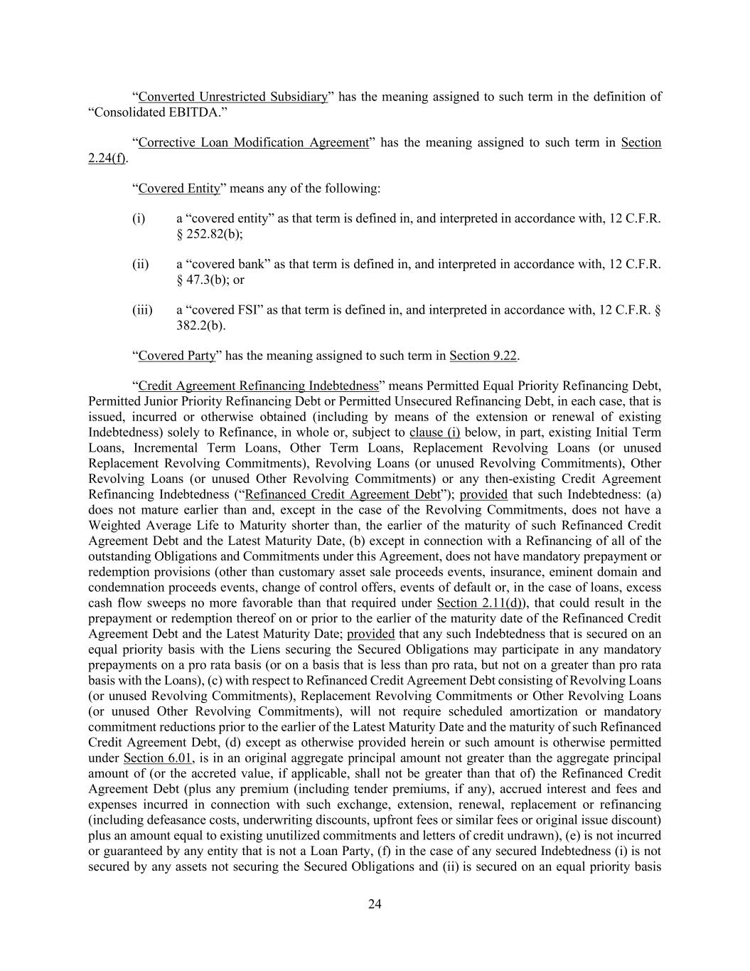 24 “Converted Unrestricted Subsidiary” has the meaning assigned to such term in the definition of “Consolidated EBITDA.” “Corrective Loan Modification Agreement” has the meaning assigned to such term in Section 2.24(f). “Covered Entity” means any of the following: (i) a “covered entity” as that term is defined in, and interpreted in accordance with, 12 C.F.R. § 252.82(b); (ii) a “covered bank” as that term is defined in, and interpreted in accordance with, 12 C.F.R. § 47.3(b); or (iii) a “covered FSI” as that term is defined in, and interpreted in accordance with, 12 C.F.R. § 382.2(b). “Covered Party” has the meaning assigned to such term in Section 9.22. “Credit Agreement Refinancing Indebtedness” means Permitted Equal Priority Refinancing Debt, Permitted Junior Priority Refinancing Debt or Permitted Unsecured Refinancing Debt, in each case, that is issued, incurred or otherwise obtained (including by means of the extension or renewal of existing Indebtedness) solely to Refinance, in whole or, subject to clause (i) below, in part, existing Initial Term Loans, Incremental Term Loans, Other Term Loans, Replacement Revolving Loans (or unused Replacement Revolving Commitments), Revolving Loans (or unused Revolving Commitments), Other Revolving Loans (or unused Other Revolving Commitments) or any then-existing Credit Agreement Refinancing Indebtedness (“Refinanced Credit Agreement Debt”); provided that such Indebtedness: (a) does not mature earlier than and, except in the case of the Revolving Commitments, does not have a Weighted Average Life to Maturity shorter than, the earlier of the maturity of such Refinanced Credit Agreement Debt and the Latest Maturity Date, (b) except in connection with a Refinancing of all of the outstanding Obligations and Commitments under this Agreement, does not have mandatory prepayment or redemption provisions (other than customary asset sale proceeds events, insurance, eminent domain and condemnation proceeds events, change of control offers, events of default or, in the case of loans, excess cash flow sweeps no more favorable than that required under Section 2.11(d)), that could result in the prepayment or redemption thereof on or prior to the earlier of the maturity date of the Refinanced Credit Agreement Debt and the Latest Maturity Date; provided that any such Indebtedness that is secured on an equal priority basis with the Liens securing the Secured Obligations may participate in any mandatory prepayments on a pro rata basis (or on a basis that is less than pro rata, but not on a greater than pro rata basis with the Loans), (c) with respect to Refinanced Credit Agreement Debt consisting of Revolving Loans (or unused Revolving Commitments), Replacement Revolving Commitments or Other Revolving Loans (or unused Other Revolving Commitments), will not require scheduled amortization or mandatory commitment reductions prior to the earlier of the Latest Maturity Date and the maturity of such Refinanced Credit Agreement Debt, (d) except as otherwise provided herein or such amount is otherwise permitted under Section 6.01, is in an original aggregate principal amount not greater than the aggregate principal amount of (or the accreted value, if applicable, shall not be greater than that of) the Refinanced Credit Agreement Debt (plus any premium (including tender premiums, if any), accrued interest and fees and expenses incurred in connection with such exchange, extension, renewal, replacement or refinancing (including defeasance costs, underwriting discounts, upfront fees or similar fees or original issue discount) plus an amount equal to existing unutilized commitments and letters of credit undrawn), (e) is not incurred or guaranteed by any entity that is not a Loan Party, (f) in the case of any secured Indebtedness (i) is not secured by any assets not securing the Secured Obligations and (ii) is secured on an equal priority basis
