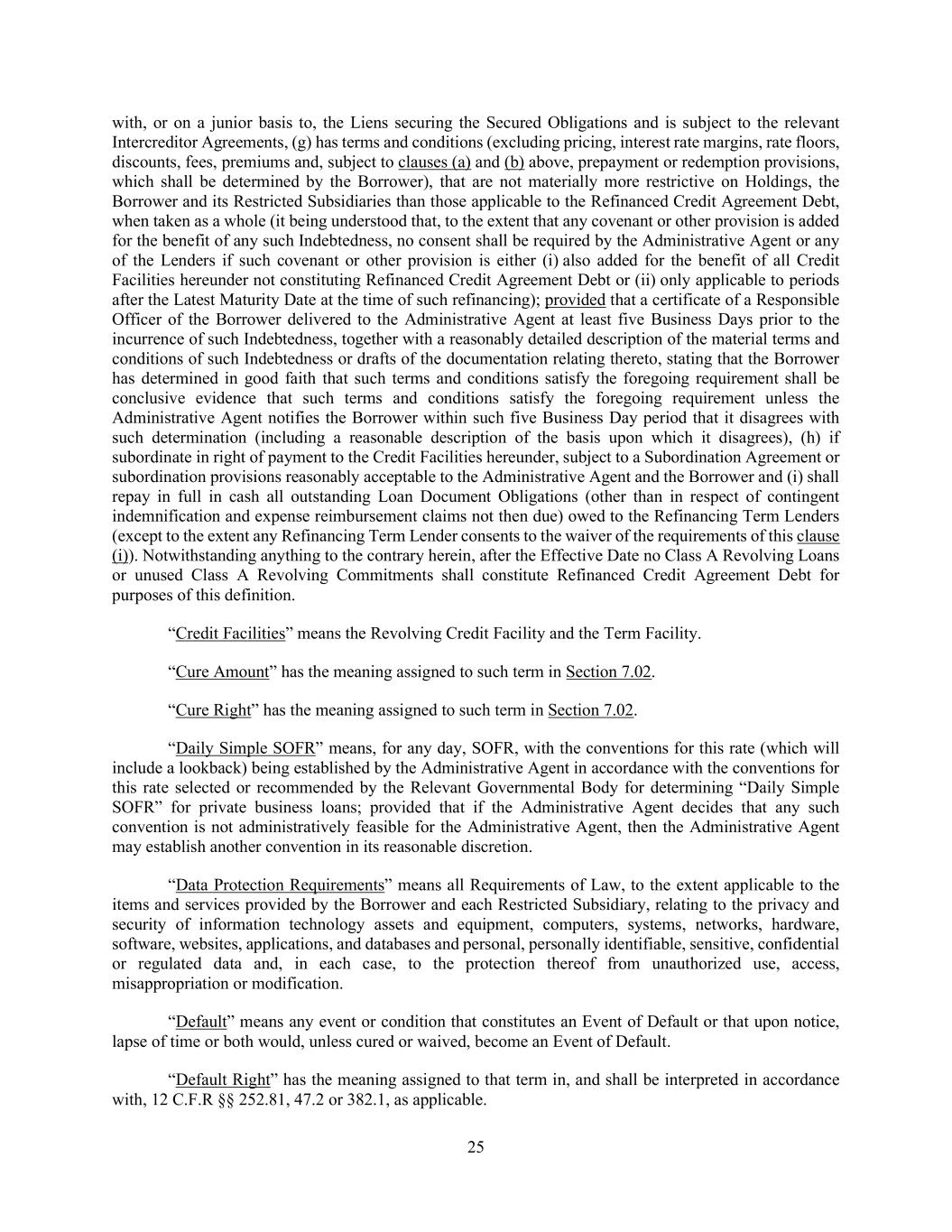 25 with, or on a junior basis to, the Liens securing the Secured Obligations and is subject to the relevant Intercreditor Agreements, (g) has terms and conditions (excluding pricing, interest rate margins, rate floors, discounts, fees, premiums and, subject to clauses (a) and (b) above, prepayment or redemption provisions, which shall be determined by the Borrower), that are not materially more restrictive on Holdings, the Borrower and its Restricted Subsidiaries than those applicable to the Refinanced Credit Agreement Debt, when taken as a whole (it being understood that, to the extent that any covenant or other provision is added for the benefit of any such Indebtedness, no consent shall be required by the Administrative Agent or any of the Lenders if such covenant or other provision is either (i) also added for the benefit of all Credit Facilities hereunder not constituting Refinanced Credit Agreement Debt or (ii) only applicable to periods after the Latest Maturity Date at the time of such refinancing); provided that a certificate of a Responsible Officer of the Borrower delivered to the Administrative Agent at least five Business Days prior to the incurrence of such Indebtedness, together with a reasonably detailed description of the material terms and conditions of such Indebtedness or drafts of the documentation relating thereto, stating that the Borrower has determined in good faith that such terms and conditions satisfy the foregoing requirement shall be conclusive evidence that such terms and conditions satisfy the foregoing requirement unless the Administrative Agent notifies the Borrower within such five Business Day period that it disagrees with such determination (including a reasonable description of the basis upon which it disagrees), (h) if subordinate in right of payment to the Credit Facilities hereunder, subject to a Subordination Agreement or subordination provisions reasonably acceptable to the Administrative Agent and the Borrower and (i) shall repay in full in cash all outstanding Loan Document Obligations (other than in respect of contingent indemnification and expense reimbursement claims not then due) owed to the Refinancing Term Lenders (except to the extent any Refinancing Term Lender consents to the waiver of the requirements of this clause (i)). Notwithstanding anything to the contrary herein, after the Effective Date no Class A Revolving Loans or unused Class A Revolving Commitments shall constitute Refinanced Credit Agreement Debt for purposes of this definition. “Credit Facilities” means the Revolving Credit Facility and the Term Facility. “Cure Amount” has the meaning assigned to such term in Section 7.02. “Cure Right” has the meaning assigned to such term in Section 7.02. “Daily Simple SOFR” means, for any day, SOFR, with the conventions for this rate (which will include a lookback) being established by the Administrative Agent in accordance with the conventions for this rate selected or recommended by the Relevant Governmental Body for determining “Daily Simple SOFR” for private business loans; provided that if the Administrative Agent decides that any such convention is not administratively feasible for the Administrative Agent, then the Administrative Agent may establish another convention in its reasonable discretion. “Data Protection Requirements” means all Requirements of Law, to the extent applicable to the items and services provided by the Borrower and each Restricted Subsidiary, relating to the privacy and security of information technology assets and equipment, computers, systems, networks, hardware, software, websites, applications, and databases and personal, personally identifiable, sensitive, confidential or regulated data and, in each case, to the protection thereof from unauthorized use, access, misappropriation or modification. “Default” means any event or condition that constitutes an Event of Default or that upon notice, lapse of time or both would, unless cured or waived, become an Event of Default. “Default Right” has the meaning assigned to that term in, and shall be interpreted in accordance with, 12 C.F.R §§ 252.81, 47.2 or 382.1, as applicable.