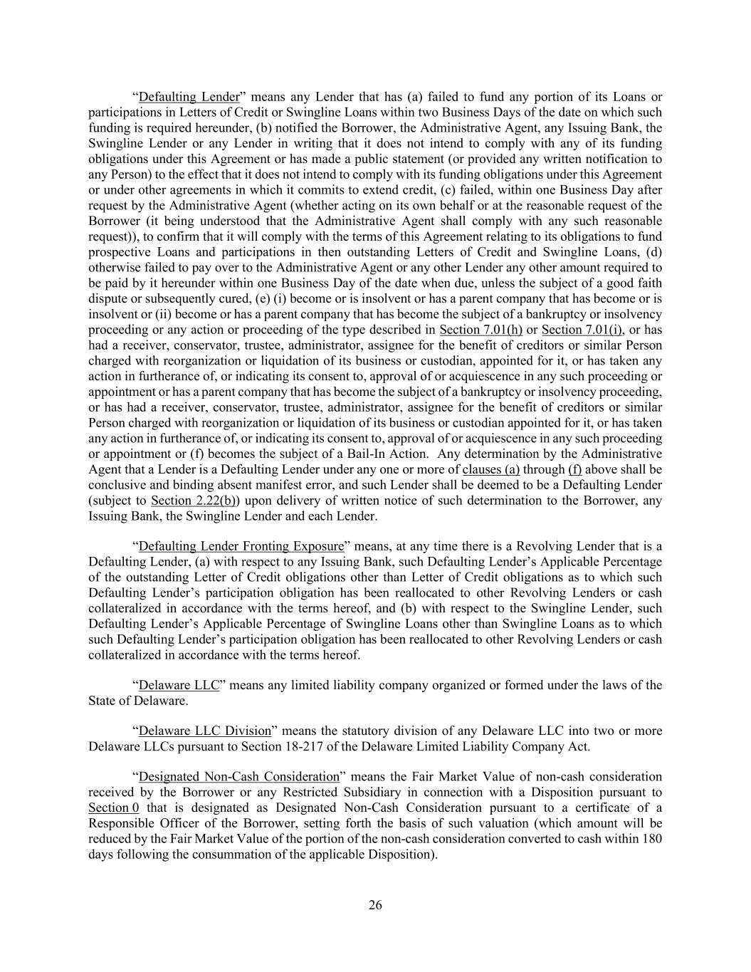 26 “Defaulting Lender” means any Lender that has (a) failed to fund any portion of its Loans or participations in Letters of Credit or Swingline Loans within two Business Days of the date on which such funding is required hereunder, (b) notified the Borrower, the Administrative Agent, any Issuing Bank, the Swingline Lender or any Lender in writing that it does not intend to comply with any of its funding obligations under this Agreement or has made a public statement (or provided any written notification to any Person) to the effect that it does not intend to comply with its funding obligations under this Agreement or under other agreements in which it commits to extend credit, (c) failed, within one Business Day after request by the Administrative Agent (whether acting on its own behalf or at the reasonable request of the Borrower (it being understood that the Administrative Agent shall comply with any such reasonable request)), to confirm that it will comply with the terms of this Agreement relating to its obligations to fund prospective Loans and participations in then outstanding Letters of Credit and Swingline Loans, (d) otherwise failed to pay over to the Administrative Agent or any other Lender any other amount required to be paid by it hereunder within one Business Day of the date when due, unless the subject of a good faith dispute or subsequently cured, (e) (i) become or is insolvent or has a parent company that has become or is insolvent or (ii) become or has a parent company that has become the subject of a bankruptcy or insolvency proceeding or any action or proceeding of the type described in Section 7.01(h) or Section 7.01(i), or has had a receiver, conservator, trustee, administrator, assignee for the benefit of creditors or similar Person charged with reorganization or liquidation of its business or custodian, appointed for it, or has taken any action in furtherance of, or indicating its consent to, approval of or acquiescence in any such proceeding or appointment or has a parent company that has become the subject of a bankruptcy or insolvency proceeding, or has had a receiver, conservator, trustee, administrator, assignee for the benefit of creditors or similar Person charged with reorganization or liquidation of its business or custodian appointed for it, or has taken any action in furtherance of, or indicating its consent to, approval of or acquiescence in any such proceeding or appointment or (f) becomes the subject of a Bail-In Action. Any determination by the Administrative Agent that a Lender is a Defaulting Lender under any one or more of clauses (a) through (f) above shall be conclusive and binding absent manifest error, and such Lender shall be deemed to be a Defaulting Lender (subject to Section 2.22(b)) upon delivery of written notice of such determination to the Borrower, any Issuing Bank, the Swingline Lender and each Lender. “Defaulting Lender Fronting Exposure” means, at any time there is a Revolving Lender that is a Defaulting Lender, (a) with respect to any Issuing Bank, such Defaulting Lender’s Applicable Percentage of the outstanding Letter of Credit obligations other than Letter of Credit obligations as to which such Defaulting Lender’s participation obligation has been reallocated to other Revolving Lenders or cash collateralized in accordance with the terms hereof, and (b) with respect to the Swingline Lender, such Defaulting Lender’s Applicable Percentage of Swingline Loans other than Swingline Loans as to which such Defaulting Lender’s participation obligation has been reallocated to other Revolving Lenders or cash collateralized in accordance with the terms hereof. “Delaware LLC” means any limited liability company organized or formed under the laws of the State of Delaware. “Delaware LLC Division” means the statutory division of any Delaware LLC into two or more Delaware LLCs pursuant to Section 18-217 of the Delaware Limited Liability Company Act. “Designated Non-Cash Consideration” means the Fair Market Value of non-cash consideration received by the Borrower or any Restricted Subsidiary in connection with a Disposition pursuant to Section 0 that is designated as Designated Non-Cash Consideration pursuant to a certificate of a Responsible Officer of the Borrower, setting forth the basis of such valuation (which amount will be reduced by the Fair Market Value of the portion of the non-cash consideration converted to cash within 180 days following the consummation of the applicable Disposition).
