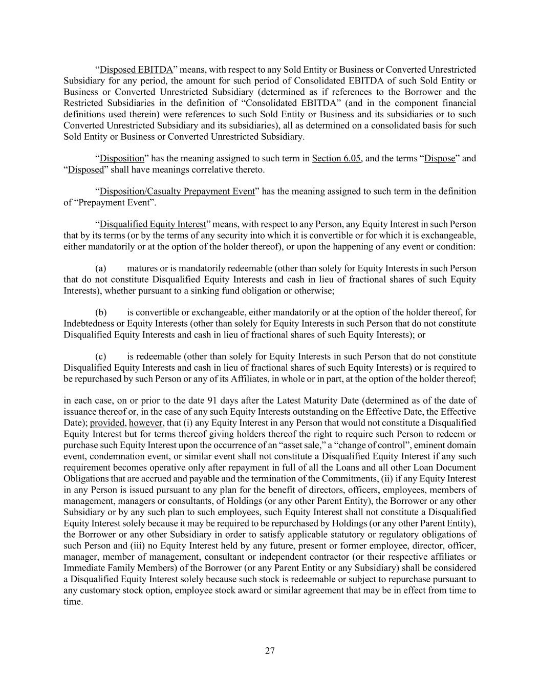 27 “Disposed EBITDA” means, with respect to any Sold Entity or Business or Converted Unrestricted Subsidiary for any period, the amount for such period of Consolidated EBITDA of such Sold Entity or Business or Converted Unrestricted Subsidiary (determined as if references to the Borrower and the Restricted Subsidiaries in the definition of “Consolidated EBITDA” (and in the component financial definitions used therein) were references to such Sold Entity or Business and its subsidiaries or to such Converted Unrestricted Subsidiary and its subsidiaries), all as determined on a consolidated basis for such Sold Entity or Business or Converted Unrestricted Subsidiary. “Disposition” has the meaning assigned to such term in Section 6.05, and the terms “Dispose” and “Disposed” shall have meanings correlative thereto. “Disposition/Casualty Prepayment Event” has the meaning assigned to such term in the definition of “Prepayment Event”. “Disqualified Equity Interest” means, with respect to any Person, any Equity Interest in such Person that by its terms (or by the terms of any security into which it is convertible or for which it is exchangeable, either mandatorily or at the option of the holder thereof), or upon the happening of any event or condition: (a) matures or is mandatorily redeemable (other than solely for Equity Interests in such Person that do not constitute Disqualified Equity Interests and cash in lieu of fractional shares of such Equity Interests), whether pursuant to a sinking fund obligation or otherwise; (b) is convertible or exchangeable, either mandatorily or at the option of the holder thereof, for Indebtedness or Equity Interests (other than solely for Equity Interests in such Person that do not constitute Disqualified Equity Interests and cash in lieu of fractional shares of such Equity Interests); or (c) is redeemable (other than solely for Equity Interests in such Person that do not constitute Disqualified Equity Interests and cash in lieu of fractional shares of such Equity Interests) or is required to be repurchased by such Person or any of its Affiliates, in whole or in part, at the option of the holder thereof; in each case, on or prior to the date 91 days after the Latest Maturity Date (determined as of the date of issuance thereof or, in the case of any such Equity Interests outstanding on the Effective Date, the Effective Date); provided, however, that (i) any Equity Interest in any Person that would not constitute a Disqualified Equity Interest but for terms thereof giving holders thereof the right to require such Person to redeem or purchase such Equity Interest upon the occurrence of an “asset sale,” a “change of control”, eminent domain event, condemnation event, or similar event shall not constitute a Disqualified Equity Interest if any such requirement becomes operative only after repayment in full of all the Loans and all other Loan Document Obligations that are accrued and payable and the termination of the Commitments, (ii) if any Equity Interest in any Person is issued pursuant to any plan for the benefit of directors, officers, employees, members of management, managers or consultants, of Holdings (or any other Parent Entity), the Borrower or any other Subsidiary or by any such plan to such employees, such Equity Interest shall not constitute a Disqualified Equity Interest solely because it may be required to be repurchased by Holdings (or any other Parent Entity), the Borrower or any other Subsidiary in order to satisfy applicable statutory or regulatory obligations of such Person and (iii) no Equity Interest held by any future, present or former employee, director, officer, manager, member of management, consultant or independent contractor (or their respective affiliates or Immediate Family Members) of the Borrower (or any Parent Entity or any Subsidiary) shall be considered a Disqualified Equity Interest solely because such stock is redeemable or subject to repurchase pursuant to any customary stock option, employee stock award or similar agreement that may be in effect from time to time.