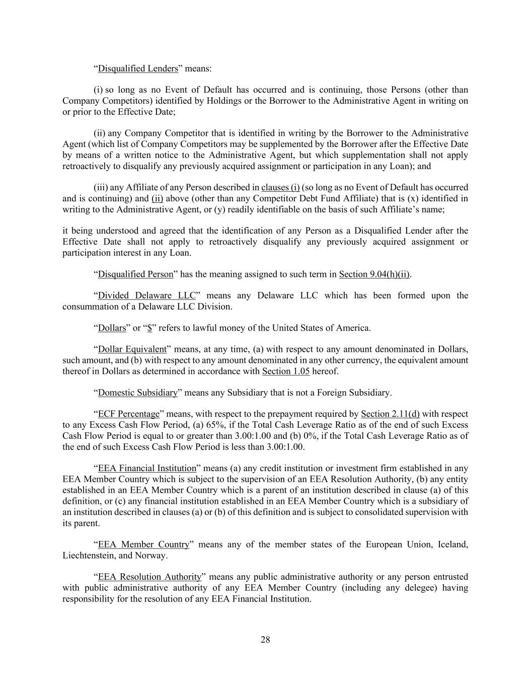 28 “Disqualified Lenders” means: (i) so long as no Event of Default has occurred and is continuing, those Persons (other than Company Competitors) identified by Holdings or the Borrower to the Administrative Agent in writing on or prior to the Effective Date; (ii) any Company Competitor that is identified in writing by the Borrower to the Administrative Agent (which list of Company Competitors may be supplemented by the Borrower after the Effective Date by means of a written notice to the Administrative Agent, but which supplementation shall not apply retroactively to disqualify any previously acquired assignment or participation in any Loan); and (iii) any Affiliate of any Person described in clauses (i) (so long as no Event of Default has occurred and is continuing) and (ii) above (other than any Competitor Debt Fund Affiliate) that is (x) identified in writing to the Administrative Agent, or (y) readily identifiable on the basis of such Affiliate’s name; it being understood and agreed that the identification of any Person as a Disqualified Lender after the Effective Date shall not apply to retroactively disqualify any previously acquired assignment or participation interest in any Loan. “Disqualified Person” has the meaning assigned to such term in Section 9.04(h)(ii). “Divided Delaware LLC” means any Delaware LLC which has been formed upon the consummation of a Delaware LLC Division. “Dollars” or “$” refers to lawful money of the United States of America. “Dollar Equivalent” means, at any time, (a) with respect to any amount denominated in Dollars, such amount, and (b) with respect to any amount denominated in any other currency, the equivalent amount thereof in Dollars as determined in accordance with Section 1.05 hereof. “Domestic Subsidiary” means any Subsidiary that is not a Foreign Subsidiary. “ECF Percentage” means, with respect to the prepayment required by Section 2.11(d) with respect to any Excess Cash Flow Period, (a) 65%, if the Total Cash Leverage Ratio as of the end of such Excess Cash Flow Period is equal to or greater than 3.00:1.00 and (b) 0%, if the Total Cash Leverage Ratio as of the end of such Excess Cash Flow Period is less than 3.00:1.00. “EEA Financial Institution” means (a) any credit institution or investment firm established in any EEA Member Country which is subject to the supervision of an EEA Resolution Authority, (b) any entity established in an EEA Member Country which is a parent of an institution described in clause (a) of this definition, or (c) any financial institution established in an EEA Member Country which is a subsidiary of an institution described in clauses (a) or (b) of this definition and is subject to consolidated supervision with its parent. “EEA Member Country” means any of the member states of the European Union, Iceland, Liechtenstein, and Norway. “EEA Resolution Authority” means any public administrative authority or any person entrusted with public administrative authority of any EEA Member Country (including any delegee) having responsibility for the resolution of any EEA Financial Institution.