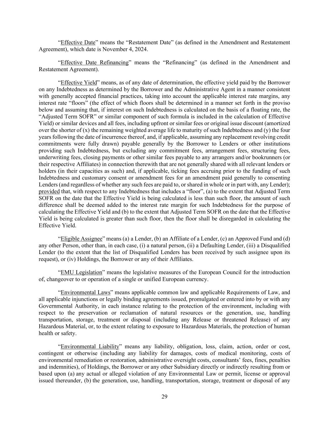 29 “Effective Date” means the “Restatement Date” (as defined in the Amendment and Restatement Agreement), which date is November 4, 2024. “Effective Date Refinancing” means the “Refinancing” (as defined in the Amendment and Restatement Agreement). “Effective Yield” means, as of any date of determination, the effective yield paid by the Borrower on any Indebtedness as determined by the Borrower and the Administrative Agent in a manner consistent with generally accepted financial practices, taking into account the applicable interest rate margins, any interest rate “floors” (the effect of which floors shall be determined in a manner set forth in the proviso below and assuming that, if interest on such Indebtedness is calculated on the basis of a floating rate, the “Adjusted Term SOFR” or similar component of such formula is included in the calculation of Effective Yield) or similar devices and all fees, including upfront or similar fees or original issue discount (amortized over the shorter of (x) the remaining weighted average life to maturity of such Indebtedness and (y) the four years following the date of incurrence thereof, and, if applicable, assuming any replacement revolving credit commitments were fully drawn) payable generally by the Borrower to Lenders or other institutions providing such Indebtedness, but excluding any commitment fees, arrangement fees, structuring fees, underwriting fees, closing payments or other similar fees payable to any arrangers and/or bookrunners (or their respective Affiliates) in connection therewith that are not generally shared with all relevant lenders or holders (in their capacities as such) and, if applicable, ticking fees accruing prior to the funding of such Indebtedness and customary consent or amendment fees for an amendment paid generally to consenting Lenders (and regardless of whether any such fees are paid to, or shared in whole or in part with, any Lender); provided that, with respect to any Indebtedness that includes a “floor”, (a) to the extent that Adjusted Term SOFR on the date that the Effective Yield is being calculated is less than such floor, the amount of such difference shall be deemed added to the interest rate margin for such Indebtedness for the purpose of calculating the Effective Yield and (b) to the extent that Adjusted Term SOFR on the date that the Effective Yield is being calculated is greater than such floor, then the floor shall be disregarded in calculating the Effective Yield. “Eligible Assignee” means (a) a Lender, (b) an Affiliate of a Lender, (c) an Approved Fund and (d) any other Person, other than, in each case, (i) a natural person, (ii) a Defaulting Lender, (iii) a Disqualified Lender (to the extent that the list of Disqualified Lenders has been received by such assignee upon its request), or (iv) Holdings, the Borrower or any of their Affiliates. “EMU Legislation” means the legislative measures of the European Council for the introduction of, changeover to or operation of a single or unified European currency. “Environmental Laws” means applicable common law and applicable Requirements of Law, and all applicable injunctions or legally binding agreements issued, promulgated or entered into by or with any Governmental Authority, in each instance relating to the protection of the environment, including with respect to the preservation or reclamation of natural resources or the generation, use, handling transportation, storage, treatment or disposal (including any Release or threatened Release) of any Hazardous Material, or, to the extent relating to exposure to Hazardous Materials, the protection of human health or safety. “Environmental Liability” means any liability, obligation, loss, claim, action, order or cost, contingent or otherwise (including any liability for damages, costs of medical monitoring, costs of environmental remediation or restoration, administrative oversight costs, consultants’ fees, fines, penalties and indemnities), of Holdings, the Borrower or any other Subsidiary directly or indirectly resulting from or based upon (a) any actual or alleged violation of any Environmental Law or permit, license or approval issued thereunder, (b) the generation, use, handling, transportation, storage, treatment or disposal of any