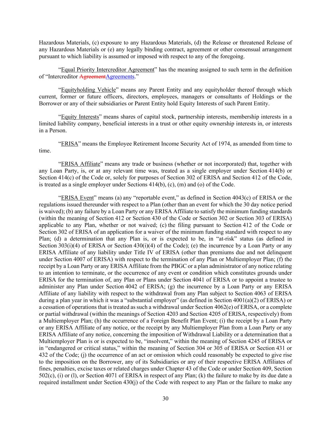 30 Hazardous Materials, (c) exposure to any Hazardous Materials, (d) the Release or threatened Release of any Hazardous Materials or (e) any legally binding contract, agreement or other consensual arrangement pursuant to which liability is assumed or imposed with respect to any of the foregoing. “Equal Priority Intercreditor Agreement” has the meaning assigned to such term in the definition of “Intercreditor AgreementAgreements.” “Equityholding Vehicle” means any Parent Entity and any equityholder thereof through which current, former or future officers, directors, employees, managers or consultants of Holdings or the Borrower or any of their subsidiaries or Parent Entity hold Equity Interests of such Parent Entity. “Equity Interests” means shares of capital stock, partnership interests, membership interests in a limited liability company, beneficial interests in a trust or other equity ownership interests in, or interests in a Person. “ERISA” means the Employee Retirement Income Security Act of 1974, as amended from time to time. “ERISA Affiliate” means any trade or business (whether or not incorporated) that, together with any Loan Party, is, or at any relevant time was, treated as a single employer under Section 414(b) or Section 414(c) of the Code or, solely for purposes of Section 302 of ERISA and Section 412 of the Code, is treated as a single employer under Sections 414(b), (c), (m) and (o) of the Code. “ERISA Event” means (a) any “reportable event,” as defined in Section 4043(c) of ERISA or the regulations issued thereunder with respect to a Plan (other than an event for which the 30 day notice period is waived); (b) any failure by a Loan Party or any ERISA Affiliate to satisfy the minimum funding standards (within the meaning of Section 412 or Section 430 of the Code or Section 302 or Section 303 of ERISA) applicable to any Plan, whether or not waived; (c) the filing pursuant to Section 412 of the Code or Section 302 of ERISA of an application for a waiver of the minimum funding standard with respect to any Plan; (d) a determination that any Plan is, or is expected to be, in “at-risk” status (as defined in Section 303(i)(4) of ERISA or Section 430(i)(4) of the Code); (e) the incurrence by a Loan Party or any ERISA Affiliate of any liability under Title IV of ERISA (other than premiums due and not delinquent under Section 4007 of ERISA) with respect to the termination of any Plan or Multiemployer Plan; (f) the receipt by a Loan Party or any ERISA Affiliate from the PBGC or a plan administrator of any notice relating to an intention to terminate, or the occurrence of any event or condition which constitutes grounds under ERISA for the termination of, any Plan or Plans under Section 4041 of ERISA or to appoint a trustee to administer any Plan under Section 4042 of ERISA; (g) the incurrence by a Loan Party or any ERISA Affiliate of any liability with respect to the withdrawal from any Plan subject to Section 4063 of ERISA during a plan year in which it was a “substantial employer” (as defined in Section 4001(a)(2) of ERISA) or a cessation of operations that is treated as such a withdrawal under Section 4062(e) of ERISA, or a complete or partial withdrawal (within the meanings of Section 4203 and Section 4205 of ERISA, respectively) from a Multiemployer Plan; (h) the occurrence of a Foreign Benefit Plan Event; (i) the receipt by a Loan Party or any ERISA Affiliate of any notice, or the receipt by any Multiemployer Plan from a Loan Party or any ERISA Affiliate of any notice, concerning the imposition of Withdrawal Liability or a determination that a Multiemployer Plan is or is expected to be, “insolvent,” within the meaning of Section 4245 of ERISA or in “endangered or critical status,” within the meaning of Section 304 or 305 of ERISA or Section 431 or 432 of the Code; (j) the occurrence of an act or omission which could reasonably be expected to give rise to the imposition on the Borrower, any of its Subsidiaries or any of their respective ERISA Affiliates of fines, penalties, excise taxes or related charges under Chapter 43 of the Code or under Section 409, Section 502(c), (i) or (l), or Section 4071 of ERISA in respect of any Plan; (k) the failure to make by its due date a required installment under Section 430(j) of the Code with respect to any Plan or the failure to make any
