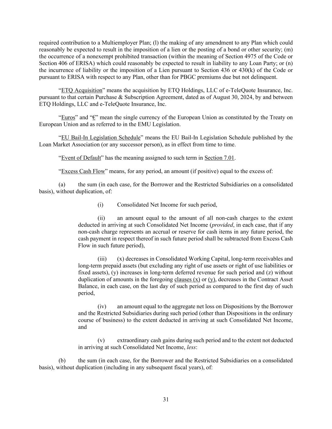 31 required contribution to a Multiemployer Plan; (l) the making of any amendment to any Plan which could reasonably be expected to result in the imposition of a lien or the posting of a bond or other security; (m) the occurrence of a nonexempt prohibited transaction (within the meaning of Section 4975 of the Code or Section 406 of ERISA) which could reasonably be expected to result in liability to any Loan Party; or (n) the incurrence of liability or the imposition of a Lien pursuant to Section 436 or 430(k) of the Code or pursuant to ERISA with respect to any Plan, other than for PBGC premiums due but not delinquent. “ETQ Acquisition” means the acquisition by ETQ Holdings, LLC of e-TeleQuote Insurance, Inc. pursuant to that certain Purchase & Subscription Agreement, dated as of August 30, 2024, by and between ETQ Holdings, LLC and e-TeleQuote Insurance, Inc. “Euros” and “€” mean the single currency of the European Union as constituted by the Treaty on European Union and as referred to in the EMU Legislation. “EU Bail-In Legislation Schedule” means the EU Bail-In Legislation Schedule published by the Loan Market Association (or any successor person), as in effect from time to time. “Event of Default” has the meaning assigned to such term in Section 7.01. “Excess Cash Flow” means, for any period, an amount (if positive) equal to the excess of: (a) the sum (in each case, for the Borrower and the Restricted Subsidiaries on a consolidated basis), without duplication, of: (i) Consolidated Net Income for such period, (ii) an amount equal to the amount of all non-cash charges to the extent deducted in arriving at such Consolidated Net Income (provided, in each case, that if any non-cash charge represents an accrual or reserve for cash items in any future period, the cash payment in respect thereof in such future period shall be subtracted from Excess Cash Flow in such future period), (iii) (x) decreases in Consolidated Working Capital, long-term receivables and long-term prepaid assets (but excluding any right of use assets or right of use liabilities or fixed assets), (y) increases in long-term deferred revenue for such period and (z) without duplication of amounts in the foregoing clauses (x) or (y), decreases in the Contract Asset Balance, in each case, on the last day of such period as compared to the first day of such period, (iv) an amount equal to the aggregate net loss on Dispositions by the Borrower and the Restricted Subsidiaries during such period (other than Dispositions in the ordinary course of business) to the extent deducted in arriving at such Consolidated Net Income, and (v) extraordinary cash gains during such period and to the extent not deducted in arriving at such Consolidated Net Income, less: (b) the sum (in each case, for the Borrower and the Restricted Subsidiaries on a consolidated basis), without duplication (including in any subsequent fiscal years), of: