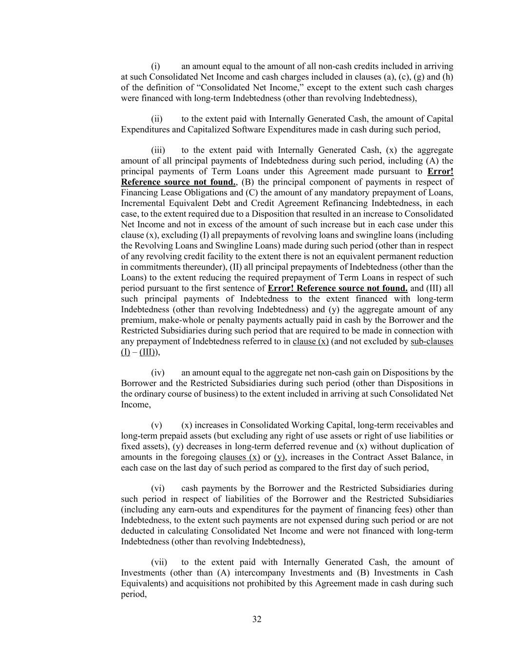 32 (i) an amount equal to the amount of all non-cash credits included in arriving at such Consolidated Net Income and cash charges included in clauses (a), (c), (g) and (h) of the definition of “Consolidated Net Income,” except to the extent such cash charges were financed with long-term Indebtedness (other than revolving Indebtedness), (ii) to the extent paid with Internally Generated Cash, the amount of Capital Expenditures and Capitalized Software Expenditures made in cash during such period, (iii) to the extent paid with Internally Generated Cash, (x) the aggregate amount of all principal payments of Indebtedness during such period, including (A) the principal payments of Term Loans under this Agreement made pursuant to Error! Reference source not found., (B) the principal component of payments in respect of Financing Lease Obligations and (C) the amount of any mandatory prepayment of Loans, Incremental Equivalent Debt and Credit Agreement Refinancing Indebtedness, in each case, to the extent required due to a Disposition that resulted in an increase to Consolidated Net Income and not in excess of the amount of such increase but in each case under this clause (x), excluding (I) all prepayments of revolving loans and swingline loans (including the Revolving Loans and Swingline Loans) made during such period (other than in respect of any revolving credit facility to the extent there is not an equivalent permanent reduction in commitments thereunder), (II) all principal prepayments of Indebtedness (other than the Loans) to the extent reducing the required prepayment of Term Loans in respect of such period pursuant to the first sentence of Error! Reference source not found. and (III) all such principal payments of Indebtedness to the extent financed with long-term Indebtedness (other than revolving Indebtedness) and (y) the aggregate amount of any premium, make-whole or penalty payments actually paid in cash by the Borrower and the Restricted Subsidiaries during such period that are required to be made in connection with any prepayment of Indebtedness referred to in clause (x) (and not excluded by sub-clauses (I) – (III)), (iv) an amount equal to the aggregate net non-cash gain on Dispositions by the Borrower and the Restricted Subsidiaries during such period (other than Dispositions in the ordinary course of business) to the extent included in arriving at such Consolidated Net Income, (v) (x) increases in Consolidated Working Capital, long-term receivables and long-term prepaid assets (but excluding any right of use assets or right of use liabilities or fixed assets), (y) decreases in long-term deferred revenue and (x) without duplication of amounts in the foregoing clauses (x) or (y), increases in the Contract Asset Balance, in each case on the last day of such period as compared to the first day of such period, (vi) cash payments by the Borrower and the Restricted Subsidiaries during such period in respect of liabilities of the Borrower and the Restricted Subsidiaries (including any earn-outs and expenditures for the payment of financing fees) other than Indebtedness, to the extent such payments are not expensed during such period or are not deducted in calculating Consolidated Net Income and were not financed with long-term Indebtedness (other than revolving Indebtedness), (vii) to the extent paid with Internally Generated Cash, the amount of Investments (other than (A) intercompany Investments and (B) Investments in Cash Equivalents) and acquisitions not prohibited by this Agreement made in cash during such period,