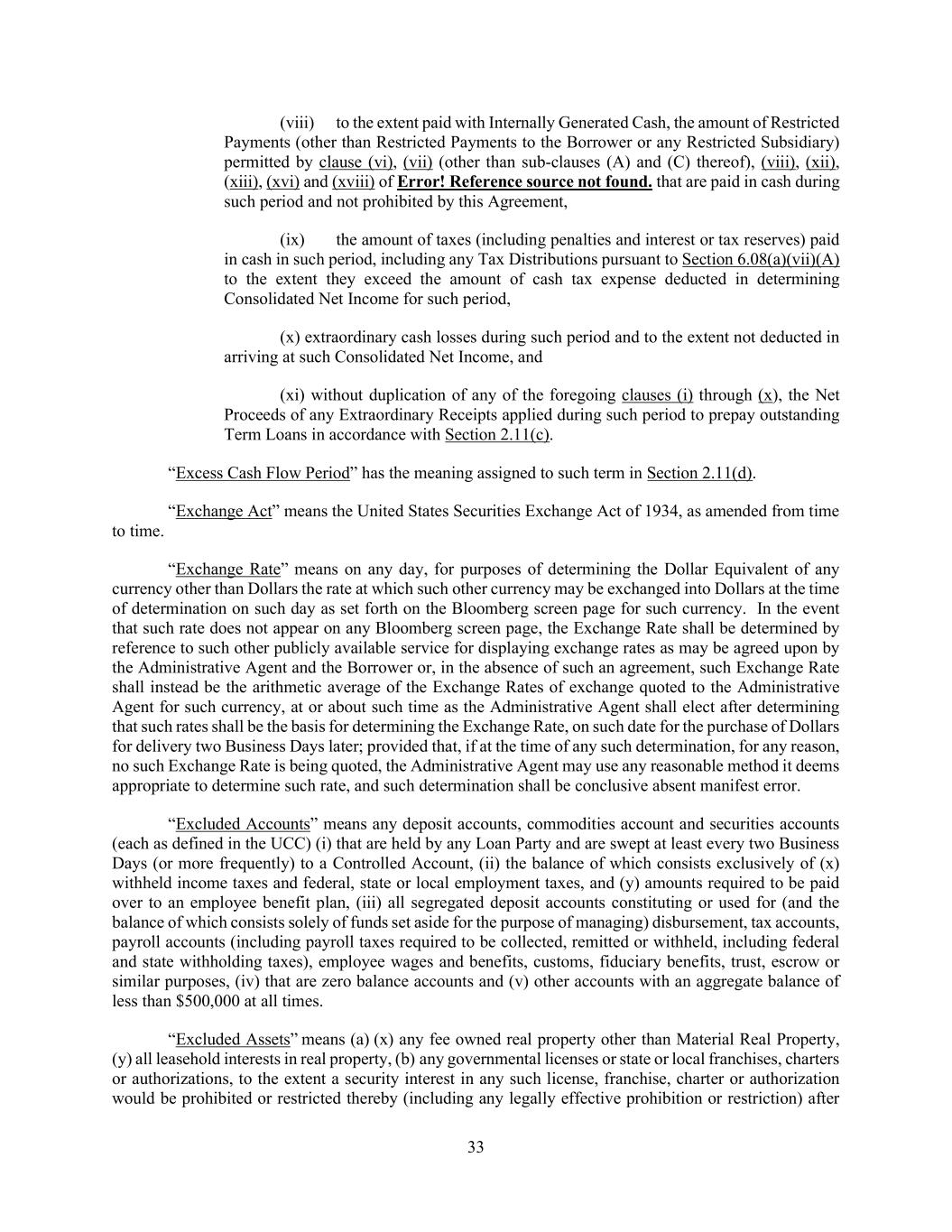 33 (viii) to the extent paid with Internally Generated Cash, the amount of Restricted Payments (other than Restricted Payments to the Borrower or any Restricted Subsidiary) permitted by clause (vi), (vii) (other than sub-clauses (A) and (C) thereof), (viii), (xii), (xiii), (xvi) and (xviii) of Error! Reference source not found. that are paid in cash during such period and not prohibited by this Agreement, (ix) the amount of taxes (including penalties and interest or tax reserves) paid in cash in such period, including any Tax Distributions pursuant to Section 6.08(a)(vii)(A) to the extent they exceed the amount of cash tax expense deducted in determining Consolidated Net Income for such period, (x) extraordinary cash losses during such period and to the extent not deducted in arriving at such Consolidated Net Income, and (xi) without duplication of any of the foregoing clauses (i) through (x), the Net Proceeds of any Extraordinary Receipts applied during such period to prepay outstanding Term Loans in accordance with Section 2.11(c). “Excess Cash Flow Period” has the meaning assigned to such term in Section 2.11(d). “Exchange Act” means the United States Securities Exchange Act of 1934, as amended from time to time. “Exchange Rate” means on any day, for purposes of determining the Dollar Equivalent of any currency other than Dollars the rate at which such other currency may be exchanged into Dollars at the time of determination on such day as set forth on the Bloomberg screen page for such currency. In the event that such rate does not appear on any Bloomberg screen page, the Exchange Rate shall be determined by reference to such other publicly available service for displaying exchange rates as may be agreed upon by the Administrative Agent and the Borrower or, in the absence of such an agreement, such Exchange Rate shall instead be the arithmetic average of the Exchange Rates of exchange quoted to the Administrative Agent for such currency, at or about such time as the Administrative Agent shall elect after determining that such rates shall be the basis for determining the Exchange Rate, on such date for the purchase of Dollars for delivery two Business Days later; provided that, if at the time of any such determination, for any reason, no such Exchange Rate is being quoted, the Administrative Agent may use any reasonable method it deems appropriate to determine such rate, and such determination shall be conclusive absent manifest error. “Excluded Accounts” means any deposit accounts, commodities account and securities accounts (each as defined in the UCC) (i) that are held by any Loan Party and are swept at least every two Business Days (or more frequently) to a Controlled Account, (ii) the balance of which consists exclusively of (x) withheld income taxes and federal, state or local employment taxes, and (y) amounts required to be paid over to an employee benefit plan, (iii) all segregated deposit accounts constituting or used for (and the balance of which consists solely of funds set aside for the purpose of managing) disbursement, tax accounts, payroll accounts (including payroll taxes required to be collected, remitted or withheld, including federal and state withholding taxes), employee wages and benefits, customs, fiduciary benefits, trust, escrow or similar purposes, (iv) that are zero balance accounts and (v) other accounts with an aggregate balance of less than $500,000 at all times. “Excluded Assets” means (a) (x) any fee owned real property other than Material Real Property, (y) all leasehold interests in real property, (b) any governmental licenses or state or local franchises, charters or authorizations, to the extent a security interest in any such license, franchise, charter or authorization would be prohibited or restricted thereby (including any legally effective prohibition or restriction) after