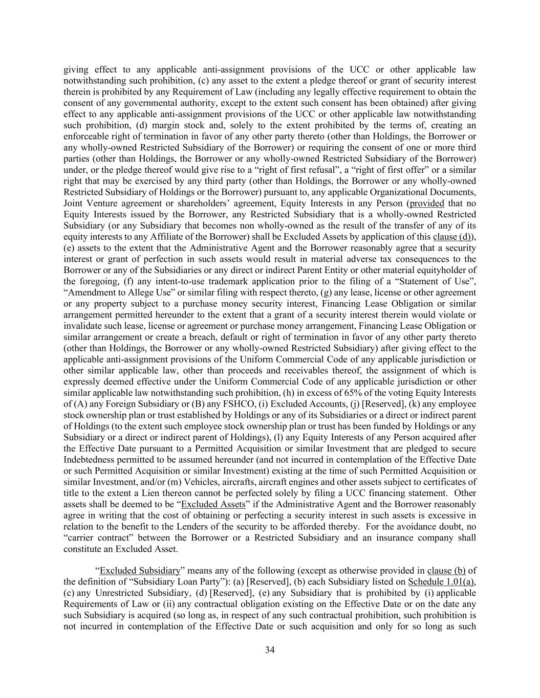 34 giving effect to any applicable anti-assignment provisions of the UCC or other applicable law notwithstanding such prohibition, (c) any asset to the extent a pledge thereof or grant of security interest therein is prohibited by any Requirement of Law (including any legally effective requirement to obtain the consent of any governmental authority, except to the extent such consent has been obtained) after giving effect to any applicable anti-assignment provisions of the UCC or other applicable law notwithstanding such prohibition, (d) margin stock and, solely to the extent prohibited by the terms of, creating an enforceable right of termination in favor of any other party thereto (other than Holdings, the Borrower or any wholly-owned Restricted Subsidiary of the Borrower) or requiring the consent of one or more third parties (other than Holdings, the Borrower or any wholly-owned Restricted Subsidiary of the Borrower) under, or the pledge thereof would give rise to a “right of first refusal”, a “right of first offer” or a similar right that may be exercised by any third party (other than Holdings, the Borrower or any wholly-owned Restricted Subsidiary of Holdings or the Borrower) pursuant to, any applicable Organizational Documents, Joint Venture agreement or shareholders’ agreement, Equity Interests in any Person (provided that no Equity Interests issued by the Borrower, any Restricted Subsidiary that is a wholly-owned Restricted Subsidiary (or any Subsidiary that becomes non wholly-owned as the result of the transfer of any of its equity interests to any Affiliate of the Borrower) shall be Excluded Assets by application of this clause (d)), (e) assets to the extent that the Administrative Agent and the Borrower reasonably agree that a security interest or grant of perfection in such assets would result in material adverse tax consequences to the Borrower or any of the Subsidiaries or any direct or indirect Parent Entity or other material equityholder of the foregoing, (f) any intent-to-use trademark application prior to the filing of a “Statement of Use”, “Amendment to Allege Use” or similar filing with respect thereto, (g) any lease, license or other agreement or any property subject to a purchase money security interest, Financing Lease Obligation or similar arrangement permitted hereunder to the extent that a grant of a security interest therein would violate or invalidate such lease, license or agreement or purchase money arrangement, Financing Lease Obligation or similar arrangement or create a breach, default or right of termination in favor of any other party thereto (other than Holdings, the Borrower or any wholly-owned Restricted Subsidiary) after giving effect to the applicable anti-assignment provisions of the Uniform Commercial Code of any applicable jurisdiction or other similar applicable law, other than proceeds and receivables thereof, the assignment of which is expressly deemed effective under the Uniform Commercial Code of any applicable jurisdiction or other similar applicable law notwithstanding such prohibition, (h) in excess of 65% of the voting Equity Interests of (A) any Foreign Subsidiary or (B) any FSHCO, (i) Excluded Accounts, (j) [Reserved], (k) any employee stock ownership plan or trust established by Holdings or any of its Subsidiaries or a direct or indirect parent of Holdings (to the extent such employee stock ownership plan or trust has been funded by Holdings or any Subsidiary or a direct or indirect parent of Holdings), (l) any Equity Interests of any Person acquired after the Effective Date pursuant to a Permitted Acquisition or similar Investment that are pledged to secure Indebtedness permitted to be assumed hereunder (and not incurred in contemplation of the Effective Date or such Permitted Acquisition or similar Investment) existing at the time of such Permitted Acquisition or similar Investment, and/or (m) Vehicles, aircrafts, aircraft engines and other assets subject to certificates of title to the extent a Lien thereon cannot be perfected solely by filing a UCC financing statement. Other assets shall be deemed to be “Excluded Assets” if the Administrative Agent and the Borrower reasonably agree in writing that the cost of obtaining or perfecting a security interest in such assets is excessive in relation to the benefit to the Lenders of the security to be afforded thereby. For the avoidance doubt, no “carrier contract” between the Borrower or a Restricted Subsidiary and an insurance company shall constitute an Excluded Asset. “Excluded Subsidiary” means any of the following (except as otherwise provided in clause (b) of the definition of “Subsidiary Loan Party”): (a) [Reserved], (b) each Subsidiary listed on Schedule 1.01(a), (c) any Unrestricted Subsidiary, (d) [Reserved], (e) any Subsidiary that is prohibited by (i) applicable Requirements of Law or (ii) any contractual obligation existing on the Effective Date or on the date any such Subsidiary is acquired (so long as, in respect of any such contractual prohibition, such prohibition is not incurred in contemplation of the Effective Date or such acquisition and only for so long as such