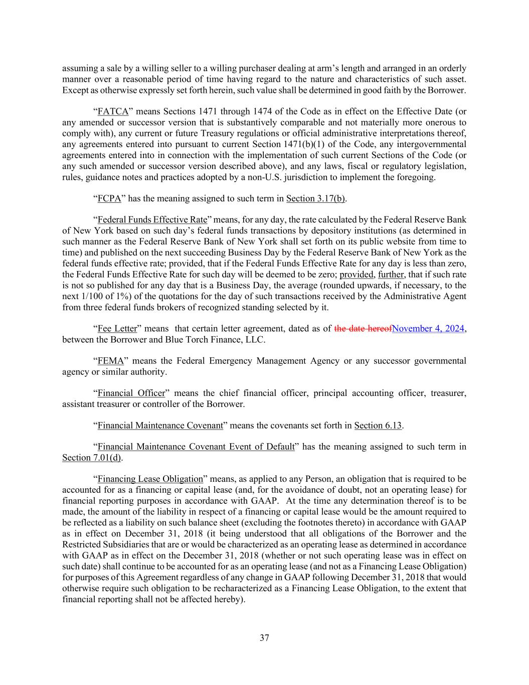 37 assuming a sale by a willing seller to a willing purchaser dealing at arm’s length and arranged in an orderly manner over a reasonable period of time having regard to the nature and characteristics of such asset. Except as otherwise expressly set forth herein, such value shall be determined in good faith by the Borrower. “FATCA” means Sections 1471 through 1474 of the Code as in effect on the Effective Date (or any amended or successor version that is substantively comparable and not materially more onerous to comply with), any current or future Treasury regulations or official administrative interpretations thereof, any agreements entered into pursuant to current Section 1471(b)(1) of the Code, any intergovernmental agreements entered into in connection with the implementation of such current Sections of the Code (or any such amended or successor version described above), and any laws, fiscal or regulatory legislation, rules, guidance notes and practices adopted by a non-U.S. jurisdiction to implement the foregoing. “FCPA” has the meaning assigned to such term in Section 3.17(b). “Federal Funds Effective Rate” means, for any day, the rate calculated by the Federal Reserve Bank of New York based on such day’s federal funds transactions by depository institutions (as determined in such manner as the Federal Reserve Bank of New York shall set forth on its public website from time to time) and published on the next succeeding Business Day by the Federal Reserve Bank of New York as the federal funds effective rate; provided, that if the Federal Funds Effective Rate for any day is less than zero, the Federal Funds Effective Rate for such day will be deemed to be zero; provided, further, that if such rate is not so published for any day that is a Business Day, the average (rounded upwards, if necessary, to the next 1/100 of 1%) of the quotations for the day of such transactions received by the Administrative Agent from three federal funds brokers of recognized standing selected by it. “Fee Letter” means that certain letter agreement, dated as of the date hereofNovember 4, 2024, between the Borrower and Blue Torch Finance, LLC. “FEMA” means the Federal Emergency Management Agency or any successor governmental agency or similar authority. “Financial Officer” means the chief financial officer, principal accounting officer, treasurer, assistant treasurer or controller of the Borrower. “Financial Maintenance Covenant” means the covenants set forth in Section 6.13. “Financial Maintenance Covenant Event of Default” has the meaning assigned to such term in Section 7.01(d). “Financing Lease Obligation” means, as applied to any Person, an obligation that is required to be accounted for as a financing or capital lease (and, for the avoidance of doubt, not an operating lease) for financial reporting purposes in accordance with GAAP. At the time any determination thereof is to be made, the amount of the liability in respect of a financing or capital lease would be the amount required to be reflected as a liability on such balance sheet (excluding the footnotes thereto) in accordance with GAAP as in effect on December 31, 2018 (it being understood that all obligations of the Borrower and the Restricted Subsidiaries that are or would be characterized as an operating lease as determined in accordance with GAAP as in effect on the December 31, 2018 (whether or not such operating lease was in effect on such date) shall continue to be accounted for as an operating lease (and not as a Financing Lease Obligation) for purposes of this Agreement regardless of any change in GAAP following December 31, 2018 that would otherwise require such obligation to be recharacterized as a Financing Lease Obligation, to the extent that financial reporting shall not be affected hereby).