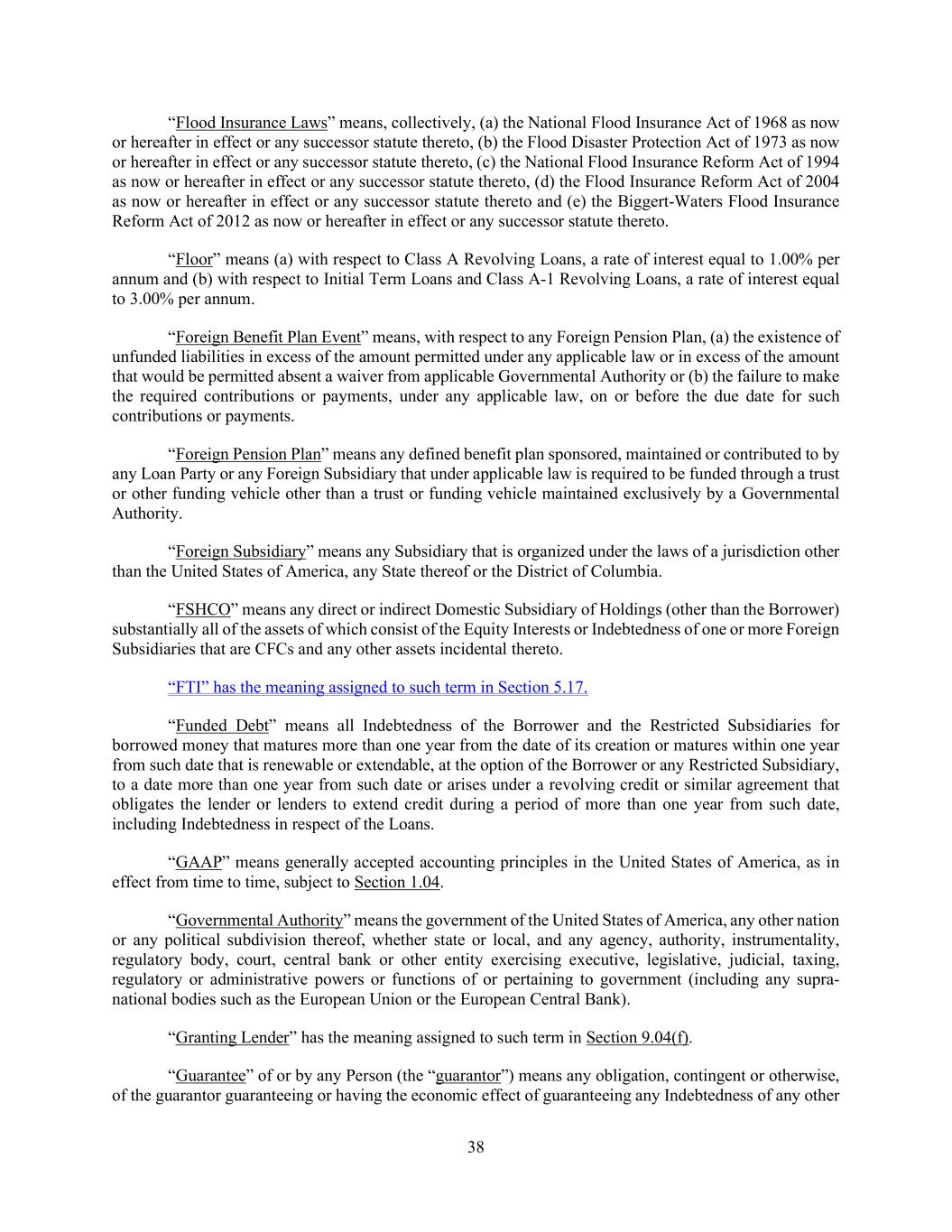 38 “Flood Insurance Laws” means, collectively, (a) the National Flood Insurance Act of 1968 as now or hereafter in effect or any successor statute thereto, (b) the Flood Disaster Protection Act of 1973 as now or hereafter in effect or any successor statute thereto, (c) the National Flood Insurance Reform Act of 1994 as now or hereafter in effect or any successor statute thereto, (d) the Flood Insurance Reform Act of 2004 as now or hereafter in effect or any successor statute thereto and (e) the Biggert-Waters Flood Insurance Reform Act of 2012 as now or hereafter in effect or any successor statute thereto. “Floor” means (a) with respect to Class A Revolving Loans, a rate of interest equal to 1.00% per annum and (b) with respect to Initial Term Loans and Class A-1 Revolving Loans, a rate of interest equal to 3.00% per annum. “Foreign Benefit Plan Event” means, with respect to any Foreign Pension Plan, (a) the existence of unfunded liabilities in excess of the amount permitted under any applicable law or in excess of the amount that would be permitted absent a waiver from applicable Governmental Authority or (b) the failure to make the required contributions or payments, under any applicable law, on or before the due date for such contributions or payments. “Foreign Pension Plan” means any defined benefit plan sponsored, maintained or contributed to by any Loan Party or any Foreign Subsidiary that under applicable law is required to be funded through a trust or other funding vehicle other than a trust or funding vehicle maintained exclusively by a Governmental Authority. “Foreign Subsidiary” means any Subsidiary that is organized under the laws of a jurisdiction other than the United States of America, any State thereof or the District of Columbia. “FSHCO” means any direct or indirect Domestic Subsidiary of Holdings (other than the Borrower) substantially all of the assets of which consist of the Equity Interests or Indebtedness of one or more Foreign Subsidiaries that are CFCs and any other assets incidental thereto. “FTI” has the meaning assigned to such term in Section 5.17. “Funded Debt” means all Indebtedness of the Borrower and the Restricted Subsidiaries for borrowed money that matures more than one year from the date of its creation or matures within one year from such date that is renewable or extendable, at the option of the Borrower or any Restricted Subsidiary, to a date more than one year from such date or arises under a revolving credit or similar agreement that obligates the lender or lenders to extend credit during a period of more than one year from such date, including Indebtedness in respect of the Loans. “GAAP” means generally accepted accounting principles in the United States of America, as in effect from time to time, subject to Section 1.04. “Governmental Authority” means the government of the United States of America, any other nation or any political subdivision thereof, whether state or local, and any agency, authority, instrumentality, regulatory body, court, central bank or other entity exercising executive, legislative, judicial, taxing, regulatory or administrative powers or functions of or pertaining to government (including any supra- national bodies such as the European Union or the European Central Bank). “Granting Lender” has the meaning assigned to such term in Section 9.04(f). “Guarantee” of or by any Person (the “guarantor”) means any obligation, contingent or otherwise, of the guarantor guaranteeing or having the economic effect of guaranteeing any Indebtedness of any other