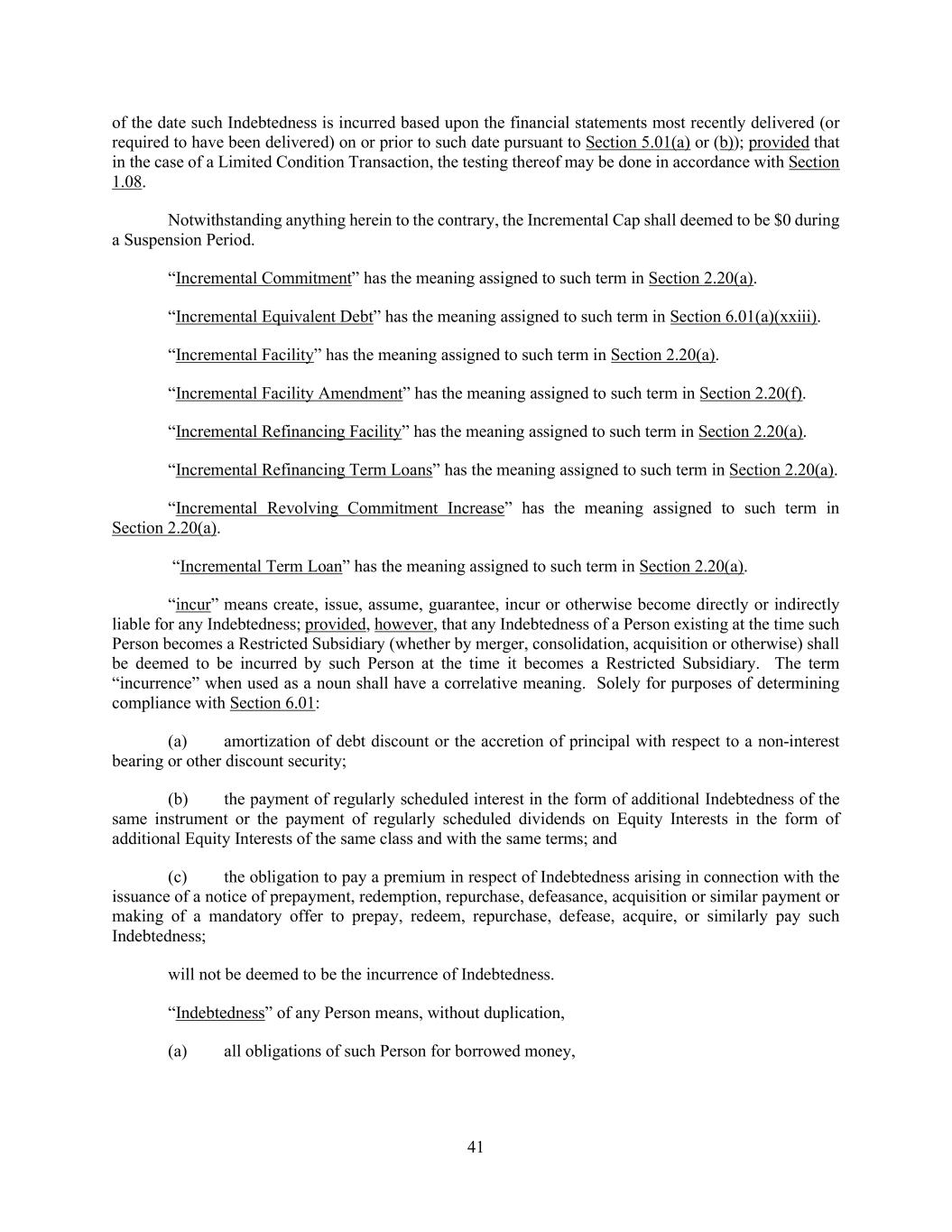 41 of the date such Indebtedness is incurred based upon the financial statements most recently delivered (or required to have been delivered) on or prior to such date pursuant to Section 5.01(a) or (b)); provided that in the case of a Limited Condition Transaction, the testing thereof may be done in accordance with Section 1.08. Notwithstanding anything herein to the contrary, the Incremental Cap shall deemed to be $0 during a Suspension Period. “Incremental Commitment” has the meaning assigned to such term in Section 2.20(a). “Incremental Equivalent Debt” has the meaning assigned to such term in Section 6.01(a)(xxiii). “Incremental Facility” has the meaning assigned to such term in Section 2.20(a). “Incremental Facility Amendment” has the meaning assigned to such term in Section 2.20(f). “Incremental Refinancing Facility” has the meaning assigned to such term in Section 2.20(a). “Incremental Refinancing Term Loans” has the meaning assigned to such term in Section 2.20(a). “Incremental Revolving Commitment Increase” has the meaning assigned to such term in Section 2.20(a). “Incremental Term Loan” has the meaning assigned to such term in Section 2.20(a). “incur” means create, issue, assume, guarantee, incur or otherwise become directly or indirectly liable for any Indebtedness; provided, however, that any Indebtedness of a Person existing at the time such Person becomes a Restricted Subsidiary (whether by merger, consolidation, acquisition or otherwise) shall be deemed to be incurred by such Person at the time it becomes a Restricted Subsidiary. The term “incurrence” when used as a noun shall have a correlative meaning. Solely for purposes of determining compliance with Section 6.01: (a) amortization of debt discount or the accretion of principal with respect to a non-interest bearing or other discount security; (b) the payment of regularly scheduled interest in the form of additional Indebtedness of the same instrument or the payment of regularly scheduled dividends on Equity Interests in the form of additional Equity Interests of the same class and with the same terms; and (c) the obligation to pay a premium in respect of Indebtedness arising in connection with the issuance of a notice of prepayment, redemption, repurchase, defeasance, acquisition or similar payment or making of a mandatory offer to prepay, redeem, repurchase, defease, acquire, or similarly pay such Indebtedness; will not be deemed to be the incurrence of Indebtedness. “Indebtedness” of any Person means, without duplication, (a) all obligations of such Person for borrowed money,