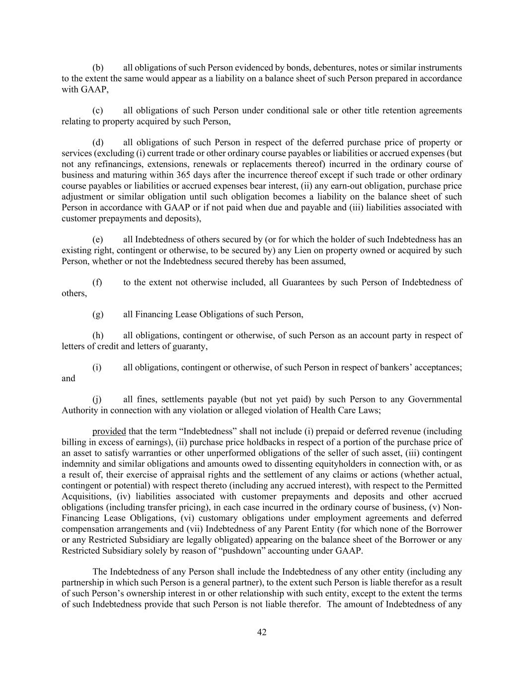 42 (b) all obligations of such Person evidenced by bonds, debentures, notes or similar instruments to the extent the same would appear as a liability on a balance sheet of such Person prepared in accordance with GAAP, (c) all obligations of such Person under conditional sale or other title retention agreements relating to property acquired by such Person, (d) all obligations of such Person in respect of the deferred purchase price of property or services (excluding (i) current trade or other ordinary course payables or liabilities or accrued expenses (but not any refinancings, extensions, renewals or replacements thereof) incurred in the ordinary course of business and maturing within 365 days after the incurrence thereof except if such trade or other ordinary course payables or liabilities or accrued expenses bear interest, (ii) any earn-out obligation, purchase price adjustment or similar obligation until such obligation becomes a liability on the balance sheet of such Person in accordance with GAAP or if not paid when due and payable and (iii) liabilities associated with customer prepayments and deposits), (e) all Indebtedness of others secured by (or for which the holder of such Indebtedness has an existing right, contingent or otherwise, to be secured by) any Lien on property owned or acquired by such Person, whether or not the Indebtedness secured thereby has been assumed, (f) to the extent not otherwise included, all Guarantees by such Person of Indebtedness of others, (g) all Financing Lease Obligations of such Person, (h) all obligations, contingent or otherwise, of such Person as an account party in respect of letters of credit and letters of guaranty, (i) all obligations, contingent or otherwise, of such Person in respect of bankers’ acceptances; and (j) all fines, settlements payable (but not yet paid) by such Person to any Governmental Authority in connection with any violation or alleged violation of Health Care Laws; provided that the term “Indebtedness” shall not include (i) prepaid or deferred revenue (including billing in excess of earnings), (ii) purchase price holdbacks in respect of a portion of the purchase price of an asset to satisfy warranties or other unperformed obligations of the seller of such asset, (iii) contingent indemnity and similar obligations and amounts owed to dissenting equityholders in connection with, or as a result of, their exercise of appraisal rights and the settlement of any claims or actions (whether actual, contingent or potential) with respect thereto (including any accrued interest), with respect to the Permitted Acquisitions, (iv) liabilities associated with customer prepayments and deposits and other accrued obligations (including transfer pricing), in each case incurred in the ordinary course of business, (v) Non- Financing Lease Obligations, (vi) customary obligations under employment agreements and deferred compensation arrangements and (vii) Indebtedness of any Parent Entity (for which none of the Borrower or any Restricted Subsidiary are legally obligated) appearing on the balance sheet of the Borrower or any Restricted Subsidiary solely by reason of “pushdown” accounting under GAAP. The Indebtedness of any Person shall include the Indebtedness of any other entity (including any partnership in which such Person is a general partner), to the extent such Person is liable therefor as a result of such Person’s ownership interest in or other relationship with such entity, except to the extent the terms of such Indebtedness provide that such Person is not liable therefor. The amount of Indebtedness of any