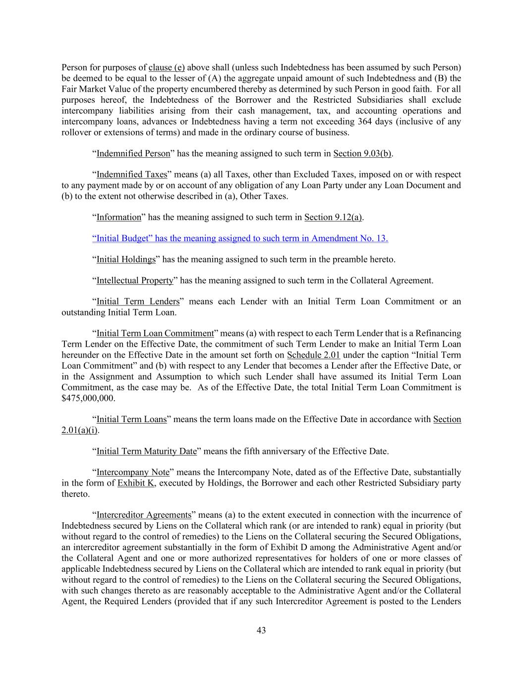 43 Person for purposes of clause (e) above shall (unless such Indebtedness has been assumed by such Person) be deemed to be equal to the lesser of (A) the aggregate unpaid amount of such Indebtedness and (B) the Fair Market Value of the property encumbered thereby as determined by such Person in good faith. For all purposes hereof, the Indebtedness of the Borrower and the Restricted Subsidiaries shall exclude intercompany liabilities arising from their cash management, tax, and accounting operations and intercompany loans, advances or Indebtedness having a term not exceeding 364 days (inclusive of any rollover or extensions of terms) and made in the ordinary course of business. “Indemnified Person” has the meaning assigned to such term in Section 9.03(b). “Indemnified Taxes” means (a) all Taxes, other than Excluded Taxes, imposed on or with respect to any payment made by or on account of any obligation of any Loan Party under any Loan Document and (b) to the extent not otherwise described in (a), Other Taxes. “Information” has the meaning assigned to such term in Section 9.12(a). “Initial Budget” has the meaning assigned to such term in Amendment No. 13. “Initial Holdings” has the meaning assigned to such term in the preamble hereto. “Intellectual Property” has the meaning assigned to such term in the Collateral Agreement. “Initial Term Lenders” means each Lender with an Initial Term Loan Commitment or an outstanding Initial Term Loan. “Initial Term Loan Commitment” means (a) with respect to each Term Lender that is a Refinancing Term Lender on the Effective Date, the commitment of such Term Lender to make an Initial Term Loan hereunder on the Effective Date in the amount set forth on Schedule 2.01 under the caption “Initial Term Loan Commitment” and (b) with respect to any Lender that becomes a Lender after the Effective Date, or in the Assignment and Assumption to which such Lender shall have assumed its Initial Term Loan Commitment, as the case may be. As of the Effective Date, the total Initial Term Loan Commitment is $475,000,000. “Initial Term Loans” means the term loans made on the Effective Date in accordance with Section 2.01(a)(i). “Initial Term Maturity Date” means the fifth anniversary of the Effective Date. “Intercompany Note” means the Intercompany Note, dated as of the Effective Date, substantially in the form of Exhibit K, executed by Holdings, the Borrower and each other Restricted Subsidiary party thereto. “Intercreditor Agreements” means (a) to the extent executed in connection with the incurrence of Indebtedness secured by Liens on the Collateral which rank (or are intended to rank) equal in priority (but without regard to the control of remedies) to the Liens on the Collateral securing the Secured Obligations, an intercreditor agreement substantially in the form of Exhibit D among the Administrative Agent and/or the Collateral Agent and one or more authorized representatives for holders of one or more classes of applicable Indebtedness secured by Liens on the Collateral which are intended to rank equal in priority (but without regard to the control of remedies) to the Liens on the Collateral securing the Secured Obligations, with such changes thereto as are reasonably acceptable to the Administrative Agent and/or the Collateral Agent, the Required Lenders (provided that if any such Intercreditor Agreement is posted to the Lenders