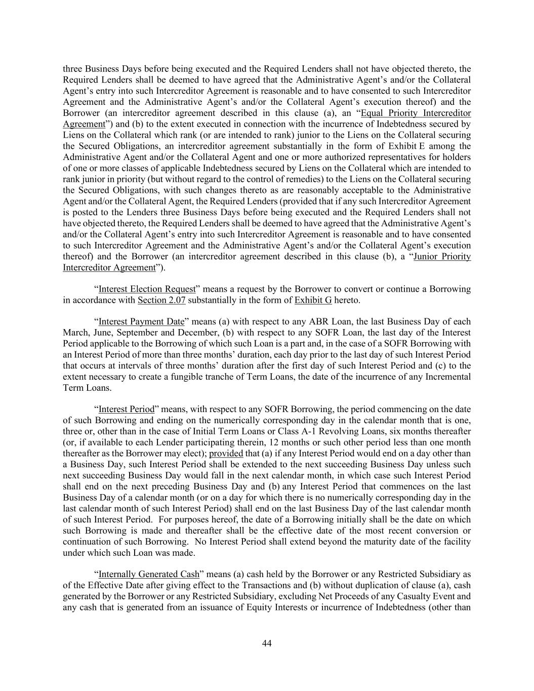 44 three Business Days before being executed and the Required Lenders shall not have objected thereto, the Required Lenders shall be deemed to have agreed that the Administrative Agent’s and/or the Collateral Agent’s entry into such Intercreditor Agreement is reasonable and to have consented to such Intercreditor Agreement and the Administrative Agent’s and/or the Collateral Agent’s execution thereof) and the Borrower (an intercreditor agreement described in this clause (a), an “Equal Priority Intercreditor Agreement”) and (b) to the extent executed in connection with the incurrence of Indebtedness secured by Liens on the Collateral which rank (or are intended to rank) junior to the Liens on the Collateral securing the Secured Obligations, an intercreditor agreement substantially in the form of Exhibit E among the Administrative Agent and/or the Collateral Agent and one or more authorized representatives for holders of one or more classes of applicable Indebtedness secured by Liens on the Collateral which are intended to rank junior in priority (but without regard to the control of remedies) to the Liens on the Collateral securing the Secured Obligations, with such changes thereto as are reasonably acceptable to the Administrative Agent and/or the Collateral Agent, the Required Lenders (provided that if any such Intercreditor Agreement is posted to the Lenders three Business Days before being executed and the Required Lenders shall not have objected thereto, the Required Lenders shall be deemed to have agreed that the Administrative Agent’s and/or the Collateral Agent’s entry into such Intercreditor Agreement is reasonable and to have consented to such Intercreditor Agreement and the Administrative Agent’s and/or the Collateral Agent’s execution thereof) and the Borrower (an intercreditor agreement described in this clause (b), a “Junior Priority Intercreditor Agreement”). “Interest Election Request” means a request by the Borrower to convert or continue a Borrowing in accordance with Section 2.07 substantially in the form of Exhibit G hereto. “Interest Payment Date” means (a) with respect to any ABR Loan, the last Business Day of each March, June, September and December, (b) with respect to any SOFR Loan, the last day of the Interest Period applicable to the Borrowing of which such Loan is a part and, in the case of a SOFR Borrowing with an Interest Period of more than three months’ duration, each day prior to the last day of such Interest Period that occurs at intervals of three months’ duration after the first day of such Interest Period and (c) to the extent necessary to create a fungible tranche of Term Loans, the date of the incurrence of any Incremental Term Loans. “Interest Period” means, with respect to any SOFR Borrowing, the period commencing on the date of such Borrowing and ending on the numerically corresponding day in the calendar month that is one, three or, other than in the case of Initial Term Loans or Class A-1 Revolving Loans, six months thereafter (or, if available to each Lender participating therein, 12 months or such other period less than one month thereafter as the Borrower may elect); provided that (a) if any Interest Period would end on a day other than a Business Day, such Interest Period shall be extended to the next succeeding Business Day unless such next succeeding Business Day would fall in the next calendar month, in which case such Interest Period shall end on the next preceding Business Day and (b) any Interest Period that commences on the last Business Day of a calendar month (or on a day for which there is no numerically corresponding day in the last calendar month of such Interest Period) shall end on the last Business Day of the last calendar month of such Interest Period. For purposes hereof, the date of a Borrowing initially shall be the date on which such Borrowing is made and thereafter shall be the effective date of the most recent conversion or continuation of such Borrowing. No Interest Period shall extend beyond the maturity date of the facility under which such Loan was made. “Internally Generated Cash” means (a) cash held by the Borrower or any Restricted Subsidiary as of the Effective Date after giving effect to the Transactions and (b) without duplication of clause (a), cash generated by the Borrower or any Restricted Subsidiary, excluding Net Proceeds of any Casualty Event and any cash that is generated from an issuance of Equity Interests or incurrence of Indebtedness (other than