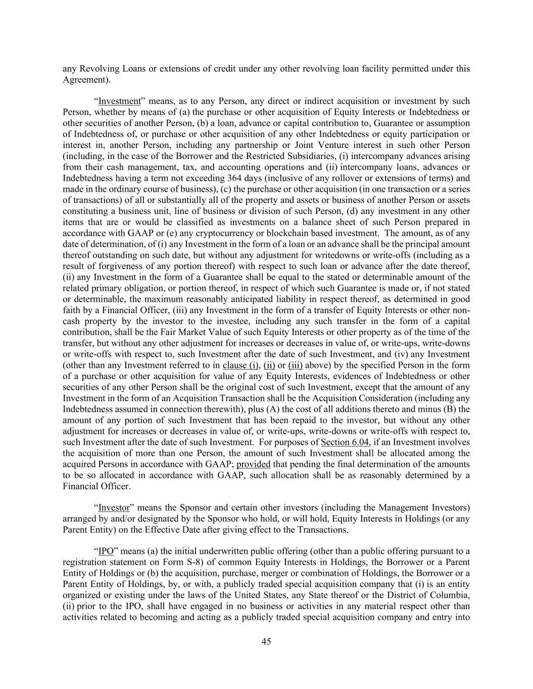 45 any Revolving Loans or extensions of credit under any other revolving loan facility permitted under this Agreement). “Investment” means, as to any Person, any direct or indirect acquisition or investment by such Person, whether by means of (a) the purchase or other acquisition of Equity Interests or Indebtedness or other securities of another Person, (b) a loan, advance or capital contribution to, Guarantee or assumption of Indebtedness of, or purchase or other acquisition of any other Indebtedness or equity participation or interest in, another Person, including any partnership or Joint Venture interest in such other Person (including, in the case of the Borrower and the Restricted Subsidiaries, (i) intercompany advances arising from their cash management, tax, and accounting operations and (ii) intercompany loans, advances or Indebtedness having a term not exceeding 364 days (inclusive of any rollover or extensions of terms) and made in the ordinary course of business), (c) the purchase or other acquisition (in one transaction or a series of transactions) of all or substantially all of the property and assets or business of another Person or assets constituting a business unit, line of business or division of such Person, (d) any investment in any other items that are or would be classified as investments on a balance sheet of such Person prepared in accordance with GAAP or (e) any cryptocurrency or blockchain based investment. The amount, as of any date of determination, of (i) any Investment in the form of a loan or an advance shall be the principal amount thereof outstanding on such date, but without any adjustment for writedowns or write-offs (including as a result of forgiveness of any portion thereof) with respect to such loan or advance after the date thereof, (ii) any Investment in the form of a Guarantee shall be equal to the stated or determinable amount of the related primary obligation, or portion thereof, in respect of which such Guarantee is made or, if not stated or determinable, the maximum reasonably anticipated liability in respect thereof, as determined in good faith by a Financial Officer, (iii) any Investment in the form of a transfer of Equity Interests or other non- cash property by the investor to the investee, including any such transfer in the form of a capital contribution, shall be the Fair Market Value of such Equity Interests or other property as of the time of the transfer, but without any other adjustment for increases or decreases in value of, or write-ups, write-downs or write-offs with respect to, such Investment after the date of such Investment, and (iv) any Investment (other than any Investment referred to in clause (i), (ii) or (iii) above) by the specified Person in the form of a purchase or other acquisition for value of any Equity Interests, evidences of Indebtedness or other securities of any other Person shall be the original cost of such Investment, except that the amount of any Investment in the form of an Acquisition Transaction shall be the Acquisition Consideration (including any Indebtedness assumed in connection therewith), plus (A) the cost of all additions thereto and minus (B) the amount of any portion of such Investment that has been repaid to the investor, but without any other adjustment for increases or decreases in value of, or write-ups, write-downs or write-offs with respect to, such Investment after the date of such Investment. For purposes of Section 6.04, if an Investment involves the acquisition of more than one Person, the amount of such Investment shall be allocated among the acquired Persons in accordance with GAAP; provided that pending the final determination of the amounts to be so allocated in accordance with GAAP, such allocation shall be as reasonably determined by a Financial Officer. “Investor” means the Sponsor and certain other investors (including the Management Investors) arranged by and/or designated by the Sponsor who hold, or will hold, Equity Interests in Holdings (or any Parent Entity) on the Effective Date after giving effect to the Transactions. “IPO” means (a) the initial underwritten public offering (other than a public offering pursuant to a registration statement on Form S-8) of common Equity Interests in Holdings, the Borrower or a Parent Entity of Holdings or (b) the acquisition, purchase, merger or combination of Holdings, the Borrower or a Parent Entity of Holdings, by, or with, a publicly traded special acquisition company that (i) is an entity organized or existing under the laws of the United States, any State thereof or the District of Columbia, (ii) prior to the IPO, shall have engaged in no business or activities in any material respect other than activities related to becoming and acting as a publicly traded special acquisition company and entry into