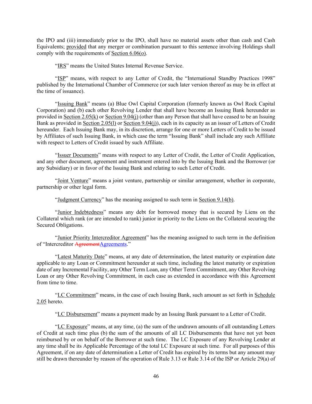 46 the IPO and (iii) immediately prior to the IPO, shall have no material assets other than cash and Cash Equivalents; provided that any merger or combination pursuant to this sentence involving Holdings shall comply with the requirements of Section 6.06(o). “IRS” means the United States Internal Revenue Service. “ISP” means, with respect to any Letter of Credit, the “International Standby Practices 1998” published by the International Chamber of Commerce (or such later version thereof as may be in effect at the time of issuance). “Issuing Bank” means (a) Blue Owl Capital Corporation (formerly known as Owl Rock Capital Corporation) and (b) each other Revolving Lender that shall have become an Issuing Bank hereunder as provided in Section 2.05(k) or Section 9.04(j) (other than any Person that shall have ceased to be an Issuing Bank as provided in Section 2.05(l) or Section 9.04(j)), each in its capacity as an issuer of Letters of Credit hereunder. Each Issuing Bank may, in its discretion, arrange for one or more Letters of Credit to be issued by Affiliates of such Issuing Bank, in which case the term “Issuing Bank” shall include any such Affiliate with respect to Letters of Credit issued by such Affiliate. “Issuer Documents” means with respect to any Letter of Credit, the Letter of Credit Application, and any other document, agreement and instrument entered into by the Issuing Bank and the Borrower (or any Subsidiary) or in favor of the Issuing Bank and relating to such Letter of Credit. “Joint Venture” means a joint venture, partnership or similar arrangement, whether in corporate, partnership or other legal form. “Judgment Currency” has the meaning assigned to such term in Section 9.14(b). “Junior Indebtedness” means any debt for borrowed money that is secured by Liens on the Collateral which rank (or are intended to rank) junior in priority to the Liens on the Collateral securing the Secured Obligations. “Junior Priority Intercreditor Agreement” has the meaning assigned to such term in the definition of “Intercreditor AgreementAgreements.” “Latest Maturity Date” means, at any date of determination, the latest maturity or expiration date applicable to any Loan or Commitment hereunder at such time, including the latest maturity or expiration date of any Incremental Facility, any Other Term Loan, any Other Term Commitment, any Other Revolving Loan or any Other Revolving Commitment, in each case as extended in accordance with this Agreement from time to time. “LC Commitment” means, in the case of each Issuing Bank, such amount as set forth in Schedule 2.05 hereto. “LC Disbursement” means a payment made by an Issuing Bank pursuant to a Letter of Credit. “LC Exposure” means, at any time, (a) the sum of the undrawn amounts of all outstanding Letters of Credit at such time plus (b) the sum of the amounts of all LC Disbursements that have not yet been reimbursed by or on behalf of the Borrower at such time. The LC Exposure of any Revolving Lender at any time shall be its Applicable Percentage of the total LC Exposure at such time. For all purposes of this Agreement, if on any date of determination a Letter of Credit has expired by its terms but any amount may still be drawn thereunder by reason of the operation of Rule 3.13 or Rule 3.14 of the ISP or Article 29(a) of