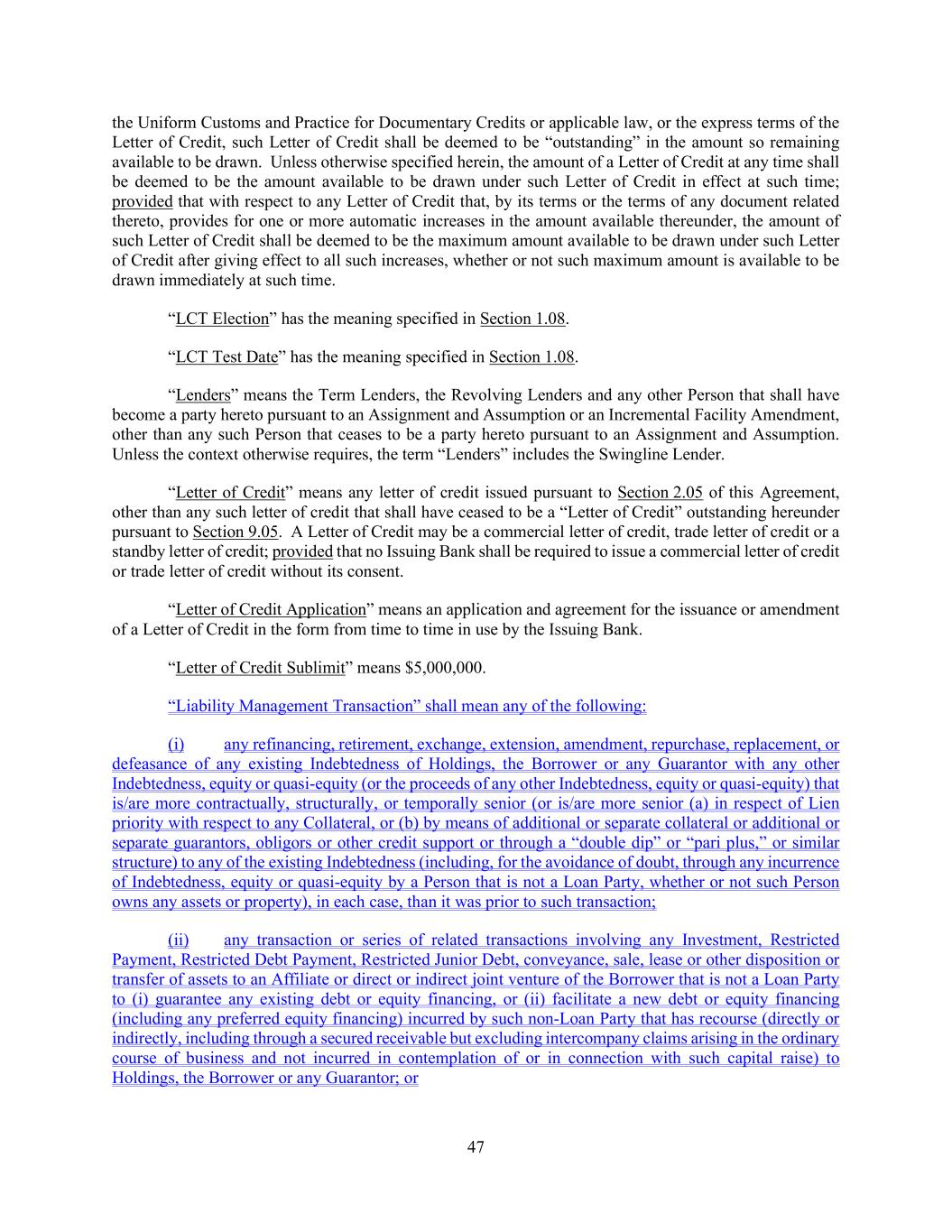 47 the Uniform Customs and Practice for Documentary Credits or applicable law, or the express terms of the Letter of Credit, such Letter of Credit shall be deemed to be “outstanding” in the amount so remaining available to be drawn. Unless otherwise specified herein, the amount of a Letter of Credit at any time shall be deemed to be the amount available to be drawn under such Letter of Credit in effect at such time; provided that with respect to any Letter of Credit that, by its terms or the terms of any document related thereto, provides for one or more automatic increases in the amount available thereunder, the amount of such Letter of Credit shall be deemed to be the maximum amount available to be drawn under such Letter of Credit after giving effect to all such increases, whether or not such maximum amount is available to be drawn immediately at such time. “LCT Election” has the meaning specified in Section 1.08. “LCT Test Date” has the meaning specified in Section 1.08. “Lenders” means the Term Lenders, the Revolving Lenders and any other Person that shall have become a party hereto pursuant to an Assignment and Assumption or an Incremental Facility Amendment, other than any such Person that ceases to be a party hereto pursuant to an Assignment and Assumption. Unless the context otherwise requires, the term “Lenders” includes the Swingline Lender. “Letter of Credit” means any letter of credit issued pursuant to Section 2.05 of this Agreement, other than any such letter of credit that shall have ceased to be a “Letter of Credit” outstanding hereunder pursuant to Section 9.05. A Letter of Credit may be a commercial letter of credit, trade letter of credit or a standby letter of credit; provided that no Issuing Bank shall be required to issue a commercial letter of credit or trade letter of credit without its consent. “Letter of Credit Application” means an application and agreement for the issuance or amendment of a Letter of Credit in the form from time to time in use by the Issuing Bank. “Letter of Credit Sublimit” means $5,000,000. “Liability Management Transaction” shall mean any of the following: (i) any refinancing, retirement, exchange, extension, amendment, repurchase, replacement, or defeasance of any existing Indebtedness of Holdings, the Borrower or any Guarantor with any other Indebtedness, equity or quasi-equity (or the proceeds of any other Indebtedness, equity or quasi-equity) that is/are more contractually, structurally, or temporally senior (or is/are more senior (a) in respect of Lien priority with respect to any Collateral, or (b) by means of additional or separate collateral or additional or separate guarantors, obligors or other credit support or through a “double dip” or “pari plus,” or similar structure) to any of the existing Indebtedness (including, for the avoidance of doubt, through any incurrence of Indebtedness, equity or quasi-equity by a Person that is not a Loan Party, whether or not such Person owns any assets or property), in each case, than it was prior to such transaction; (ii) any transaction or series of related transactions involving any Investment, Restricted Payment, Restricted Debt Payment, Restricted Junior Debt, conveyance, sale, lease or other disposition or transfer of assets to an Affiliate or direct or indirect joint venture of the Borrower that is not a Loan Party to (i) guarantee any existing debt or equity financing, or (ii) facilitate a new debt or equity financing (including any preferred equity financing) incurred by such non-Loan Party that has recourse (directly or indirectly, including through a secured receivable but excluding intercompany claims arising in the ordinary course of business and not incurred in contemplation of or in connection with such capital raise) to Holdings, the Borrower or any Guarantor; or