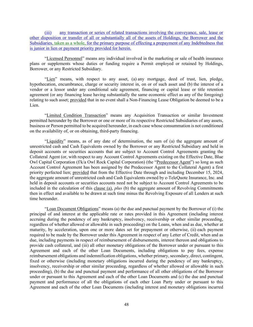 48 (iii) any transaction or series of related transactions involving the conveyance, sale, lease or other disposition or transfer of all or substantially all of the assets of Holdings, the Borrower and the Subsidiaries, taken as a whole, for the primary purpose of effecting a prepayment of any Indebtedness that is junior in lien or payment priority provided for herein. “Licensed Personnel” means any individual involved in the marketing or sale of health insurance plans or supplements whose duties or funding require a Permit employed or retained by Holdings, Borrower, or any Restricted Subsidiary. “Lien” means, with respect to any asset, (a) any mortgage, deed of trust, lien, pledge, hypothecation, encumbrance, charge or security interest in, on or of such asset and (b) the interest of a vendor or a lessor under any conditional sale agreement, financing or capital lease or title retention agreement (or any financing lease having substantially the same economic effect as any of the foregoing) relating to such asset; provided that in no event shall a Non-Financing Lease Obligation be deemed to be a Lien. “Limited Condition Transaction” means any Acquisition Transaction or similar Investment permitted hereunder by the Borrower or one or more of its respective Restricted Subsidiaries of any assets, business or Person permitted to be acquired hereunder, in each case whose consummation is not conditioned on the availability of, or on obtaining, third-party financing. “Liquidity” means, as of any date of determination, the sum of (a) the aggregate amount of unrestricted cash and Cash Equivalents owned by the Borrower or any Restricted Subsidiary and held in deposit accounts or securities accounts that are subject to Account Control Agreements granting the Collateral Agent (or, with respect to any Account Control Agreements existing on the Effective Date, Blue Owl Capital Corporation (f/k/a Owl Rock Capital Corporation) (the “Predecessor Agent”) so long as such Account Control Agreement has been assigned by the Predecessor Agent to the Collateral Agent) a first priority perfected lien; provided that from the Effective Date through and including December 15, 2024, the aggregate amount of unrestricted cash and Cash Equivalents owned by e-TeleQuote Insurance, Inc. and held in deposit accounts or securities accounts need not be subject to Account Control Agreements to be included in the calculation of this clause (a), plus (b) the aggregate amount of Revolving Commitments then in effect and available to be drawn at such time minus the Revolving Exposure of all Lenders at such time hereunder. “Loan Document Obligations” means (a) the due and punctual payment by the Borrower of (i) the principal of and interest at the applicable rate or rates provided in this Agreement (including interest accruing during the pendency of any bankruptcy, insolvency, receivership or other similar proceeding, regardless of whether allowed or allowable in such proceeding) on the Loans, when and as due, whether at maturity, by acceleration, upon one or more dates set for prepayment or otherwise, (ii) each payment required to be made by the Borrower under this Agreement in respect of any Letter of Credit, when and as due, including payments in respect of reimbursement of disbursements, interest thereon and obligations to provide cash collateral, and (iii) all other monetary obligations of the Borrower under or pursuant to this Agreement and each of the other Loan Documents, including obligations to pay fees, expense reimbursement obligations and indemnification obligations, whether primary, secondary, direct, contingent, fixed or otherwise (including monetary obligations incurred during the pendency of any bankruptcy, insolvency, receivership or other similar proceeding, regardless of whether allowed or allowable in such proceeding), (b) the due and punctual payment and performance of all other obligations of the Borrower under or pursuant to this Agreement and each of the other Loan Documents and (c) the due and punctual payment and performance of all the obligations of each other Loan Party under or pursuant to this Agreement and each of the other Loan Documents (including interest and monetary obligations incurred