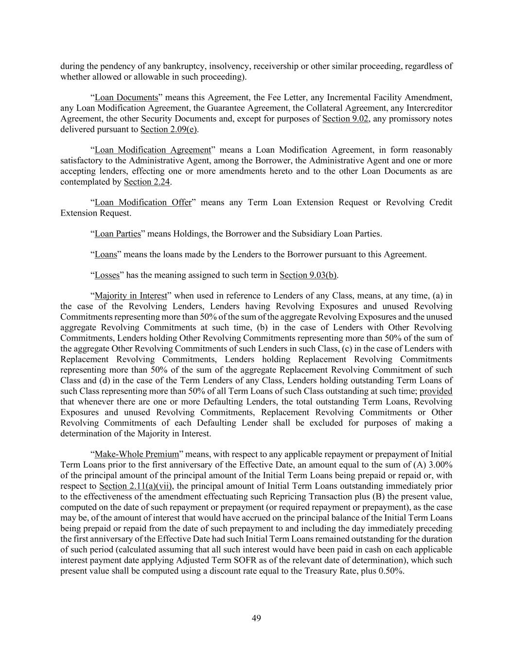 49 during the pendency of any bankruptcy, insolvency, receivership or other similar proceeding, regardless of whether allowed or allowable in such proceeding). “Loan Documents” means this Agreement, the Fee Letter, any Incremental Facility Amendment, any Loan Modification Agreement, the Guarantee Agreement, the Collateral Agreement, any Intercreditor Agreement, the other Security Documents and, except for purposes of Section 9.02, any promissory notes delivered pursuant to Section 2.09(e). “Loan Modification Agreement” means a Loan Modification Agreement, in form reasonably satisfactory to the Administrative Agent, among the Borrower, the Administrative Agent and one or more accepting lenders, effecting one or more amendments hereto and to the other Loan Documents as are contemplated by Section 2.24. “Loan Modification Offer” means any Term Loan Extension Request or Revolving Credit Extension Request. “Loan Parties” means Holdings, the Borrower and the Subsidiary Loan Parties. “Loans” means the loans made by the Lenders to the Borrower pursuant to this Agreement. “Losses” has the meaning assigned to such term in Section 9.03(b). “Majority in Interest” when used in reference to Lenders of any Class, means, at any time, (a) in the case of the Revolving Lenders, Lenders having Revolving Exposures and unused Revolving Commitments representing more than 50% of the sum of the aggregate Revolving Exposures and the unused aggregate Revolving Commitments at such time, (b) in the case of Lenders with Other Revolving Commitments, Lenders holding Other Revolving Commitments representing more than 50% of the sum of the aggregate Other Revolving Commitments of such Lenders in such Class, (c) in the case of Lenders with Replacement Revolving Commitments, Lenders holding Replacement Revolving Commitments representing more than 50% of the sum of the aggregate Replacement Revolving Commitment of such Class and (d) in the case of the Term Lenders of any Class, Lenders holding outstanding Term Loans of such Class representing more than 50% of all Term Loans of such Class outstanding at such time; provided that whenever there are one or more Defaulting Lenders, the total outstanding Term Loans, Revolving Exposures and unused Revolving Commitments, Replacement Revolving Commitments or Other Revolving Commitments of each Defaulting Lender shall be excluded for purposes of making a determination of the Majority in Interest. “Make-Whole Premium” means, with respect to any applicable repayment or prepayment of Initial Term Loans prior to the first anniversary of the Effective Date, an amount equal to the sum of (A) 3.00% of the principal amount of the principal amount of the Initial Term Loans being prepaid or repaid or, with respect to Section 2.11(a)(vii), the principal amount of Initial Term Loans outstanding immediately prior to the effectiveness of the amendment effectuating such Repricing Transaction plus (B) the present value, computed on the date of such repayment or prepayment (or required repayment or prepayment), as the case may be, of the amount of interest that would have accrued on the principal balance of the Initial Term Loans being prepaid or repaid from the date of such prepayment to and including the day immediately preceding the first anniversary of the Effective Date had such Initial Term Loans remained outstanding for the duration of such period (calculated assuming that all such interest would have been paid in cash on each applicable interest payment date applying Adjusted Term SOFR as of the relevant date of determination), which such present value shall be computed using a discount rate equal to the Treasury Rate, plus 0.50%.