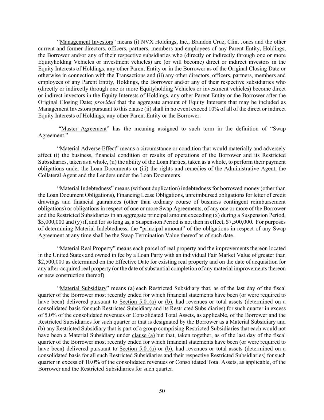 50 “Management Investors” means (i) NVX Holdings, Inc., Brandon Cruz, Clint Jones and the other current and former directors, officers, partners, members and employees of any Parent Entity, Holdings, the Borrower and/or any of their respective subsidiaries who (directly or indirectly through one or more Equityholding Vehicles or investment vehicles) are (or will become) direct or indirect investors in the Equity Interests of Holdings, any other Parent Entity or in the Borrower as of the Original Closing Date or otherwise in connection with the Transactions and (ii) any other directors, officers, partners, members and employees of any Parent Entity, Holdings, the Borrower and/or any of their respective subsidiaries who (directly or indirectly through one or more Equityholding Vehicles or investment vehicles) become direct or indirect investors in the Equity Interests of Holdings, any other Parent Entity or the Borrower after the Original Closing Date; provided that the aggregate amount of Equity Interests that may be included as Management Investors pursuant to this clause (ii) shall in no event exceed 10% of all of the direct or indirect Equity Interests of Holdings, any other Parent Entity or the Borrower. “Master Agreement” has the meaning assigned to such term in the definition of “Swap Agreement.” “Material Adverse Effect” means a circumstance or condition that would materially and adversely affect (i) the business, financial condition or results of operations of the Borrower and its Restricted Subsidiaries, taken as a whole, (ii) the ability of the Loan Parties, taken as a whole, to perform their payment obligations under the Loan Documents or (iii) the rights and remedies of the Administrative Agent, the Collateral Agent and the Lenders under the Loan Documents. “Material Indebtedness” means (without duplication) indebtedness for borrowed money (other than the Loan Document Obligations), Financing Lease Obligations, unreimbursed obligations for letter of credit drawings and financial guarantees (other than ordinary course of business contingent reimbursement obligations) or obligations in respect of one or more Swap Agreements, of any one or more of the Borrower and the Restricted Subsidiaries in an aggregate principal amount exceeding (x) during a Suspension Period, $5,000,000 and (y) if, and for so long as, a Suspension Period is not then in effect, $7,500,000. For purposes of determining Material Indebtedness, the “principal amount” of the obligations in respect of any Swap Agreement at any time shall be the Swap Termination Value thereof as of such date. “Material Real Property” means each parcel of real property and the improvements thereon located in the United States and owned in fee by a Loan Party with an individual Fair Market Value of greater than $2,500,000 as determined on the Effective Date for existing real property and on the date of acquisition for any after-acquired real property (or the date of substantial completion of any material improvements thereon or new construction thereof). “Material Subsidiary” means (a) each Restricted Subsidiary that, as of the last day of the fiscal quarter of the Borrower most recently ended for which financial statements have been (or were required to have been) delivered pursuant to Section 5.01(a) or (b), had revenues or total assets (determined on a consolidated basis for such Restricted Subsidiary and its Restricted Subsidiaries) for such quarter in excess of 5.0% of the consolidated revenues or Consolidated Total Assets, as applicable, of the Borrower and the Restricted Subsidiaries for such quarter or that is designated by the Borrower as a Material Subsidiary and (b) any Restricted Subsidiary that is part of a group comprising Restricted Subsidiaries that each would not have been a Material Subsidiary under clause (a) but that, taken together, as of the last day of the fiscal quarter of the Borrower most recently ended for which financial statements have been (or were required to have been) delivered pursuant to Section 5.01(a) or (b), had revenues or total assets (determined on a consolidated basis for all such Restricted Subsidiaries and their respective Restricted Subsidiaries) for such quarter in excess of 10.0% of the consolidated revenues or Consolidated Total Assets, as applicable, of the Borrower and the Restricted Subsidiaries for such quarter.