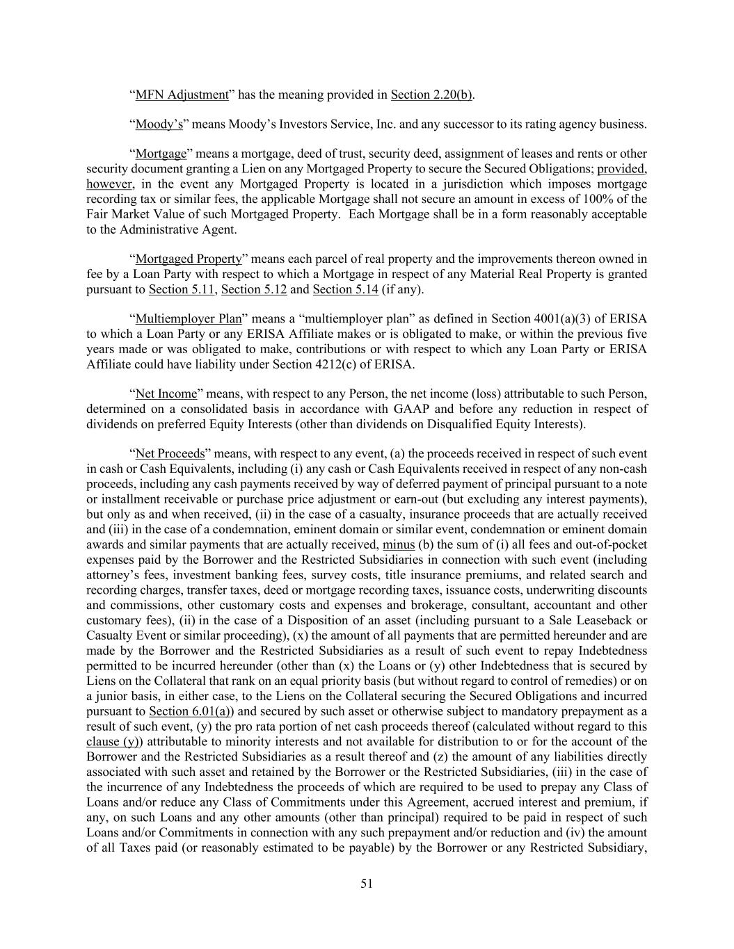 51 “MFN Adjustment” has the meaning provided in Section 2.20(b). “Moody’s” means Moody’s Investors Service, Inc. and any successor to its rating agency business. “Mortgage” means a mortgage, deed of trust, security deed, assignment of leases and rents or other security document granting a Lien on any Mortgaged Property to secure the Secured Obligations; provided, however, in the event any Mortgaged Property is located in a jurisdiction which imposes mortgage recording tax or similar fees, the applicable Mortgage shall not secure an amount in excess of 100% of the Fair Market Value of such Mortgaged Property. Each Mortgage shall be in a form reasonably acceptable to the Administrative Agent. “Mortgaged Property” means each parcel of real property and the improvements thereon owned in fee by a Loan Party with respect to which a Mortgage in respect of any Material Real Property is granted pursuant to Section 5.11, Section 5.12 and Section 5.14 (if any). “Multiemployer Plan” means a “multiemployer plan” as defined in Section 4001(a)(3) of ERISA to which a Loan Party or any ERISA Affiliate makes or is obligated to make, or within the previous five years made or was obligated to make, contributions or with respect to which any Loan Party or ERISA Affiliate could have liability under Section 4212(c) of ERISA. “Net Income” means, with respect to any Person, the net income (loss) attributable to such Person, determined on a consolidated basis in accordance with GAAP and before any reduction in respect of dividends on preferred Equity Interests (other than dividends on Disqualified Equity Interests). “Net Proceeds” means, with respect to any event, (a) the proceeds received in respect of such event in cash or Cash Equivalents, including (i) any cash or Cash Equivalents received in respect of any non-cash proceeds, including any cash payments received by way of deferred payment of principal pursuant to a note or installment receivable or purchase price adjustment or earn-out (but excluding any interest payments), but only as and when received, (ii) in the case of a casualty, insurance proceeds that are actually received and (iii) in the case of a condemnation, eminent domain or similar event, condemnation or eminent domain awards and similar payments that are actually received, minus (b) the sum of (i) all fees and out-of-pocket expenses paid by the Borrower and the Restricted Subsidiaries in connection with such event (including attorney’s fees, investment banking fees, survey costs, title insurance premiums, and related search and recording charges, transfer taxes, deed or mortgage recording taxes, issuance costs, underwriting discounts and commissions, other customary costs and expenses and brokerage, consultant, accountant and other customary fees), (ii) in the case of a Disposition of an asset (including pursuant to a Sale Leaseback or Casualty Event or similar proceeding), (x) the amount of all payments that are permitted hereunder and are made by the Borrower and the Restricted Subsidiaries as a result of such event to repay Indebtedness permitted to be incurred hereunder (other than (x) the Loans or (y) other Indebtedness that is secured by Liens on the Collateral that rank on an equal priority basis (but without regard to control of remedies) or on a junior basis, in either case, to the Liens on the Collateral securing the Secured Obligations and incurred pursuant to Section 6.01(a)) and secured by such asset or otherwise subject to mandatory prepayment as a result of such event, (y) the pro rata portion of net cash proceeds thereof (calculated without regard to this clause (y)) attributable to minority interests and not available for distribution to or for the account of the Borrower and the Restricted Subsidiaries as a result thereof and (z) the amount of any liabilities directly associated with such asset and retained by the Borrower or the Restricted Subsidiaries, (iii) in the case of the incurrence of any Indebtedness the proceeds of which are required to be used to prepay any Class of Loans and/or reduce any Class of Commitments under this Agreement, accrued interest and premium, if any, on such Loans and any other amounts (other than principal) required to be paid in respect of such Loans and/or Commitments in connection with any such prepayment and/or reduction and (iv) the amount of all Taxes paid (or reasonably estimated to be payable) by the Borrower or any Restricted Subsidiary,
