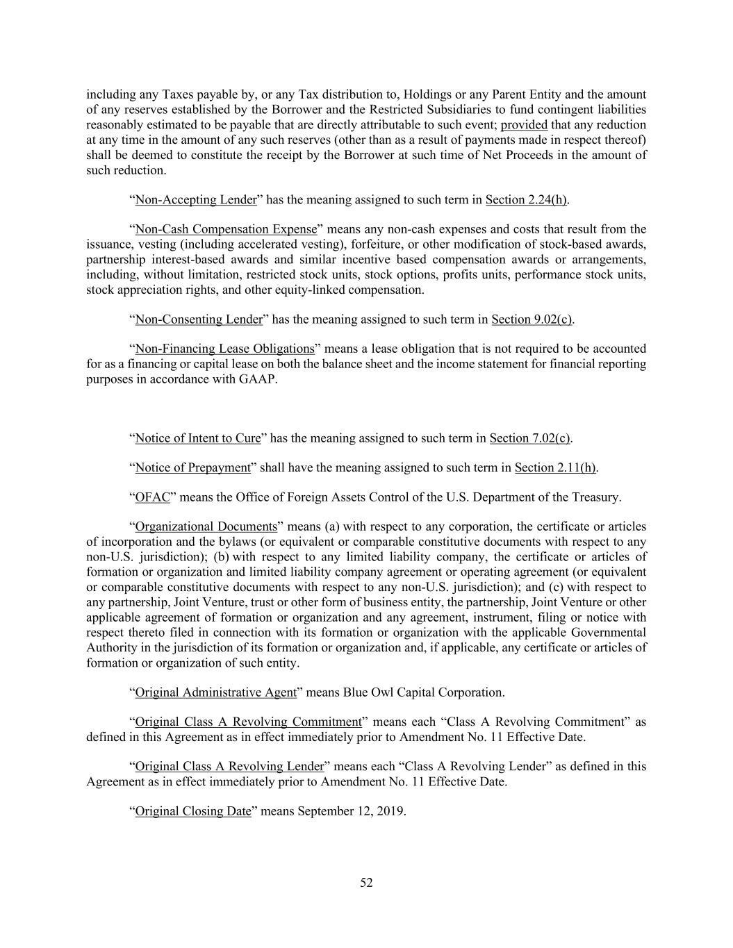 52 including any Taxes payable by, or any Tax distribution to, Holdings or any Parent Entity and the amount of any reserves established by the Borrower and the Restricted Subsidiaries to fund contingent liabilities reasonably estimated to be payable that are directly attributable to such event; provided that any reduction at any time in the amount of any such reserves (other than as a result of payments made in respect thereof) shall be deemed to constitute the receipt by the Borrower at such time of Net Proceeds in the amount of such reduction. “Non-Accepting Lender” has the meaning assigned to such term in Section 2.24(h). “Non-Cash Compensation Expense” means any non-cash expenses and costs that result from the issuance, vesting (including accelerated vesting), forfeiture, or other modification of stock-based awards, partnership interest-based awards and similar incentive based compensation awards or arrangements, including, without limitation, restricted stock units, stock options, profits units, performance stock units, stock appreciation rights, and other equity-linked compensation. “Non-Consenting Lender” has the meaning assigned to such term in Section 9.02(c). “Non-Financing Lease Obligations” means a lease obligation that is not required to be accounted for as a financing or capital lease on both the balance sheet and the income statement for financial reporting purposes in accordance with GAAP. “Notice of Intent to Cure” has the meaning assigned to such term in Section 7.02(c). “Notice of Prepayment” shall have the meaning assigned to such term in Section 2.11(h). “OFAC” means the Office of Foreign Assets Control of the U.S. Department of the Treasury. “Organizational Documents” means (a) with respect to any corporation, the certificate or articles of incorporation and the bylaws (or equivalent or comparable constitutive documents with respect to any non-U.S. jurisdiction); (b) with respect to any limited liability company, the certificate or articles of formation or organization and limited liability company agreement or operating agreement (or equivalent or comparable constitutive documents with respect to any non-U.S. jurisdiction); and (c) with respect to any partnership, Joint Venture, trust or other form of business entity, the partnership, Joint Venture or other applicable agreement of formation or organization and any agreement, instrument, filing or notice with respect thereto filed in connection with its formation or organization with the applicable Governmental Authority in the jurisdiction of its formation or organization and, if applicable, any certificate or articles of formation or organization of such entity. “Original Administrative Agent” means Blue Owl Capital Corporation. “Original Class A Revolving Commitment” means each “Class A Revolving Commitment” as defined in this Agreement as in effect immediately prior to Amendment No. 11 Effective Date. “Original Class A Revolving Lender” means each “Class A Revolving Lender” as defined in this Agreement as in effect immediately prior to Amendment No. 11 Effective Date. “Original Closing Date” means September 12, 2019.