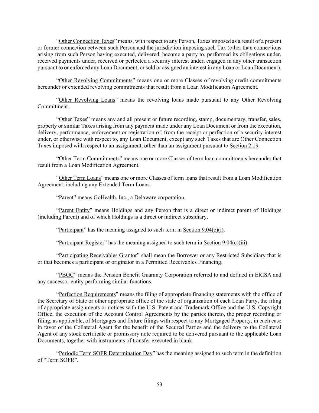 53 “Other Connection Taxes” means, with respect to any Person, Taxes imposed as a result of a present or former connection between such Person and the jurisdiction imposing such Tax (other than connections arising from such Person having executed, delivered, become a party to, performed its obligations under, received payments under, received or perfected a security interest under, engaged in any other transaction pursuant to or enforced any Loan Document, or sold or assigned an interest in any Loan or Loan Document). “Other Revolving Commitments” means one or more Classes of revolving credit commitments hereunder or extended revolving commitments that result from a Loan Modification Agreement. “Other Revolving Loans” means the revolving loans made pursuant to any Other Revolving Commitment. “Other Taxes” means any and all present or future recording, stamp, documentary, transfer, sales, property or similar Taxes arising from any payment made under any Loan Document or from the execution, delivery, performance, enforcement or registration of, from the receipt or perfection of a security interest under, or otherwise with respect to, any Loan Document, except any such Taxes that are Other Connection Taxes imposed with respect to an assignment, other than an assignment pursuant to Section 2.19. “Other Term Commitments” means one or more Classes of term loan commitments hereunder that result from a Loan Modification Agreement. “Other Term Loans” means one or more Classes of term loans that result from a Loan Modification Agreement, including any Extended Term Loans. “Parent” means GoHealth, Inc., a Delaware corporation. “Parent Entity” means Holdings and any Person that is a direct or indirect parent of Holdings (including Parent) and of which Holdings is a direct or indirect subsidiary. “Participant” has the meaning assigned to such term in Section 9.04(c)(i). “Participant Register” has the meaning assigned to such term in Section 9.04(c)(iii). “Participating Receivables Grantor” shall mean the Borrower or any Restricted Subsidiary that is or that becomes a participant or originator in a Permitted Receivables Financing. “PBGC” means the Pension Benefit Guaranty Corporation referred to and defined in ERISA and any successor entity performing similar functions. “Perfection Requirements” means the filing of appropriate financing statements with the office of the Secretary of State or other appropriate office of the state of organization of each Loan Party, the filing of appropriate assignments or notices with the U.S. Patent and Trademark Office and the U.S. Copyright Office, the execution of the Account Control Agreements by the parties thereto, the proper recording or filing, as applicable, of Mortgages and fixture filings with respect to any Mortgaged Property, in each case in favor of the Collateral Agent for the benefit of the Secured Parties and the delivery to the Collateral Agent of any stock certificate or promissory note required to be delivered pursuant to the applicable Loan Documents, together with instruments of transfer executed in blank. “Periodic Term SOFR Determination Day” has the meaning assigned to such term in the definition of “Term SOFR”.