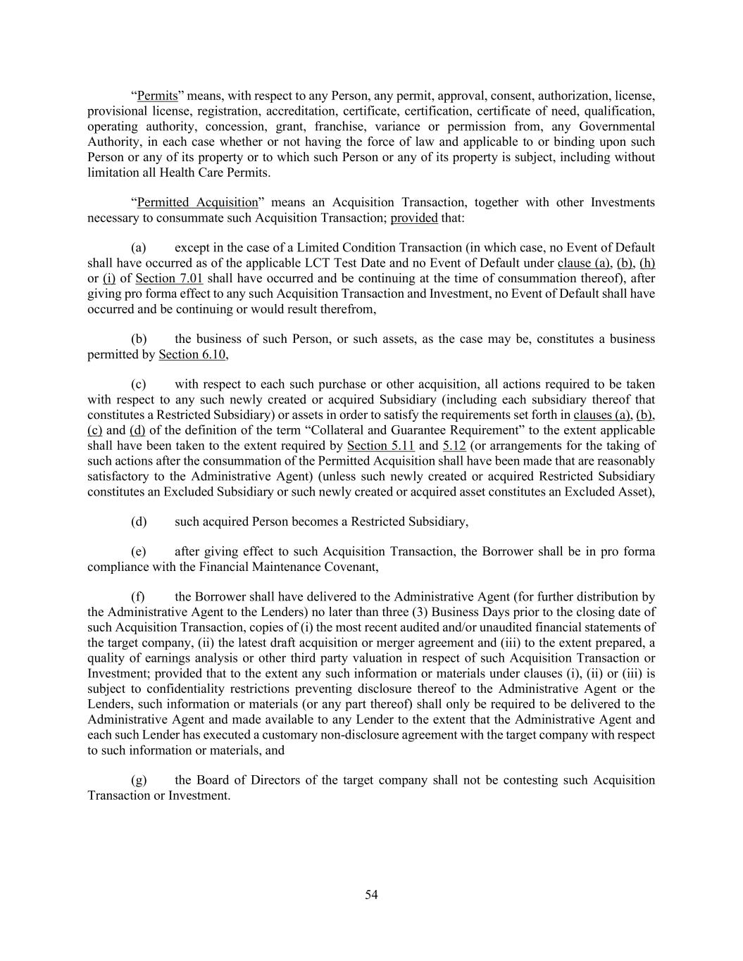 54 “Permits” means, with respect to any Person, any permit, approval, consent, authorization, license, provisional license, registration, accreditation, certificate, certification, certificate of need, qualification, operating authority, concession, grant, franchise, variance or permission from, any Governmental Authority, in each case whether or not having the force of law and applicable to or binding upon such Person or any of its property or to which such Person or any of its property is subject, including without limitation all Health Care Permits. “Permitted Acquisition” means an Acquisition Transaction, together with other Investments necessary to consummate such Acquisition Transaction; provided that: (a) except in the case of a Limited Condition Transaction (in which case, no Event of Default shall have occurred as of the applicable LCT Test Date and no Event of Default under clause (a), (b), (h) or (i) of Section 7.01 shall have occurred and be continuing at the time of consummation thereof), after giving pro forma effect to any such Acquisition Transaction and Investment, no Event of Default shall have occurred and be continuing or would result therefrom, (b) the business of such Person, or such assets, as the case may be, constitutes a business permitted by Section 6.10, (c) with respect to each such purchase or other acquisition, all actions required to be taken with respect to any such newly created or acquired Subsidiary (including each subsidiary thereof that constitutes a Restricted Subsidiary) or assets in order to satisfy the requirements set forth in clauses (a), (b), (c) and (d) of the definition of the term “Collateral and Guarantee Requirement” to the extent applicable shall have been taken to the extent required by Section 5.11 and 5.12 (or arrangements for the taking of such actions after the consummation of the Permitted Acquisition shall have been made that are reasonably satisfactory to the Administrative Agent) (unless such newly created or acquired Restricted Subsidiary constitutes an Excluded Subsidiary or such newly created or acquired asset constitutes an Excluded Asset), (d) such acquired Person becomes a Restricted Subsidiary, (e) after giving effect to such Acquisition Transaction, the Borrower shall be in pro forma compliance with the Financial Maintenance Covenant, (f) the Borrower shall have delivered to the Administrative Agent (for further distribution by the Administrative Agent to the Lenders) no later than three (3) Business Days prior to the closing date of such Acquisition Transaction, copies of (i) the most recent audited and/or unaudited financial statements of the target company, (ii) the latest draft acquisition or merger agreement and (iii) to the extent prepared, a quality of earnings analysis or other third party valuation in respect of such Acquisition Transaction or Investment; provided that to the extent any such information or materials under clauses (i), (ii) or (iii) is subject to confidentiality restrictions preventing disclosure thereof to the Administrative Agent or the Lenders, such information or materials (or any part thereof) shall only be required to be delivered to the Administrative Agent and made available to any Lender to the extent that the Administrative Agent and each such Lender has executed a customary non-disclosure agreement with the target company with respect to such information or materials, and (g) the Board of Directors of the target company shall not be contesting such Acquisition Transaction or Investment.