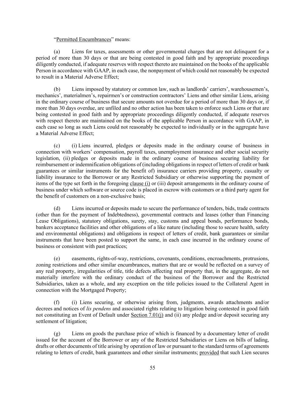 55 “Permitted Encumbrances” means: (a) Liens for taxes, assessments or other governmental charges that are not delinquent for a period of more than 30 days or that are being contested in good faith and by appropriate proceedings diligently conducted, if adequate reserves with respect thereto are maintained on the books of the applicable Person in accordance with GAAP, in each case, the nonpayment of which could not reasonably be expected to result in a Material Adverse Effect; (b) Liens imposed by statutory or common law, such as landlords’ carriers’, warehousemen’s, mechanics’, materialmen’s, repairmen’s or construction contractors’ Liens and other similar Liens, arising in the ordinary course of business that secure amounts not overdue for a period of more than 30 days or, if more than 30 days overdue, are unfiled and no other action has been taken to enforce such Liens or that are being contested in good faith and by appropriate proceedings diligently conducted, if adequate reserves with respect thereto are maintained on the books of the applicable Person in accordance with GAAP, in each case so long as such Liens could not reasonably be expected to individually or in the aggregate have a Material Adverse Effect; (c) (i) Liens incurred, pledges or deposits made in the ordinary course of business in connection with workers’ compensation, payroll taxes, unemployment insurance and other social security legislation, (ii) pledges or deposits made in the ordinary course of business securing liability for reimbursement or indemnification obligations of (including obligations in respect of letters of credit or bank guarantees or similar instruments for the benefit of) insurance carriers providing property, casualty or liability insurance to the Borrower or any Restricted Subsidiary or otherwise supporting the payment of items of the type set forth in the foregoing clause (i) or (iii) deposit arrangements in the ordinary course of business under which software or source code is placed in escrow with customers or a third party agent for the benefit of customers on a non-exclusive basis; (d) Liens incurred or deposits made to secure the performance of tenders, bids, trade contracts (other than for the payment of Indebtedness), governmental contracts and leases (other than Financing Lease Obligations), statutory obligations, surety, stay, customs and appeal bonds, performance bonds, bankers acceptance facilities and other obligations of a like nature (including those to secure health, safety and environmental obligations) and obligations in respect of letters of credit, bank guarantees or similar instruments that have been posted to support the same, in each case incurred in the ordinary course of business or consistent with past practices; (e) easements, rights-of-way, restrictions, covenants, conditions, encroachments, protrusions, zoning restrictions and other similar encumbrances, matters that are or would be reflected on a survey of any real property, irregularities of title, title defects affecting real property that, in the aggregate, do not materially interfere with the ordinary conduct of the business of the Borrower and the Restricted Subsidiaries, taken as a whole, and any exception on the title policies issued to the Collateral Agent in connection with the Mortgaged Property; (f) (i) Liens securing, or otherwise arising from, judgments, awards attachments and/or decrees and notices of lis pendens and associated rights relating to litigation being contested in good faith not constituting an Event of Default under Section 7.01(j) and (ii) any pledge and/or deposit securing any settlement of litigation; (g) Liens on goods the purchase price of which is financed by a documentary letter of credit issued for the account of the Borrower or any of the Restricted Subsidiaries or Liens on bills of lading, drafts or other documents of title arising by operation of law or pursuant to the standard terms of agreements relating to letters of credit, bank guarantees and other similar instruments; provided that such Lien secures