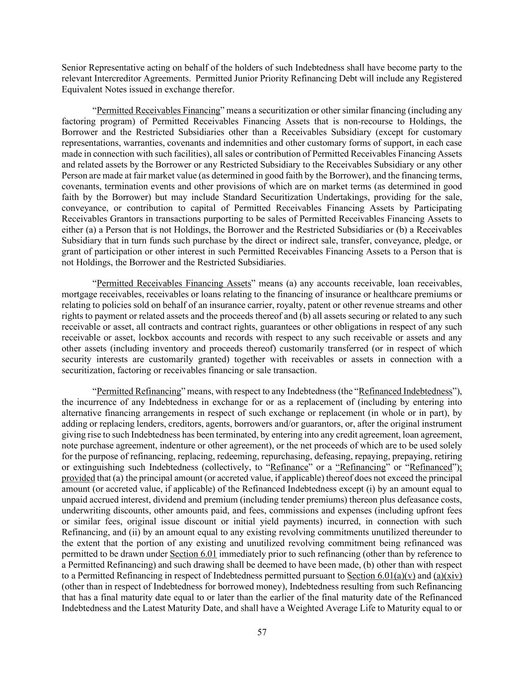 57 Senior Representative acting on behalf of the holders of such Indebtedness shall have become party to the relevant Intercreditor Agreements. Permitted Junior Priority Refinancing Debt will include any Registered Equivalent Notes issued in exchange therefor. “Permitted Receivables Financing” means a securitization or other similar financing (including any factoring program) of Permitted Receivables Financing Assets that is non-recourse to Holdings, the Borrower and the Restricted Subsidiaries other than a Receivables Subsidiary (except for customary representations, warranties, covenants and indemnities and other customary forms of support, in each case made in connection with such facilities), all sales or contribution of Permitted Receivables Financing Assets and related assets by the Borrower or any Restricted Subsidiary to the Receivables Subsidiary or any other Person are made at fair market value (as determined in good faith by the Borrower), and the financing terms, covenants, termination events and other provisions of which are on market terms (as determined in good faith by the Borrower) but may include Standard Securitization Undertakings, providing for the sale, conveyance, or contribution to capital of Permitted Receivables Financing Assets by Participating Receivables Grantors in transactions purporting to be sales of Permitted Receivables Financing Assets to either (a) a Person that is not Holdings, the Borrower and the Restricted Subsidiaries or (b) a Receivables Subsidiary that in turn funds such purchase by the direct or indirect sale, transfer, conveyance, pledge, or grant of participation or other interest in such Permitted Receivables Financing Assets to a Person that is not Holdings, the Borrower and the Restricted Subsidiaries. “Permitted Receivables Financing Assets” means (a) any accounts receivable, loan receivables, mortgage receivables, receivables or loans relating to the financing of insurance or healthcare premiums or relating to policies sold on behalf of an insurance carrier, royalty, patent or other revenue streams and other rights to payment or related assets and the proceeds thereof and (b) all assets securing or related to any such receivable or asset, all contracts and contract rights, guarantees or other obligations in respect of any such receivable or asset, lockbox accounts and records with respect to any such receivable or assets and any other assets (including inventory and proceeds thereof) customarily transferred (or in respect of which security interests are customarily granted) together with receivables or assets in connection with a securitization, factoring or receivables financing or sale transaction. “Permitted Refinancing” means, with respect to any Indebtedness (the “Refinanced Indebtedness”), the incurrence of any Indebtedness in exchange for or as a replacement of (including by entering into alternative financing arrangements in respect of such exchange or replacement (in whole or in part), by adding or replacing lenders, creditors, agents, borrowers and/or guarantors, or, after the original instrument giving rise to such Indebtedness has been terminated, by entering into any credit agreement, loan agreement, note purchase agreement, indenture or other agreement), or the net proceeds of which are to be used solely for the purpose of refinancing, replacing, redeeming, repurchasing, defeasing, repaying, prepaying, retiring or extinguishing such Indebtedness (collectively, to “Refinance” or a “Refinancing” or “Refinanced”); provided that (a) the principal amount (or accreted value, if applicable) thereof does not exceed the principal amount (or accreted value, if applicable) of the Refinanced Indebtedness except (i) by an amount equal to unpaid accrued interest, dividend and premium (including tender premiums) thereon plus defeasance costs, underwriting discounts, other amounts paid, and fees, commissions and expenses (including upfront fees or similar fees, original issue discount or initial yield payments) incurred, in connection with such Refinancing, and (ii) by an amount equal to any existing revolving commitments unutilized thereunder to the extent that the portion of any existing and unutilized revolving commitment being refinanced was permitted to be drawn under Section 6.01 immediately prior to such refinancing (other than by reference to a Permitted Refinancing) and such drawing shall be deemed to have been made, (b) other than with respect to a Permitted Refinancing in respect of Indebtedness permitted pursuant to Section 6.01(a)(v) and (a)(xiv) (other than in respect of Indebtedness for borrowed money), Indebtedness resulting from such Refinancing that has a final maturity date equal to or later than the earlier of the final maturity date of the Refinanced Indebtedness and the Latest Maturity Date, and shall have a Weighted Average Life to Maturity equal to or