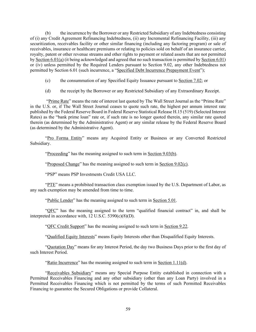 59 (b) the incurrence by the Borrower or any Restricted Subsidiary of any Indebtedness consisting of (i) any Credit Agreement Refinancing Indebtedness, (ii) any Incremental Refinancing Facility, (iii) any securitization, receivables facility or other similar financing (including any factoring program) or sale of receivables, insurance or healthcare premiums or relating to policies sold on behalf of an insurance carrier, royalty, patent or other revenue streams and other rights to payment or related assets that are not permitted by Section 6.01(a) (it being acknowledged and agreed that no such transaction is permitted by Section 6.01) or (iv) unless permitted by the Required Lenders pursuant to Section 9.02, any other Indebtedness not permitted by Section 6.01 (such incurrence, a “Specified Debt Incurrence Prepayment Event”); (c) the consummation of any Specified Equity Issuance pursuant to Section 7.02; or (d) the receipt by the Borrower or any Restricted Subsidiary of any Extraordinary Receipt. “Prime Rate” means the rate of interest last quoted by The Wall Street Journal as the “Prime Rate” in the U.S. or, if The Wall Street Journal ceases to quote such rate, the highest per annum interest rate published by the Federal Reserve Board in Federal Reserve Statistical Release H.15 (519) (Selected Interest Rates) as the “bank prime loan” rate or, if such rate is no longer quoted therein, any similar rate quoted therein (as determined by the Administrative Agent) or any similar release by the Federal Reserve Board (as determined by the Administrative Agent). “Pro Forma Entity” means any Acquired Entity or Business or any Converted Restricted Subsidiary. “Proceeding” has the meaning assigned to such term in Section 9.03(b). “Proposed Change” has the meaning assigned to such term in Section 9.02(c). “PSP” means PSP Investments Credit USA LLC. “PTE” means a prohibited transaction class exemption issued by the U.S. Department of Labor, as any such exemption may be amended from time to time. “Public Lender” has the meaning assigned to such term in Section 5.01. “QFC” has the meaning assigned to the term “qualified financial contract” in, and shall be interpreted in accordance with, 12 U.S.C. 5390(c)(8)(D). “QFC Credit Support” has the meaning assigned to such term in Section 9.22. “Qualified Equity Interests” means Equity Interests other than Disqualified Equity Interests. “Quotation Day” means for any Interest Period, the day two Business Days prior to the first day of such Interest Period. “Ratio Incurrence” has the meaning assigned to such term in Section 1.11(d). “Receivables Subsidiary” means any Special Purpose Entity established in connection with a Permitted Receivables Financing and any other subsidiary (other than any Loan Party) involved in a Permitted Receivables Financing which is not permitted by the terms of such Permitted Receivables Financing to guarantee the Secured Obligations or provide Collateral.