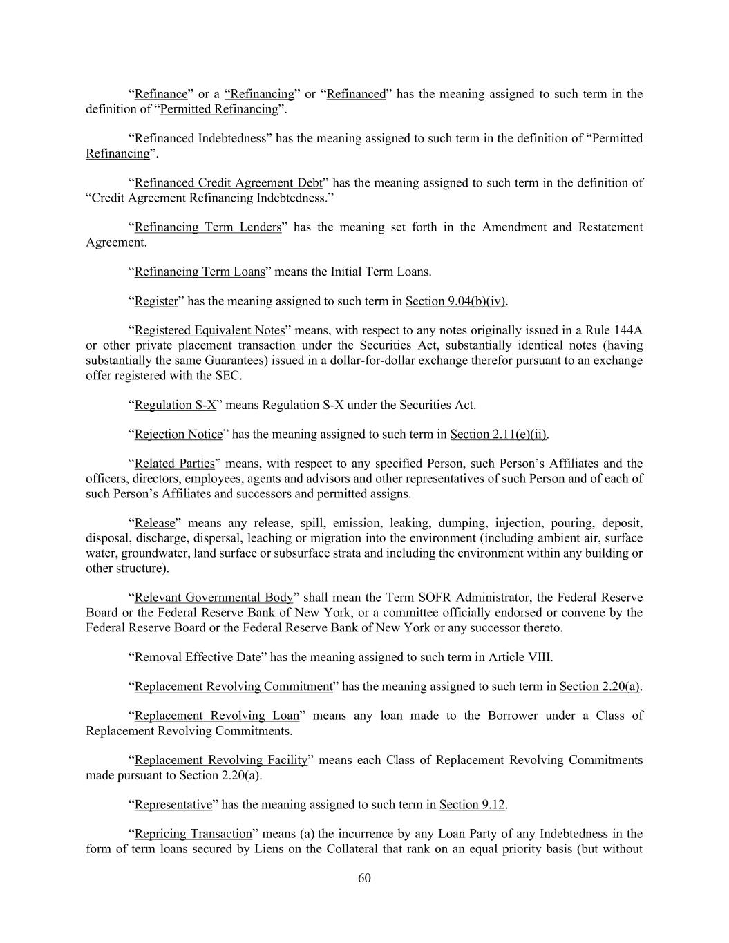 60 “Refinance” or a “Refinancing” or “Refinanced” has the meaning assigned to such term in the definition of “Permitted Refinancing”. “Refinanced Indebtedness” has the meaning assigned to such term in the definition of “Permitted Refinancing”. “Refinanced Credit Agreement Debt” has the meaning assigned to such term in the definition of “Credit Agreement Refinancing Indebtedness.” “Refinancing Term Lenders” has the meaning set forth in the Amendment and Restatement Agreement. “Refinancing Term Loans” means the Initial Term Loans. “Register” has the meaning assigned to such term in Section 9.04(b)(iv). “Registered Equivalent Notes” means, with respect to any notes originally issued in a Rule 144A or other private placement transaction under the Securities Act, substantially identical notes (having substantially the same Guarantees) issued in a dollar-for-dollar exchange therefor pursuant to an exchange offer registered with the SEC. “Regulation S-X” means Regulation S-X under the Securities Act. “Rejection Notice” has the meaning assigned to such term in Section 2.11(e)(ii). “Related Parties” means, with respect to any specified Person, such Person’s Affiliates and the officers, directors, employees, agents and advisors and other representatives of such Person and of each of such Person’s Affiliates and successors and permitted assigns. “Release” means any release, spill, emission, leaking, dumping, injection, pouring, deposit, disposal, discharge, dispersal, leaching or migration into the environment (including ambient air, surface water, groundwater, land surface or subsurface strata and including the environment within any building or other structure). “Relevant Governmental Body” shall mean the Term SOFR Administrator, the Federal Reserve Board or the Federal Reserve Bank of New York, or a committee officially endorsed or convene by the Federal Reserve Board or the Federal Reserve Bank of New York or any successor thereto. “Removal Effective Date” has the meaning assigned to such term in Article VIII. “Replacement Revolving Commitment” has the meaning assigned to such term in Section 2.20(a). “Replacement Revolving Loan” means any loan made to the Borrower under a Class of Replacement Revolving Commitments. “Replacement Revolving Facility” means each Class of Replacement Revolving Commitments made pursuant to Section 2.20(a). “Representative” has the meaning assigned to such term in Section 9.12. “Repricing Transaction” means (a) the incurrence by any Loan Party of any Indebtedness in the form of term loans secured by Liens on the Collateral that rank on an equal priority basis (but without