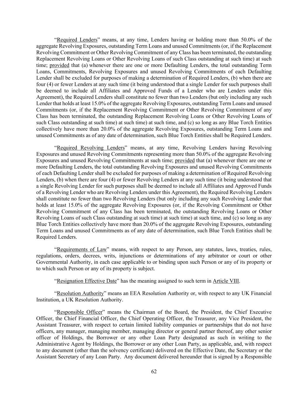 62 “Required Lenders” means, at any time, Lenders having or holding more than 50.0% of the aggregate Revolving Exposures, outstanding Term Loans and unused Commitments (or, if the Replacement Revolving Commitment or Other Revolving Commitment of any Class has been terminated, the outstanding Replacement Revolving Loans or Other Revolving Loans of such Class outstanding at such time) at such time; provided that (a) whenever there are one or more Defaulting Lenders, the total outstanding Term Loans, Commitments, Revolving Exposures and unused Revolving Commitments of each Defaulting Lender shall be excluded for purposes of making a determination of Required Lenders, (b) when there are four (4) or fewer Lenders at any such time (it being understood that a single Lender for such purposes shall be deemed to include all Affiliates and Approved Funds of a Lender who are Lenders under this Agreement), the Required Lenders shall constitute no fewer than two Lenders (but only including any such Lender that holds at least 15.0% of the aggregate Revolving Exposures, outstanding Term Loans and unused Commitments (or, if the Replacement Revolving Commitment or Other Revolving Commitment of any Class has been terminated, the outstanding Replacement Revolving Loans or Other Revolving Loans of such Class outstanding at such time) at such time) at such time, and (c) so long as any Blue Torch Entities collectively have more than 20.0% of the aggregate Revolving Exposures, outstanding Term Loans and unused Commitments as of any date of determination, such Blue Torch Entities shall be Required Lenders. “Required Revolving Lenders” means, at any time, Revolving Lenders having Revolving Exposures and unused Revolving Commitments representing more than 50.0% of the aggregate Revolving Exposures and unused Revolving Commitments at such time; provided that (a) whenever there are one or more Defaulting Lenders, the total outstanding Revolving Exposures and unused Revolving Commitments of each Defaulting Lender shall be excluded for purposes of making a determination of Required Revolving Lenders, (b) when there are four (4) or fewer Revolving Lenders at any such time (it being understood that a single Revolving Lender for such purposes shall be deemed to include all Affiliates and Approved Funds of a Revolving Lender who are Revolving Lenders under this Agreement), the Required Revolving Lenders shall constitute no fewer than two Revolving Lenders (but only including any such Revolving Lender that holds at least 15.0% of the aggregate Revolving Exposures (or, if the Revolving Commitment or Other Revolving Commitment of any Class has been terminated, the outstanding Revolving Loans or Other Revolving Loans of such Class outstanding at such time) at such time) at such time, and (c) so long as any Blue Torch Entities collectively have more than 20.0% of the aggregate Revolving Exposures, outstanding Term Loans and unused Commitments as of any date of determination, such Blue Torch Entities shall be Required Lenders. “Requirements of Law” means, with respect to any Person, any statutes, laws, treaties, rules, regulations, orders, decrees, writs, injunctions or determinations of any arbitrator or court or other Governmental Authority, in each case applicable to or binding upon such Person or any of its property or to which such Person or any of its property is subject. “Resignation Effective Date” has the meaning assigned to such term in Article VIII. “Resolution Authority” means an EEA Resolution Authority or, with respect to any UK Financial Institution, a UK Resolution Authority. “Responsible Officer” means the Chairman of the Board, the President, the Chief Executive Officer, the Chief Financial Officer, the Chief Operating Officer, the Treasurer, any Vice President, the Assistant Treasurer, with respect to certain limited liability companies or partnerships that do not have officers, any manager, managing member, managing director or general partner thereof, any other senior officer of Holdings, the Borrower or any other Loan Party designated as such in writing to the Administrative Agent by Holdings, the Borrower or any other Loan Party, as applicable, and, with respect to any document (other than the solvency certificate) delivered on the Effective Date, the Secretary or the Assistant Secretary of any Loan Party. Any document delivered hereunder that is signed by a Responsible