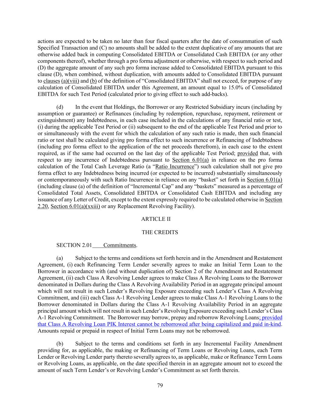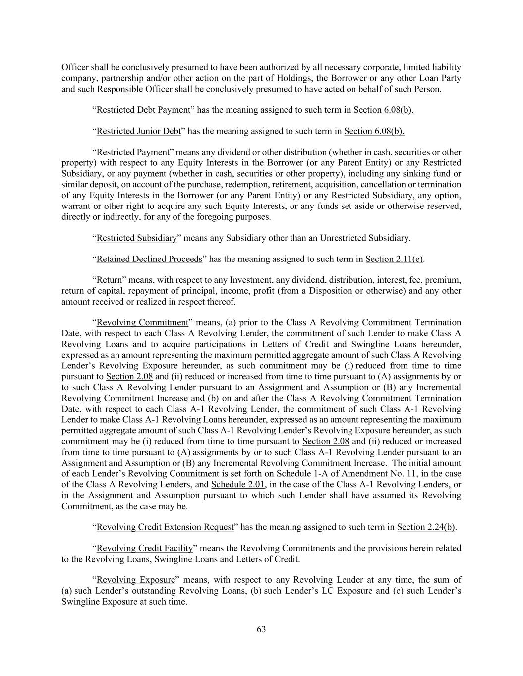 63 Officer shall be conclusively presumed to have been authorized by all necessary corporate, limited liability company, partnership and/or other action on the part of Holdings, the Borrower or any other Loan Party and such Responsible Officer shall be conclusively presumed to have acted on behalf of such Person. “Restricted Debt Payment” has the meaning assigned to such term in Section 6.08(b). “Restricted Junior Debt” has the meaning assigned to such term in Section 6.08(b). “Restricted Payment” means any dividend or other distribution (whether in cash, securities or other property) with respect to any Equity Interests in the Borrower (or any Parent Entity) or any Restricted Subsidiary, or any payment (whether in cash, securities or other property), including any sinking fund or similar deposit, on account of the purchase, redemption, retirement, acquisition, cancellation or termination of any Equity Interests in the Borrower (or any Parent Entity) or any Restricted Subsidiary, any option, warrant or other right to acquire any such Equity Interests, or any funds set aside or otherwise reserved, directly or indirectly, for any of the foregoing purposes. “Restricted Subsidiary” means any Subsidiary other than an Unrestricted Subsidiary. “Retained Declined Proceeds” has the meaning assigned to such term in Section 2.11(e). “Return” means, with respect to any Investment, any dividend, distribution, interest, fee, premium, return of capital, repayment of principal, income, profit (from a Disposition or otherwise) and any other amount received or realized in respect thereof. “Revolving Commitment” means, (a) prior to the Class A Revolving Commitment Termination Date, with respect to each Class A Revolving Lender, the commitment of such Lender to make Class A Revolving Loans and to acquire participations in Letters of Credit and Swingline Loans hereunder, expressed as an amount representing the maximum permitted aggregate amount of such Class A Revolving Lender’s Revolving Exposure hereunder, as such commitment may be (i) reduced from time to time pursuant to Section 2.08 and (ii) reduced or increased from time to time pursuant to (A) assignments by or to such Class A Revolving Lender pursuant to an Assignment and Assumption or (B) any Incremental Revolving Commitment Increase and (b) on and after the Class A Revolving Commitment Termination Date, with respect to each Class A-1 Revolving Lender, the commitment of such Class A-1 Revolving Lender to make Class A-1 Revolving Loans hereunder, expressed as an amount representing the maximum permitted aggregate amount of such Class A-1 Revolving Lender’s Revolving Exposure hereunder, as such commitment may be (i) reduced from time to time pursuant to Section 2.08 and (ii) reduced or increased from time to time pursuant to (A) assignments by or to such Class A-1 Revolving Lender pursuant to an Assignment and Assumption or (B) any Incremental Revolving Commitment Increase. The initial amount of each Lender’s Revolving Commitment is set forth on Schedule 1-A of Amendment No. 11, in the case of the Class A Revolving Lenders, and Schedule 2.01, in the case of the Class A-1 Revolving Lenders, or in the Assignment and Assumption pursuant to which such Lender shall have assumed its Revolving Commitment, as the case may be. “Revolving Credit Extension Request” has the meaning assigned to such term in Section 2.24(b). “Revolving Credit Facility” means the Revolving Commitments and the provisions herein related to the Revolving Loans, Swingline Loans and Letters of Credit. “Revolving Exposure” means, with respect to any Revolving Lender at any time, the sum of (a) such Lender’s outstanding Revolving Loans, (b) such Lender’s LC Exposure and (c) such Lender’s Swingline Exposure at such time.