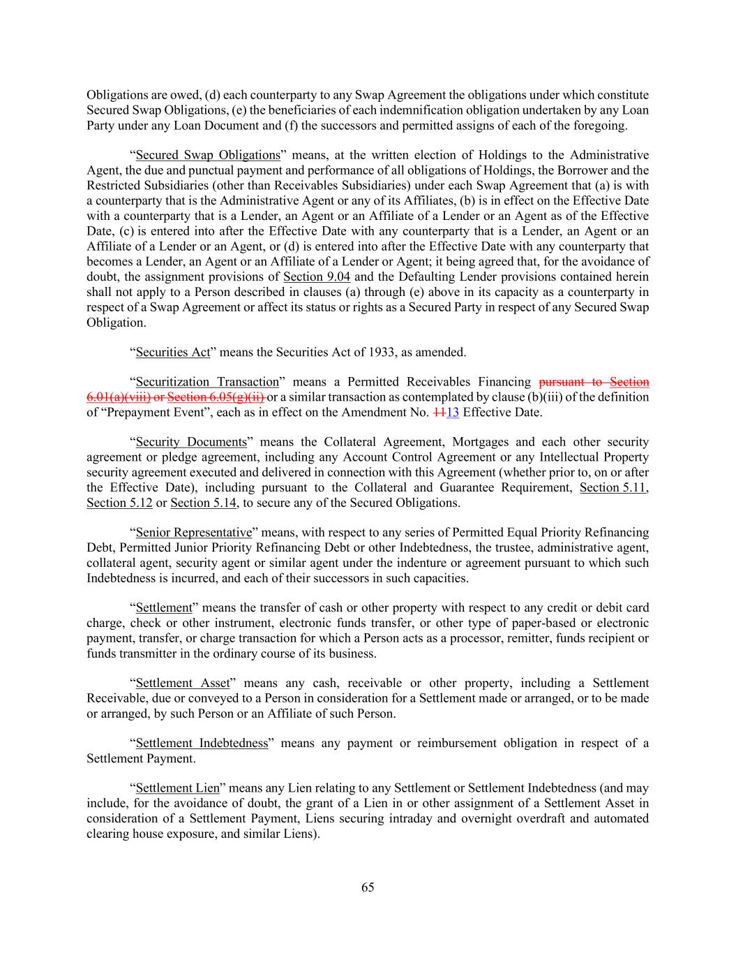 65 Obligations are owed, (d) each counterparty to any Swap Agreement the obligations under which constitute Secured Swap Obligations, (e) the beneficiaries of each indemnification obligation undertaken by any Loan Party under any Loan Document and (f) the successors and permitted assigns of each of the foregoing. “Secured Swap Obligations” means, at the written election of Holdings to the Administrative Agent, the due and punctual payment and performance of all obligations of Holdings, the Borrower and the Restricted Subsidiaries (other than Receivables Subsidiaries) under each Swap Agreement that (a) is with a counterparty that is the Administrative Agent or any of its Affiliates, (b) is in effect on the Effective Date with a counterparty that is a Lender, an Agent or an Affiliate of a Lender or an Agent as of the Effective Date, (c) is entered into after the Effective Date with any counterparty that is a Lender, an Agent or an Affiliate of a Lender or an Agent, or (d) is entered into after the Effective Date with any counterparty that becomes a Lender, an Agent or an Affiliate of a Lender or Agent; it being agreed that, for the avoidance of doubt, the assignment provisions of Section 9.04 and the Defaulting Lender provisions contained herein shall not apply to a Person described in clauses (a) through (e) above in its capacity as a counterparty in respect of a Swap Agreement or affect its status or rights as a Secured Party in respect of any Secured Swap Obligation. “Securities Act” means the Securities Act of 1933, as amended. “Securitization Transaction” means a Permitted Receivables Financing pursuant to Section 6.01(a)(viii) or Section 6.05(g)(ii) or a similar transaction as contemplated by clause (b)(iii) of the definition of “Prepayment Event”, each as in effect on the Amendment No. 1113 Effective Date. “Security Documents” means the Collateral Agreement, Mortgages and each other security agreement or pledge agreement, including any Account Control Agreement or any Intellectual Property security agreement executed and delivered in connection with this Agreement (whether prior to, on or after the Effective Date), including pursuant to the Collateral and Guarantee Requirement, Section 5.11, Section 5.12 or Section 5.14, to secure any of the Secured Obligations. “Senior Representative” means, with respect to any series of Permitted Equal Priority Refinancing Debt, Permitted Junior Priority Refinancing Debt or other Indebtedness, the trustee, administrative agent, collateral agent, security agent or similar agent under the indenture or agreement pursuant to which such Indebtedness is incurred, and each of their successors in such capacities. “Settlement” means the transfer of cash or other property with respect to any credit or debit card charge, check or other instrument, electronic funds transfer, or other type of paper-based or electronic payment, transfer, or charge transaction for which a Person acts as a processor, remitter, funds recipient or funds transmitter in the ordinary course of its business. “Settlement Asset” means any cash, receivable or other property, including a Settlement Receivable, due or conveyed to a Person in consideration for a Settlement made or arranged, or to be made or arranged, by such Person or an Affiliate of such Person. “Settlement Indebtedness” means any payment or reimbursement obligation in respect of a Settlement Payment. “Settlement Lien” means any Lien relating to any Settlement or Settlement Indebtedness (and may include, for the avoidance of doubt, the grant of a Lien in or other assignment of a Settlement Asset in consideration of a Settlement Payment, Liens securing intraday and overnight overdraft and automated clearing house exposure, and similar Liens).