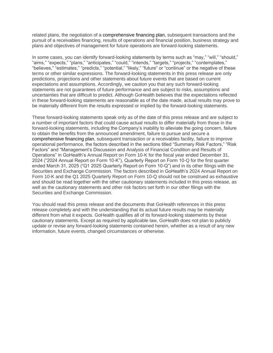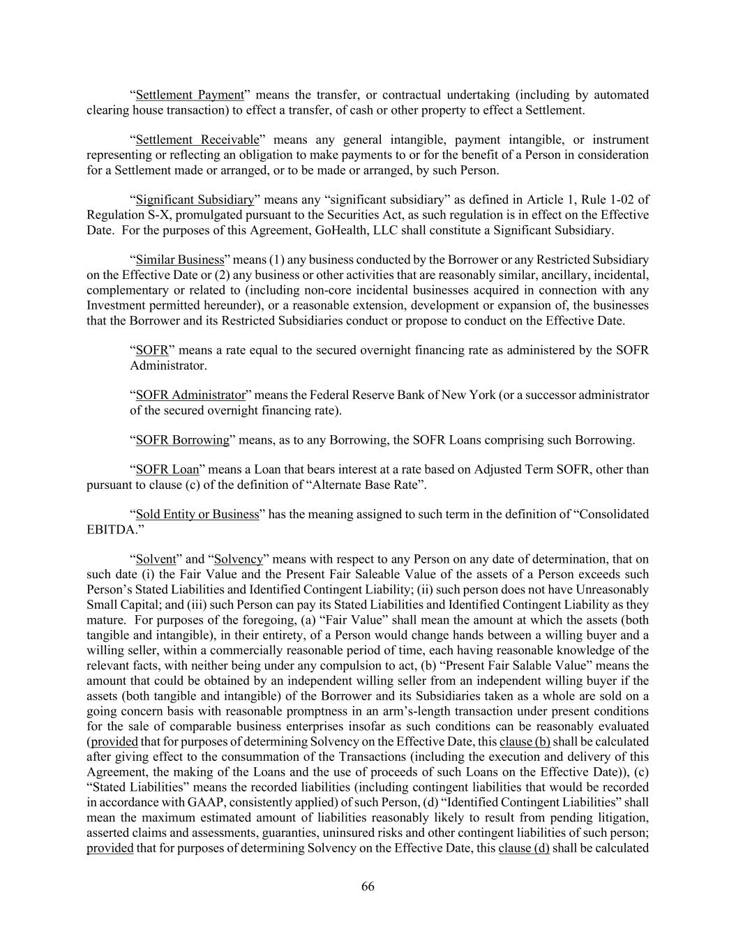 66 “Settlement Payment” means the transfer, or contractual undertaking (including by automated clearing house transaction) to effect a transfer, of cash or other property to effect a Settlement. “Settlement Receivable” means any general intangible, payment intangible, or instrument representing or reflecting an obligation to make payments to or for the benefit of a Person in consideration for a Settlement made or arranged, or to be made or arranged, by such Person. “Significant Subsidiary” means any “significant subsidiary” as defined in Article 1, Rule 1-02 of Regulation S-X, promulgated pursuant to the Securities Act, as such regulation is in effect on the Effective Date. For the purposes of this Agreement, GoHealth, LLC shall constitute a Significant Subsidiary. “Similar Business” means (1) any business conducted by the Borrower or any Restricted Subsidiary on the Effective Date or (2) any business or other activities that are reasonably similar, ancillary, incidental, complementary or related to (including non-core incidental businesses acquired in connection with any Investment permitted hereunder), or a reasonable extension, development or expansion of, the businesses that the Borrower and its Restricted Subsidiaries conduct or propose to conduct on the Effective Date. “SOFR” means a rate equal to the secured overnight financing rate as administered by the SOFR Administrator. “SOFR Administrator” means the Federal Reserve Bank of New York (or a successor administrator of the secured overnight financing rate). “SOFR Borrowing” means, as to any Borrowing, the SOFR Loans comprising such Borrowing. “SOFR Loan” means a Loan that bears interest at a rate based on Adjusted Term SOFR, other than pursuant to clause (c) of the definition of “Alternate Base Rate”. “Sold Entity or Business” has the meaning assigned to such term in the definition of “Consolidated EBITDA.” “Solvent” and “Solvency” means with respect to any Person on any date of determination, that on such date (i) the Fair Value and the Present Fair Saleable Value of the assets of a Person exceeds such Person’s Stated Liabilities and Identified Contingent Liability; (ii) such person does not have Unreasonably Small Capital; and (iii) such Person can pay its Stated Liabilities and Identified Contingent Liability as they mature. For purposes of the foregoing, (a) “Fair Value” shall mean the amount at which the assets (both tangible and intangible), in their entirety, of a Person would change hands between a willing buyer and a willing seller, within a commercially reasonable period of time, each having reasonable knowledge of the relevant facts, with neither being under any compulsion to act, (b) “Present Fair Salable Value” means the amount that could be obtained by an independent willing seller from an independent willing buyer if the assets (both tangible and intangible) of the Borrower and its Subsidiaries taken as a whole are sold on a going concern basis with reasonable promptness in an arm’s-length transaction under present conditions for the sale of comparable business enterprises insofar as such conditions can be reasonably evaluated (provided that for purposes of determining Solvency on the Effective Date, this clause (b) shall be calculated after giving effect to the consummation of the Transactions (including the execution and delivery of this Agreement, the making of the Loans and the use of proceeds of such Loans on the Effective Date)), (c) “Stated Liabilities” means the recorded liabilities (including contingent liabilities that would be recorded in accordance with GAAP, consistently applied) of such Person, (d) “Identified Contingent Liabilities” shall mean the maximum estimated amount of liabilities reasonably likely to result from pending litigation, asserted claims and assessments, guaranties, uninsured risks and other contingent liabilities of such person; provided that for purposes of determining Solvency on the Effective Date, this clause (d) shall be calculated