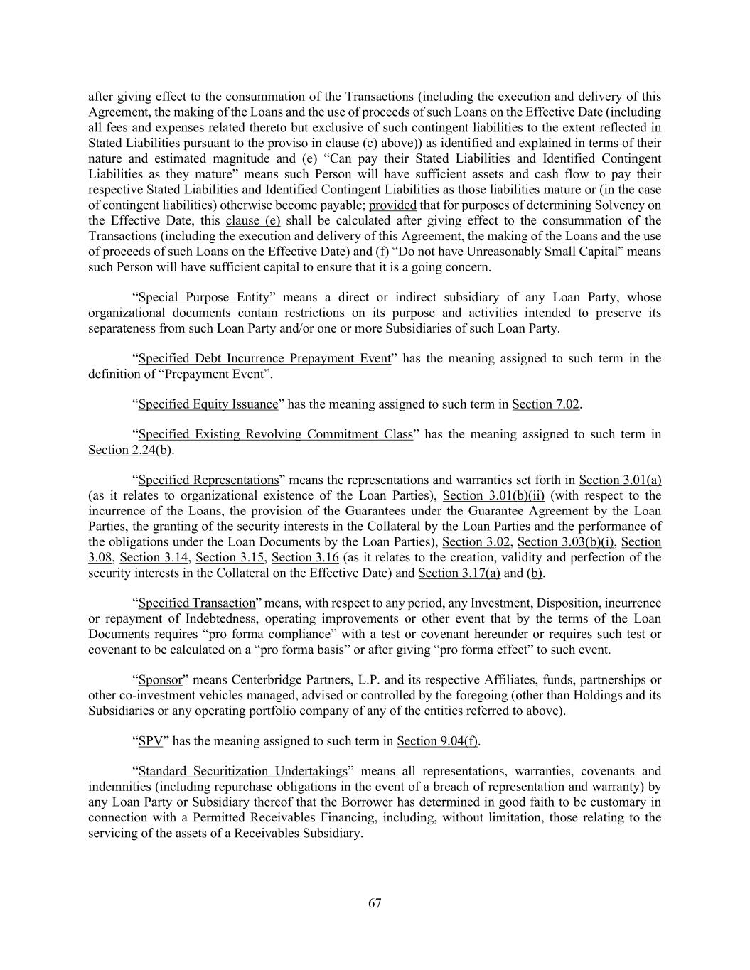67 after giving effect to the consummation of the Transactions (including the execution and delivery of this Agreement, the making of the Loans and the use of proceeds of such Loans on the Effective Date (including all fees and expenses related thereto but exclusive of such contingent liabilities to the extent reflected in Stated Liabilities pursuant to the proviso in clause (c) above)) as identified and explained in terms of their nature and estimated magnitude and (e) “Can pay their Stated Liabilities and Identified Contingent Liabilities as they mature” means such Person will have sufficient assets and cash flow to pay their respective Stated Liabilities and Identified Contingent Liabilities as those liabilities mature or (in the case of contingent liabilities) otherwise become payable; provided that for purposes of determining Solvency on the Effective Date, this clause (e) shall be calculated after giving effect to the consummation of the Transactions (including the execution and delivery of this Agreement, the making of the Loans and the use of proceeds of such Loans on the Effective Date) and (f) “Do not have Unreasonably Small Capital” means such Person will have sufficient capital to ensure that it is a going concern. “Special Purpose Entity” means a direct or indirect subsidiary of any Loan Party, whose organizational documents contain restrictions on its purpose and activities intended to preserve its separateness from such Loan Party and/or one or more Subsidiaries of such Loan Party. “Specified Debt Incurrence Prepayment Event” has the meaning assigned to such term in the definition of “Prepayment Event”. “Specified Equity Issuance” has the meaning assigned to such term in Section 7.02. “Specified Existing Revolving Commitment Class” has the meaning assigned to such term in Section 2.24(b). “Specified Representations” means the representations and warranties set forth in Section 3.01(a) (as it relates to organizational existence of the Loan Parties), Section 3.01(b)(ii) (with respect to the incurrence of the Loans, the provision of the Guarantees under the Guarantee Agreement by the Loan Parties, the granting of the security interests in the Collateral by the Loan Parties and the performance of the obligations under the Loan Documents by the Loan Parties), Section 3.02, Section 3.03(b)(i), Section 3.08, Section 3.14, Section 3.15, Section 3.16 (as it relates to the creation, validity and perfection of the security interests in the Collateral on the Effective Date) and Section 3.17(a) and (b). “Specified Transaction” means, with respect to any period, any Investment, Disposition, incurrence or repayment of Indebtedness, operating improvements or other event that by the terms of the Loan Documents requires “pro forma compliance” with a test or covenant hereunder or requires such test or covenant to be calculated on a “pro forma basis” or after giving “pro forma effect” to such event. “Sponsor” means Centerbridge Partners, L.P. and its respective Affiliates, funds, partnerships or other co-investment vehicles managed, advised or controlled by the foregoing (other than Holdings and its Subsidiaries or any operating portfolio company of any of the entities referred to above). “SPV” has the meaning assigned to such term in Section 9.04(f). “Standard Securitization Undertakings” means all representations, warranties, covenants and indemnities (including repurchase obligations in the event of a breach of representation and warranty) by any Loan Party or Subsidiary thereof that the Borrower has determined in good faith to be customary in connection with a Permitted Receivables Financing, including, without limitation, those relating to the servicing of the assets of a Receivables Subsidiary.