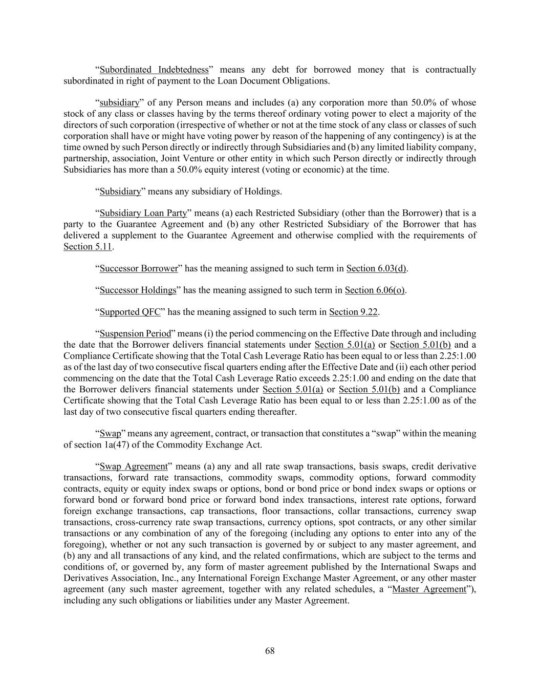 68 “Subordinated Indebtedness” means any debt for borrowed money that is contractually subordinated in right of payment to the Loan Document Obligations. “subsidiary” of any Person means and includes (a) any corporation more than 50.0% of whose stock of any class or classes having by the terms thereof ordinary voting power to elect a majority of the directors of such corporation (irrespective of whether or not at the time stock of any class or classes of such corporation shall have or might have voting power by reason of the happening of any contingency) is at the time owned by such Person directly or indirectly through Subsidiaries and (b) any limited liability company, partnership, association, Joint Venture or other entity in which such Person directly or indirectly through Subsidiaries has more than a 50.0% equity interest (voting or economic) at the time. “Subsidiary” means any subsidiary of Holdings. “Subsidiary Loan Party” means (a) each Restricted Subsidiary (other than the Borrower) that is a party to the Guarantee Agreement and (b) any other Restricted Subsidiary of the Borrower that has delivered a supplement to the Guarantee Agreement and otherwise complied with the requirements of Section 5.11. “Successor Borrower” has the meaning assigned to such term in Section 6.03(d). “Successor Holdings” has the meaning assigned to such term in Section 6.06(o). “Supported QFC” has the meaning assigned to such term in Section 9.22. “Suspension Period” means (i) the period commencing on the Effective Date through and including the date that the Borrower delivers financial statements under Section 5.01(a) or Section 5.01(b) and a Compliance Certificate showing that the Total Cash Leverage Ratio has been equal to or less than 2.25:1.00 as of the last day of two consecutive fiscal quarters ending after the Effective Date and (ii) each other period commencing on the date that the Total Cash Leverage Ratio exceeds 2.25:1.00 and ending on the date that the Borrower delivers financial statements under Section 5.01(a) or Section 5.01(b) and a Compliance Certificate showing that the Total Cash Leverage Ratio has been equal to or less than 2.25:1.00 as of the last day of two consecutive fiscal quarters ending thereafter. “Swap” means any agreement, contract, or transaction that constitutes a “swap” within the meaning of section 1a(47) of the Commodity Exchange Act. “Swap Agreement” means (a) any and all rate swap transactions, basis swaps, credit derivative transactions, forward rate transactions, commodity swaps, commodity options, forward commodity contracts, equity or equity index swaps or options, bond or bond price or bond index swaps or options or forward bond or forward bond price or forward bond index transactions, interest rate options, forward foreign exchange transactions, cap transactions, floor transactions, collar transactions, currency swap transactions, cross-currency rate swap transactions, currency options, spot contracts, or any other similar transactions or any combination of any of the foregoing (including any options to enter into any of the foregoing), whether or not any such transaction is governed by or subject to any master agreement, and (b) any and all transactions of any kind, and the related confirmations, which are subject to the terms and conditions of, or governed by, any form of master agreement published by the International Swaps and Derivatives Association, Inc., any International Foreign Exchange Master Agreement, or any other master agreement (any such master agreement, together with any related schedules, a “Master Agreement”), including any such obligations or liabilities under any Master Agreement.