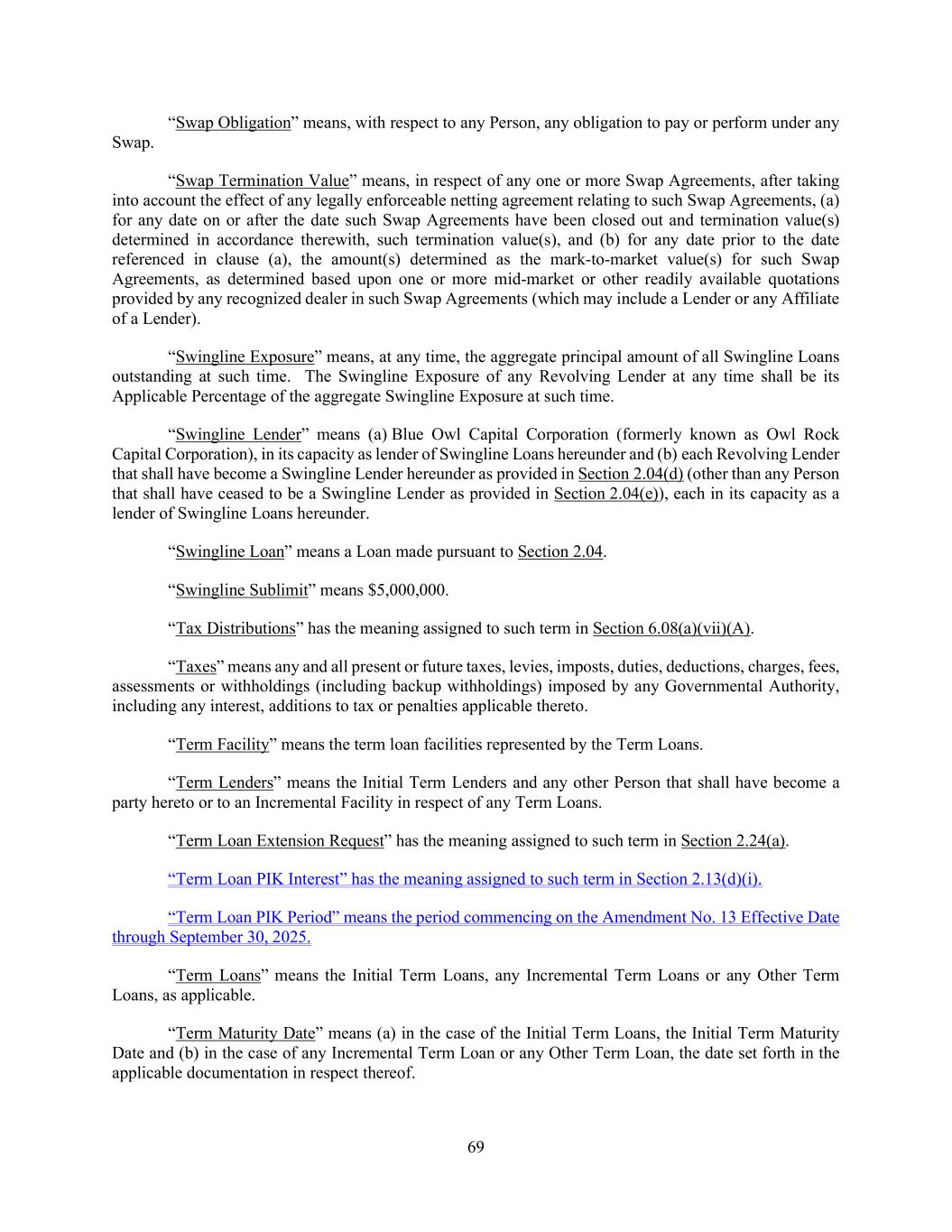 69 “Swap Obligation” means, with respect to any Person, any obligation to pay or perform under any Swap. “Swap Termination Value” means, in respect of any one or more Swap Agreements, after taking into account the effect of any legally enforceable netting agreement relating to such Swap Agreements, (a) for any date on or after the date such Swap Agreements have been closed out and termination value(s) determined in accordance therewith, such termination value(s), and (b) for any date prior to the date referenced in clause (a), the amount(s) determined as the mark-to-market value(s) for such Swap Agreements, as determined based upon one or more mid-market or other readily available quotations provided by any recognized dealer in such Swap Agreements (which may include a Lender or any Affiliate of a Lender). “Swingline Exposure” means, at any time, the aggregate principal amount of all Swingline Loans outstanding at such time. The Swingline Exposure of any Revolving Lender at any time shall be its Applicable Percentage of the aggregate Swingline Exposure at such time. “Swingline Lender” means (a) Blue Owl Capital Corporation (formerly known as Owl Rock Capital Corporation), in its capacity as lender of Swingline Loans hereunder and (b) each Revolving Lender that shall have become a Swingline Lender hereunder as provided in Section 2.04(d) (other than any Person that shall have ceased to be a Swingline Lender as provided in Section 2.04(e)), each in its capacity as a lender of Swingline Loans hereunder. “Swingline Loan” means a Loan made pursuant to Section 2.04. “Swingline Sublimit” means $5,000,000. “Tax Distributions” has the meaning assigned to such term in Section 6.08(a)(vii)(A). “Taxes” means any and all present or future taxes, levies, imposts, duties, deductions, charges, fees, assessments or withholdings (including backup withholdings) imposed by any Governmental Authority, including any interest, additions to tax or penalties applicable thereto. “Term Facility” means the term loan facilities represented by the Term Loans. “Term Lenders” means the Initial Term Lenders and any other Person that shall have become a party hereto or to an Incremental Facility in respect of any Term Loans. “Term Loan Extension Request” has the meaning assigned to such term in Section 2.24(a). “Term Loan PIK Interest” has the meaning assigned to such term in Section 2.13(d)(i). “Term Loan PIK Period” means the period commencing on the Amendment No. 13 Effective Date through September 30, 2025. “Term Loans” means the Initial Term Loans, any Incremental Term Loans or any Other Term Loans, as applicable. “Term Maturity Date” means (a) in the case of the Initial Term Loans, the Initial Term Maturity Date and (b) in the case of any Incremental Term Loan or any Other Term Loan, the date set forth in the applicable documentation in respect thereof.