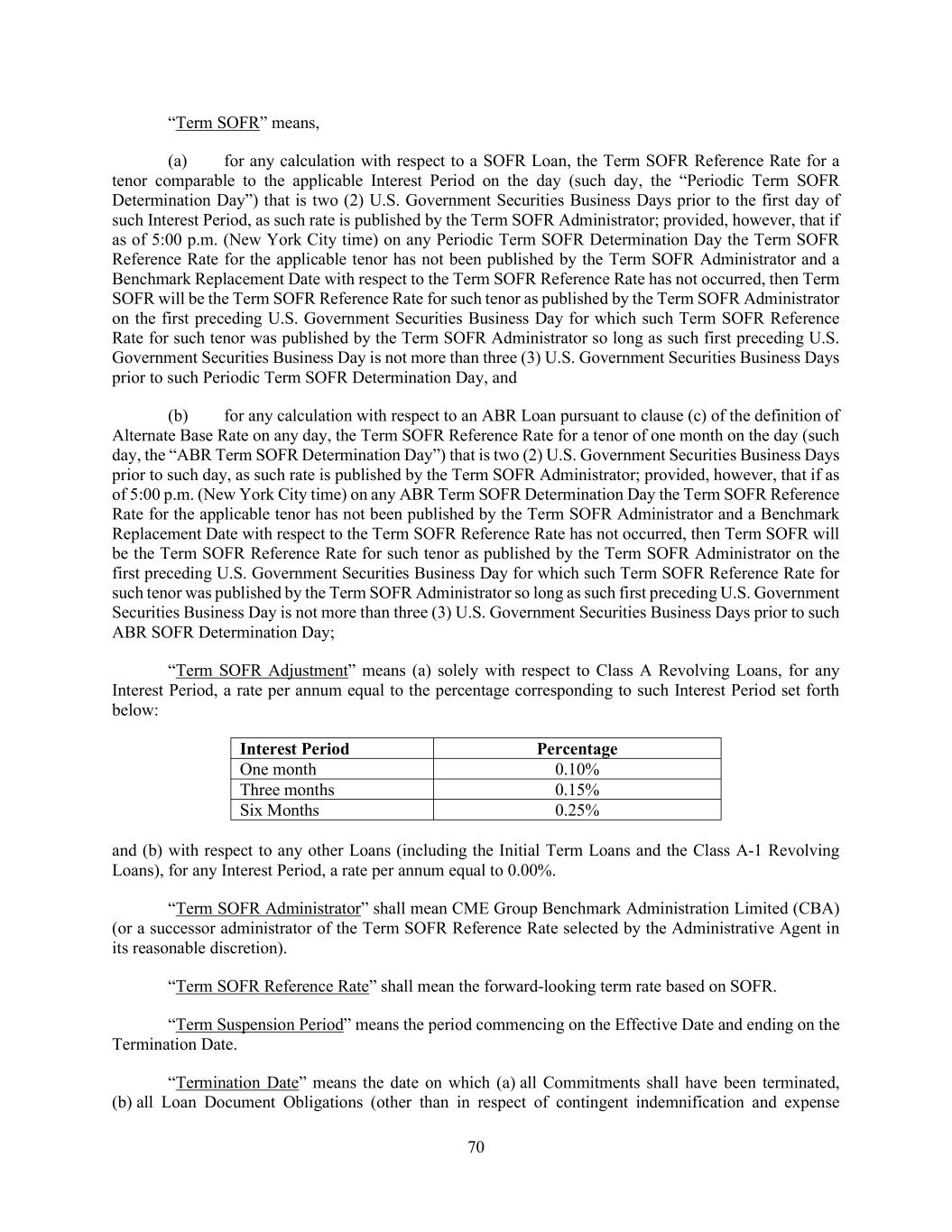 70 “Term SOFR” means, (a) for any calculation with respect to a SOFR Loan, the Term SOFR Reference Rate for a tenor comparable to the applicable Interest Period on the day (such day, the “Periodic Term SOFR Determination Day”) that is two (2) U.S. Government Securities Business Days prior to the first day of such Interest Period, as such rate is published by the Term SOFR Administrator; provided, however, that if as of 5:00 p.m. (New York City time) on any Periodic Term SOFR Determination Day the Term SOFR Reference Rate for the applicable tenor has not been published by the Term SOFR Administrator and a Benchmark Replacement Date with respect to the Term SOFR Reference Rate has not occurred, then Term SOFR will be the Term SOFR Reference Rate for such tenor as published by the Term SOFR Administrator on the first preceding U.S. Government Securities Business Day for which such Term SOFR Reference Rate for such tenor was published by the Term SOFR Administrator so long as such first preceding U.S. Government Securities Business Day is not more than three (3) U.S. Government Securities Business Days prior to such Periodic Term SOFR Determination Day, and (b) for any calculation with respect to an ABR Loan pursuant to clause (c) of the definition of Alternate Base Rate on any day, the Term SOFR Reference Rate for a tenor of one month on the day (such day, the “ABR Term SOFR Determination Day”) that is two (2) U.S. Government Securities Business Days prior to such day, as such rate is published by the Term SOFR Administrator; provided, however, that if as of 5:00 p.m. (New York City time) on any ABR Term SOFR Determination Day the Term SOFR Reference Rate for the applicable tenor has not been published by the Term SOFR Administrator and a Benchmark Replacement Date with respect to the Term SOFR Reference Rate has not occurred, then Term SOFR will be the Term SOFR Reference Rate for such tenor as published by the Term SOFR Administrator on the first preceding U.S. Government Securities Business Day for which such Term SOFR Reference Rate for such tenor was published by the Term SOFR Administrator so long as such first preceding U.S. Government Securities Business Day is not more than three (3) U.S. Government Securities Business Days prior to such ABR SOFR Determination Day; “Term SOFR Adjustment” means (a) solely with respect to Class A Revolving Loans, for any Interest Period, a rate per annum equal to the percentage corresponding to such Interest Period set forth below: Interest Period Percentage One month 0.10% Three months 0.15% Six Months 0.25% and (b) with respect to any other Loans (including the Initial Term Loans and the Class A-1 Revolving Loans), for any Interest Period, a rate per annum equal to 0.00%. “Term SOFR Administrator” shall mean CME Group Benchmark Administration Limited (CBA) (or a successor administrator of the Term SOFR Reference Rate selected by the Administrative Agent in its reasonable discretion). “Term SOFR Reference Rate” shall mean the forward-looking term rate based on SOFR. “Term Suspension Period” means the period commencing on the Effective Date and ending on the Termination Date. “Termination Date” means the date on which (a) all Commitments shall have been terminated, (b) all Loan Document Obligations (other than in respect of contingent indemnification and expense