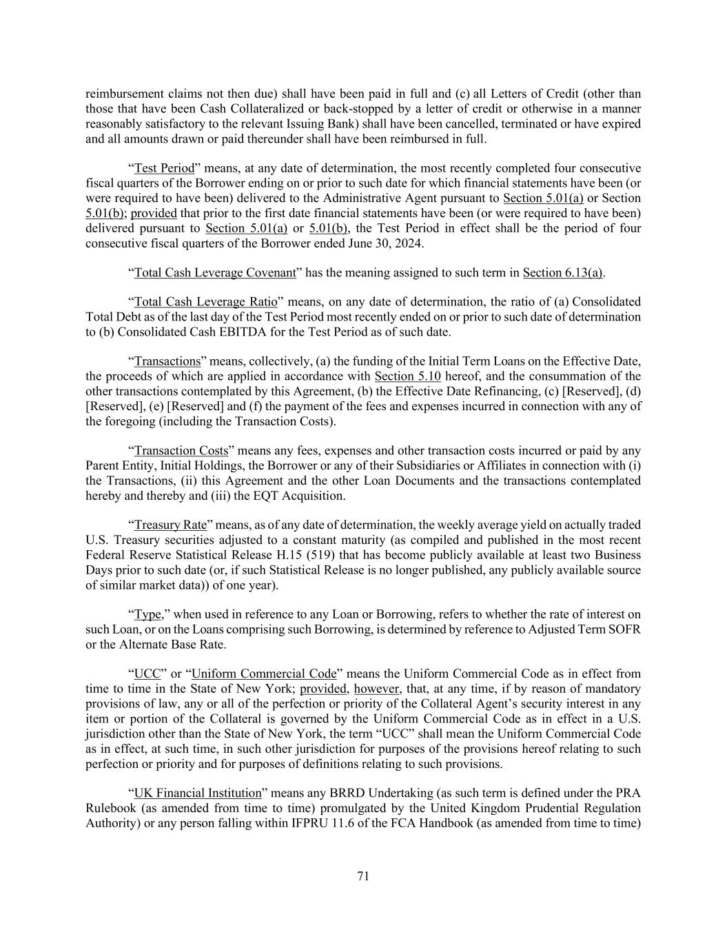 71 reimbursement claims not then due) shall have been paid in full and (c) all Letters of Credit (other than those that have been Cash Collateralized or back-stopped by a letter of credit or otherwise in a manner reasonably satisfactory to the relevant Issuing Bank) shall have been cancelled, terminated or have expired and all amounts drawn or paid thereunder shall have been reimbursed in full. “Test Period” means, at any date of determination, the most recently completed four consecutive fiscal quarters of the Borrower ending on or prior to such date for which financial statements have been (or were required to have been) delivered to the Administrative Agent pursuant to Section 5.01(a) or Section 5.01(b); provided that prior to the first date financial statements have been (or were required to have been) delivered pursuant to Section 5.01(a) or 5.01(b), the Test Period in effect shall be the period of four consecutive fiscal quarters of the Borrower ended June 30, 2024. “Total Cash Leverage Covenant” has the meaning assigned to such term in Section 6.13(a). “Total Cash Leverage Ratio” means, on any date of determination, the ratio of (a) Consolidated Total Debt as of the last day of the Test Period most recently ended on or prior to such date of determination to (b) Consolidated Cash EBITDA for the Test Period as of such date. “Transactions” means, collectively, (a) the funding of the Initial Term Loans on the Effective Date, the proceeds of which are applied in accordance with Section 5.10 hereof, and the consummation of the other transactions contemplated by this Agreement, (b) the Effective Date Refinancing, (c) [Reserved], (d) [Reserved], (e) [Reserved] and (f) the payment of the fees and expenses incurred in connection with any of the foregoing (including the Transaction Costs). “Transaction Costs” means any fees, expenses and other transaction costs incurred or paid by any Parent Entity, Initial Holdings, the Borrower or any of their Subsidiaries or Affiliates in connection with (i) the Transactions, (ii) this Agreement and the other Loan Documents and the transactions contemplated hereby and thereby and (iii) the EQT Acquisition. “Treasury Rate” means, as of any date of determination, the weekly average yield on actually traded U.S. Treasury securities adjusted to a constant maturity (as compiled and published in the most recent Federal Reserve Statistical Release H.15 (519) that has become publicly available at least two Business Days prior to such date (or, if such Statistical Release is no longer published, any publicly available source of similar market data)) of one year). “Type,” when used in reference to any Loan or Borrowing, refers to whether the rate of interest on such Loan, or on the Loans comprising such Borrowing, is determined by reference to Adjusted Term SOFR or the Alternate Base Rate. “UCC” or “Uniform Commercial Code” means the Uniform Commercial Code as in effect from time to time in the State of New York; provided, however, that, at any time, if by reason of mandatory provisions of law, any or all of the perfection or priority of the Collateral Agent’s security interest in any item or portion of the Collateral is governed by the Uniform Commercial Code as in effect in a U.S. jurisdiction other than the State of New York, the term “UCC” shall mean the Uniform Commercial Code as in effect, at such time, in such other jurisdiction for purposes of the provisions hereof relating to such perfection or priority and for purposes of definitions relating to such provisions. “UK Financial Institution” means any BRRD Undertaking (as such term is defined under the PRA Rulebook (as amended from time to time) promulgated by the United Kingdom Prudential Regulation Authority) or any person falling within IFPRU 11.6 of the FCA Handbook (as amended from time to time)