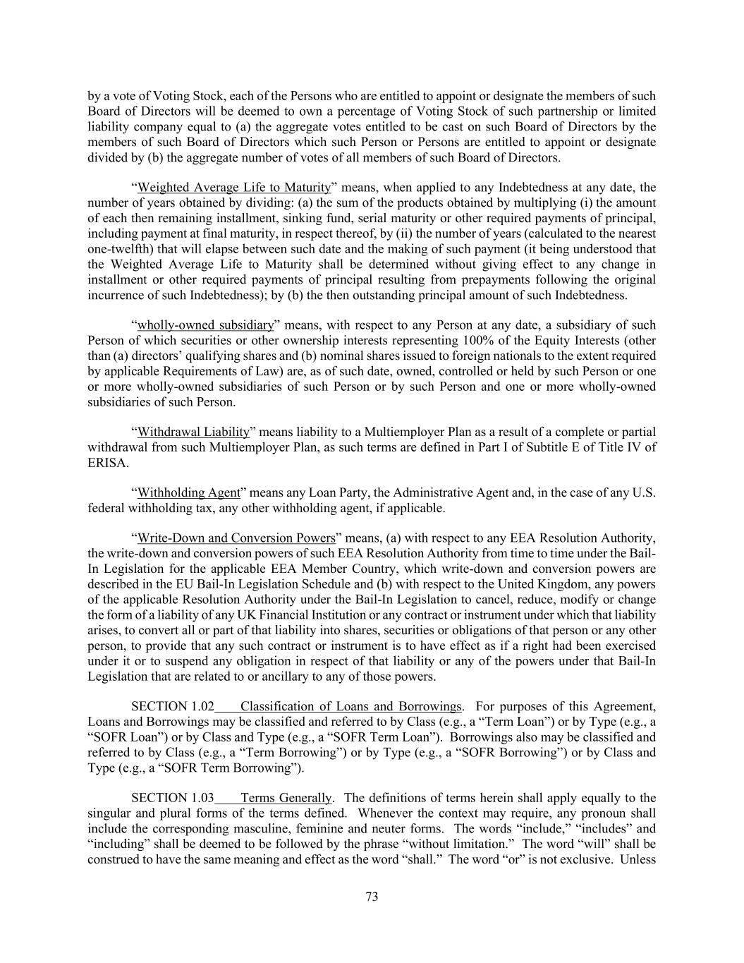 73 by a vote of Voting Stock, each of the Persons who are entitled to appoint or designate the members of such Board of Directors will be deemed to own a percentage of Voting Stock of such partnership or limited liability company equal to (a) the aggregate votes entitled to be cast on such Board of Directors by the members of such Board of Directors which such Person or Persons are entitled to appoint or designate divided by (b) the aggregate number of votes of all members of such Board of Directors. “Weighted Average Life to Maturity” means, when applied to any Indebtedness at any date, the number of years obtained by dividing: (a) the sum of the products obtained by multiplying (i) the amount of each then remaining installment, sinking fund, serial maturity or other required payments of principal, including payment at final maturity, in respect thereof, by (ii) the number of years (calculated to the nearest one-twelfth) that will elapse between such date and the making of such payment (it being understood that the Weighted Average Life to Maturity shall be determined without giving effect to any change in installment or other required payments of principal resulting from prepayments following the original incurrence of such Indebtedness); by (b) the then outstanding principal amount of such Indebtedness. “wholly-owned subsidiary” means, with respect to any Person at any date, a subsidiary of such Person of which securities or other ownership interests representing 100% of the Equity Interests (other than (a) directors’ qualifying shares and (b) nominal shares issued to foreign nationals to the extent required by applicable Requirements of Law) are, as of such date, owned, controlled or held by such Person or one or more wholly-owned subsidiaries of such Person or by such Person and one or more wholly-owned subsidiaries of such Person. “Withdrawal Liability” means liability to a Multiemployer Plan as a result of a complete or partial withdrawal from such Multiemployer Plan, as such terms are defined in Part I of Subtitle E of Title IV of ERISA. “Withholding Agent” means any Loan Party, the Administrative Agent and, in the case of any U.S. federal withholding tax, any other withholding agent, if applicable. “Write-Down and Conversion Powers” means, (a) with respect to any EEA Resolution Authority, the write-down and conversion powers of such EEA Resolution Authority from time to time under the Bail- In Legislation for the applicable EEA Member Country, which write-down and conversion powers are described in the EU Bail-In Legislation Schedule and (b) with respect to the United Kingdom, any powers of the applicable Resolution Authority under the Bail-In Legislation to cancel, reduce, modify or change the form of a liability of any UK Financial Institution or any contract or instrument under which that liability arises, to convert all or part of that liability into shares, securities or obligations of that person or any other person, to provide that any such contract or instrument is to have effect as if a right had been exercised under it or to suspend any obligation in respect of that liability or any of the powers under that Bail-In Legislation that are related to or ancillary to any of those powers. SECTION 1.02 Classification of Loans and Borrowings. For purposes of this Agreement, Loans and Borrowings may be classified and referred to by Class (e.g., a “Term Loan”) or by Type (e.g., a “SOFR Loan”) or by Class and Type (e.g., a “SOFR Term Loan”). Borrowings also may be classified and referred to by Class (e.g., a “Term Borrowing”) or by Type (e.g., a “SOFR Borrowing”) or by Class and Type (e.g., a “SOFR Term Borrowing”). SECTION 1.03 Terms Generally. The definitions of terms herein shall apply equally to the singular and plural forms of the terms defined. Whenever the context may require, any pronoun shall include the corresponding masculine, feminine and neuter forms. The words “include,” “includes” and “including” shall be deemed to be followed by the phrase “without limitation.” The word “will” shall be construed to have the same meaning and effect as the word “shall.” The word “or” is not exclusive. Unless