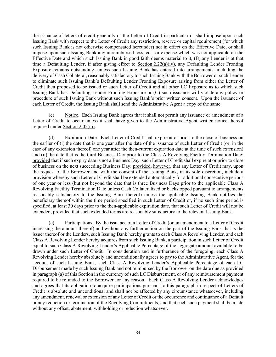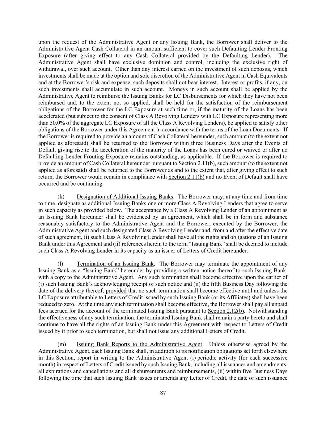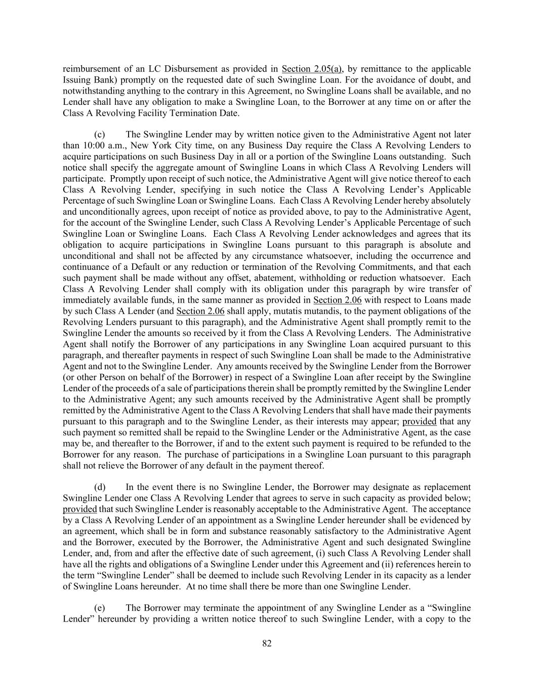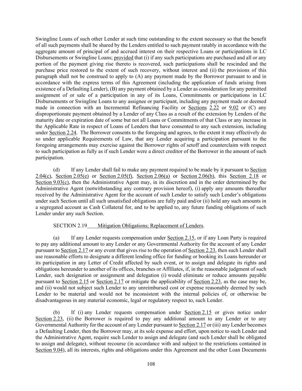 108 Swingline Loans of such other Lender at such time outstanding to the extent necessary so that the benefit of all such payments shall be shared by the Lenders entitled to such payment ratably in accordance with the aggregate amount of principal of and accrued interest on their respective Loans or participations in LC Disbursements or Swingline Loans; provided that (i) if any such participations are purchased and all or any portion of the payment giving rise thereto is recovered, such participations shall be rescinded and the purchase price restored to the extent of such recovery, without interest and (ii) the provisions of this paragraph shall not be construed to apply to (A) any payment made by the Borrower pursuant to and in accordance with the express terms of this Agreement (including the application of funds arising from existence of a Defaulting Lender), (B) any payment obtained by a Lender as consideration for any permitted assignment of or sale of a participation in any of its Loans, Commitments or participations in LC Disbursements or Swingline Loans to any assignee or participant, including any payment made or deemed made in connection with an Incremental Refinancing Facility or Sections 2.22 or 9.02 or (C) any disproportionate payment obtained by a Lender of any Class as a result of the extension by Lenders of the maturity date or expiration date of some but not all Loans or Commitments of that Class or any increase in the Applicable Rate in respect of Loans of Lenders that have consented to any such extension, including under Section 2.24. The Borrower consents to the foregoing and agrees, to the extent it may effectively do so under applicable Requirements of Law, that any Lender acquiring a participation pursuant to the foregoing arrangements may exercise against the Borrower rights of setoff and counterclaim with respect to such participation as fully as if such Lender were a direct creditor of the Borrower in the amount of such participation. (d) If any Lender shall fail to make any payment required to be made by it pursuant to Section 2.04(c), Section 2.05(e) or Section 2.05(f), Section 2.06(a) or Section 2.06(b), this Section 2.18 or Section 9.03(c), then the Administrative Agent may, in its discretion and in the order determined by the Administrative Agent (notwithstanding any contrary provision hereof), (i) apply any amounts thereafter received by the Administrative Agent for the account of such Lender to satisfy such Lender’s obligations under such Section until all such unsatisfied obligations are fully paid and/or (ii) hold any such amounts in a segregated account as Cash Collateral for, and to be applied to, any future funding obligations of such Lender under any such Section. SECTION 2.19 Mitigation Obligations; Replacement of Lenders. (a) If any Lender requests compensation under Section 2.15, or if any Loan Party is required to pay any additional amount to any Lender or any Governmental Authority for the account of any Lender pursuant to Section 2.17 or any event that gives rise to the operation of Section 2.23, then such Lender shall use reasonable efforts to designate a different lending office for funding or booking its Loans hereunder or its participation in any Letter of Credit affected by such event, or to assign and delegate its rights and obligations hereunder to another of its offices, branches or Affiliates, if, in the reasonable judgment of such Lender, such designation or assignment and delegation (i) would eliminate or reduce amounts payable pursuant to Section 2.15 or Section 2.17 or mitigate the applicability of Section 2.23, as the case may be, and (ii) would not subject such Lender to any unreimbursed cost or expense reasonably deemed by such Lender to be material and would not be inconsistent with the internal policies of, or otherwise be disadvantageous in any material economic, legal or regulatory respect to, such Lender. (b) If (i) any Lender requests compensation under Section 2.15 or gives notice under Section 2.23, (ii) the Borrower is required to pay any additional amount to any Lender or to any Governmental Authority for the account of any Lender pursuant to Section 2.17 or (iii) any Lender becomes a Defaulting Lender, then the Borrower may, at its sole expense and effort, upon notice to such Lender and the Administrative Agent, require such Lender to assign and delegate (and such Lender shall be obligated to assign and delegate), without recourse (in accordance with and subject to the restrictions contained in Section 9.04), all its interests, rights and obligations under this Agreement and the other Loan Documents